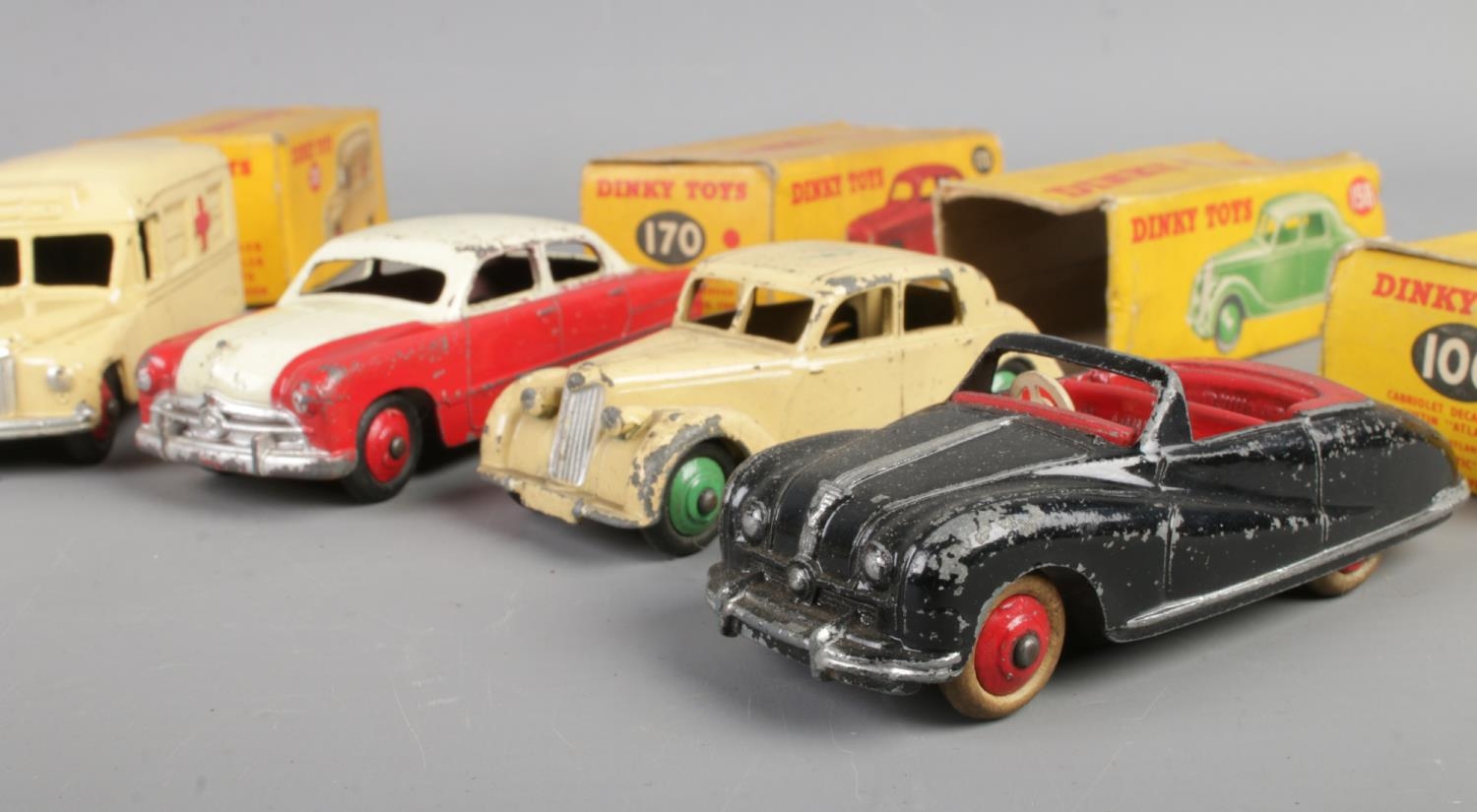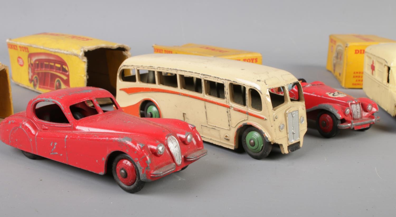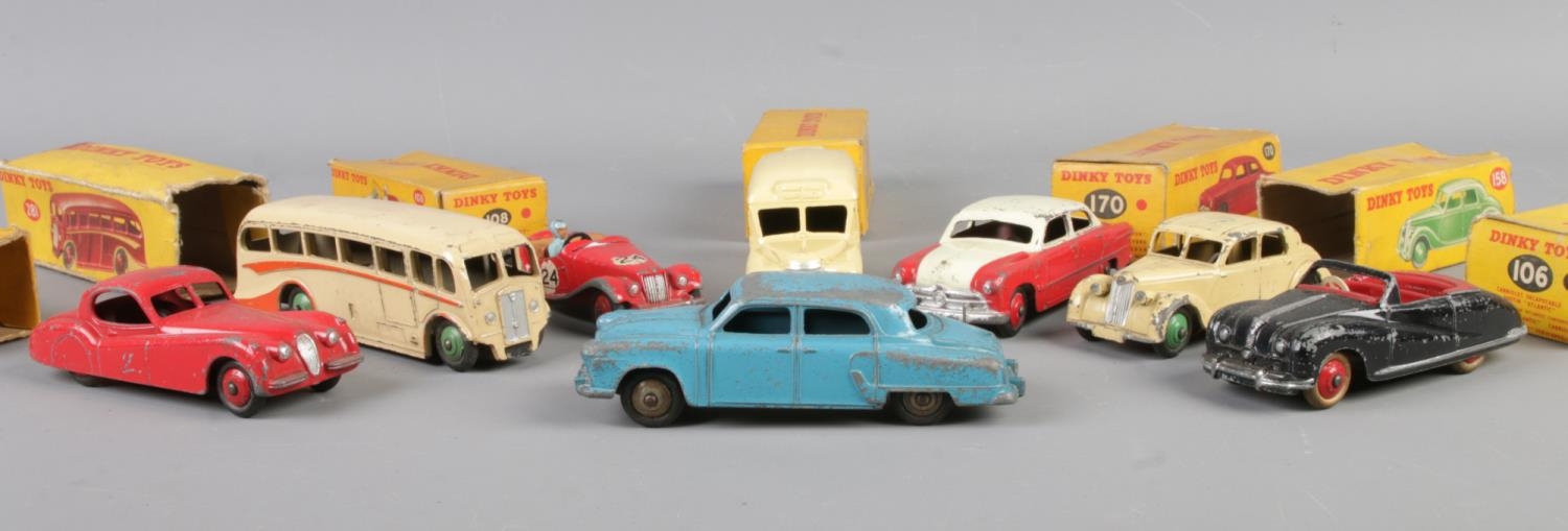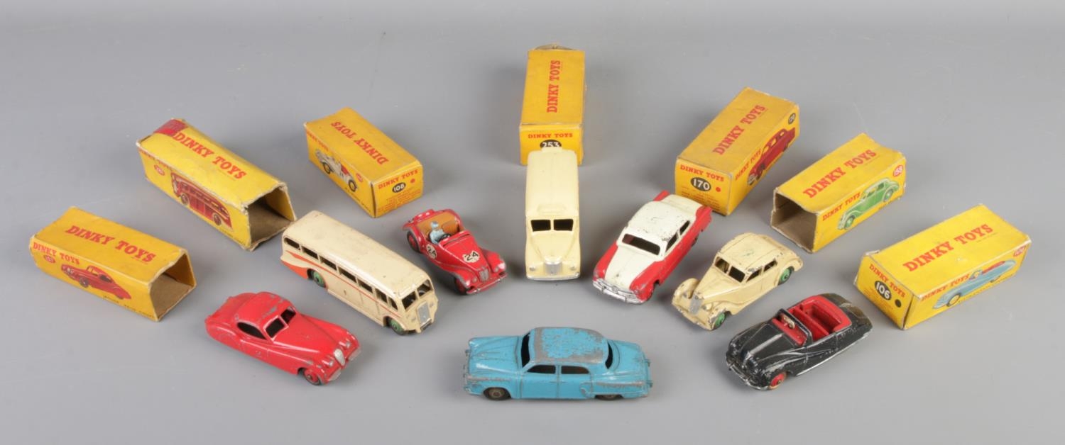 A collection of mostly boxed Dinky die-cast vehicles. To include No. 281 Luxury Coach, No. 108 Midget Sports, No. 253 Daimler Ambulance and No. 157 Jaguar XK120 Coupe.