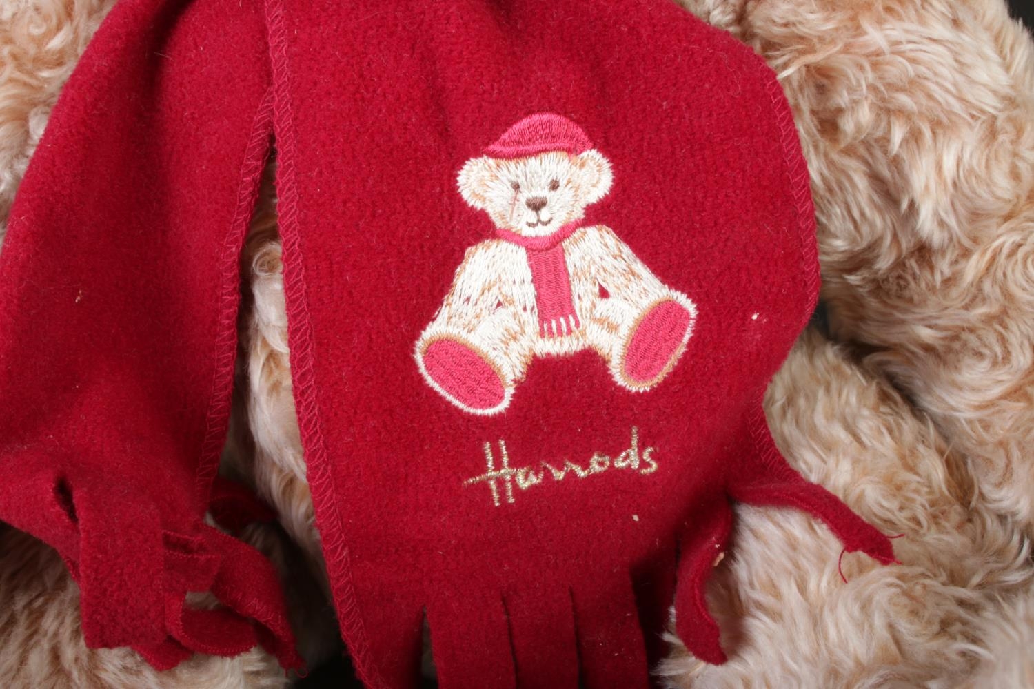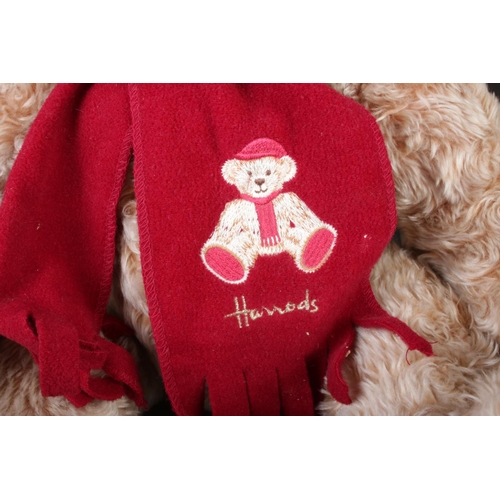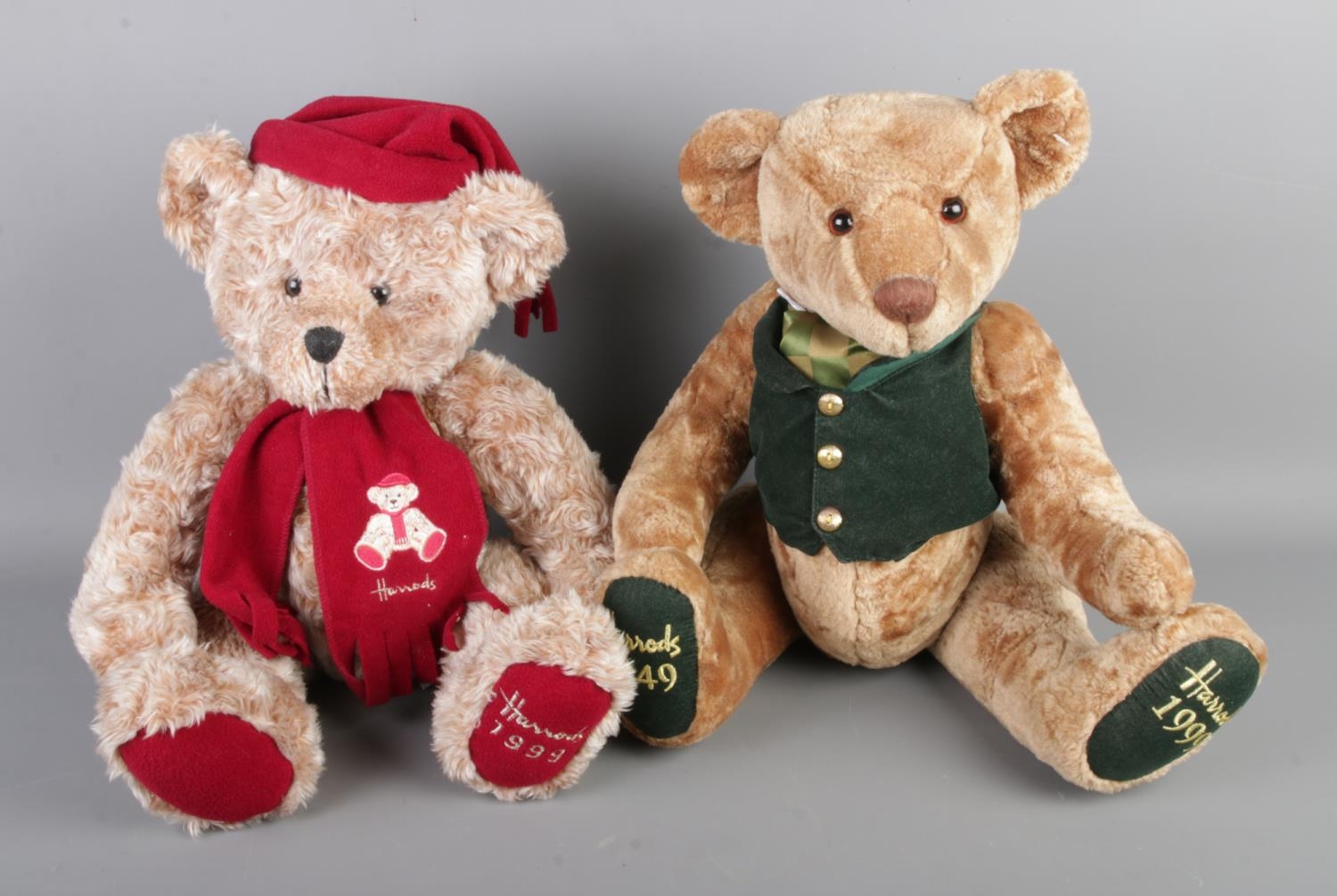 Two Harrods teddy bears to include 1849-1999 anniversary bear in green velvet waistcoat and Christmas 1999 bear in red scarf and hat.