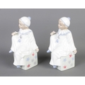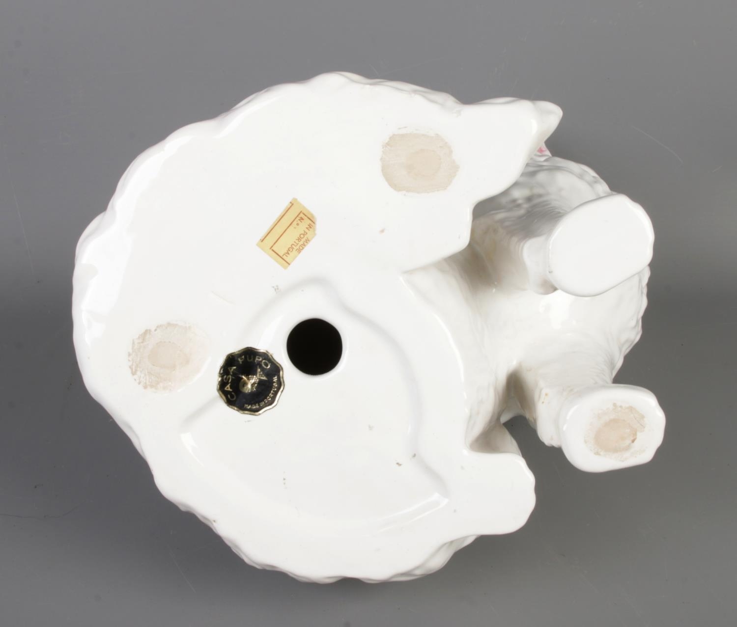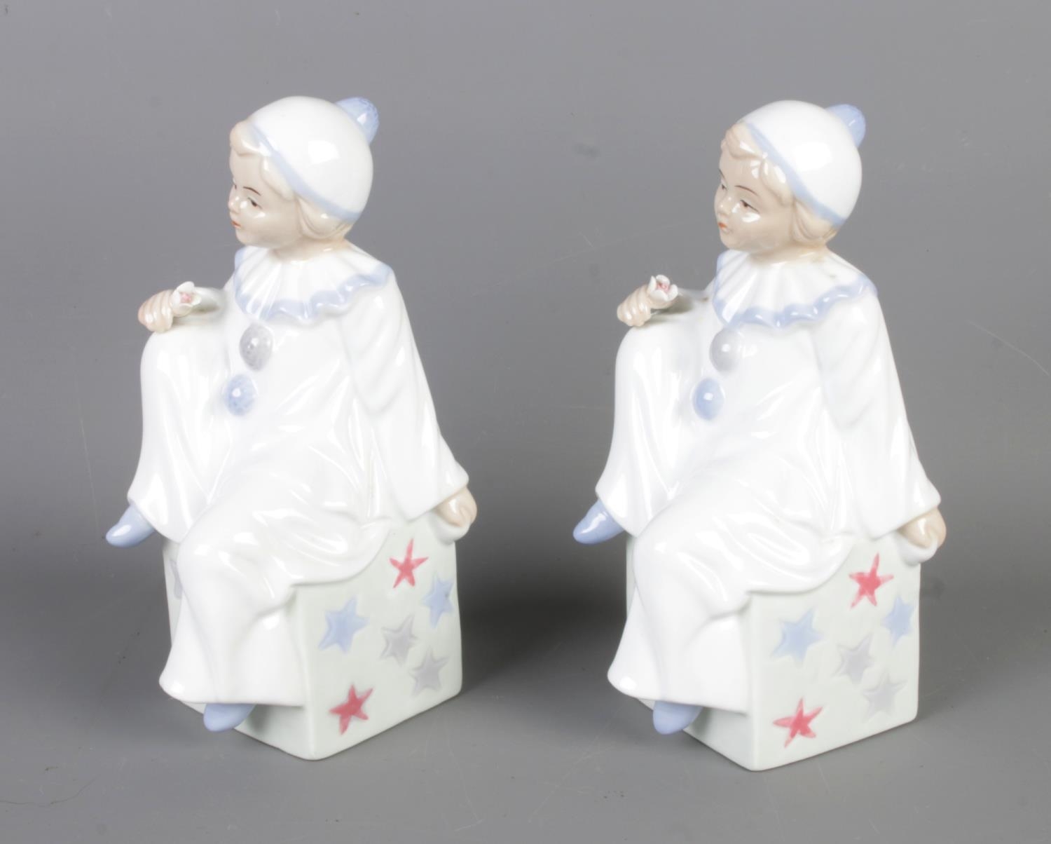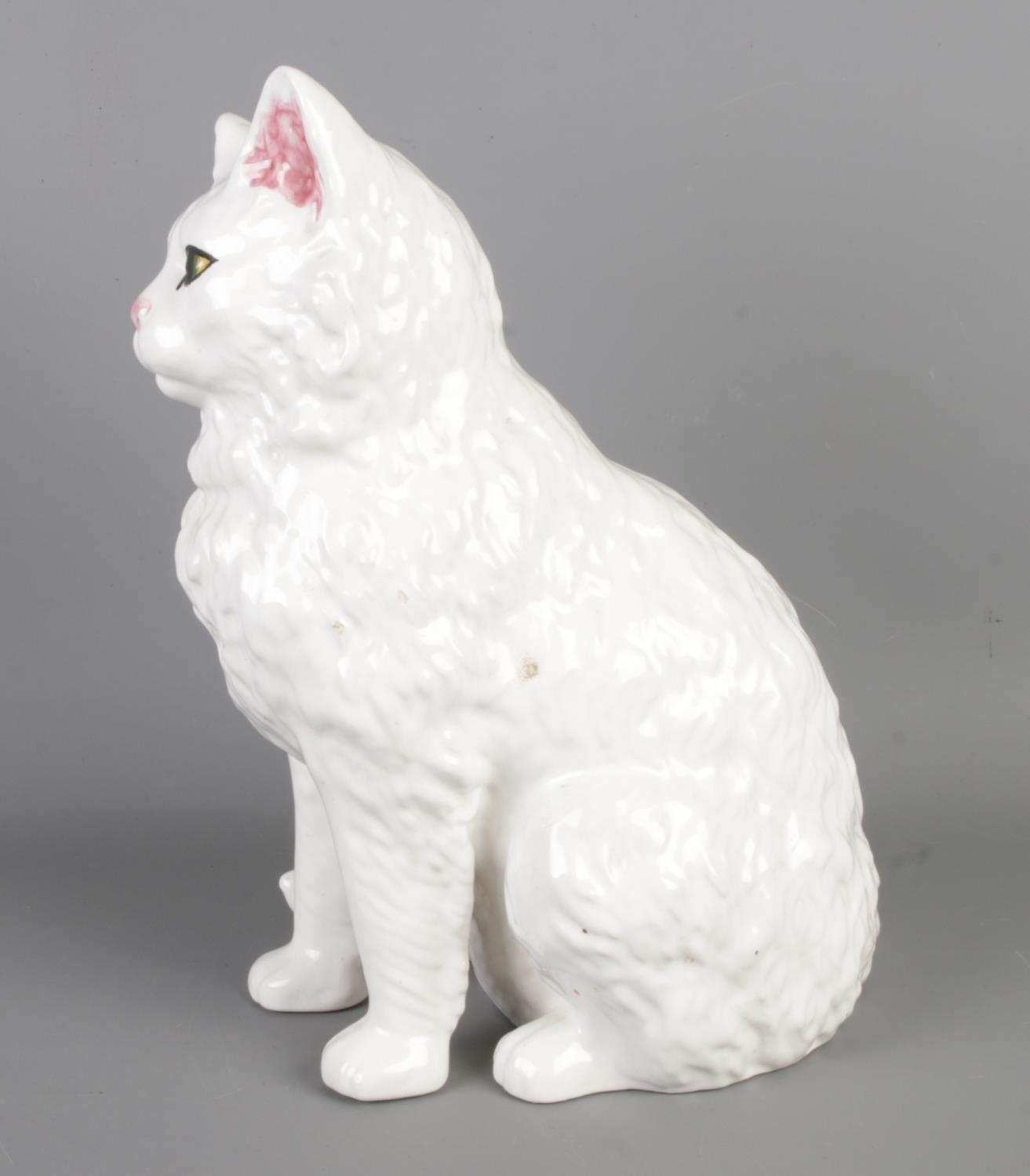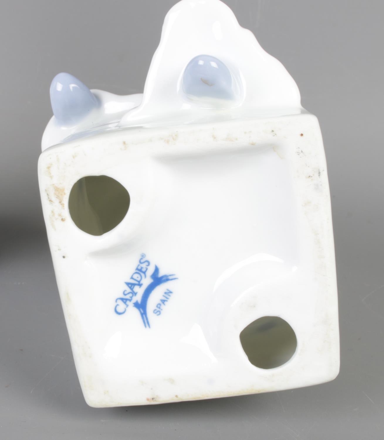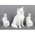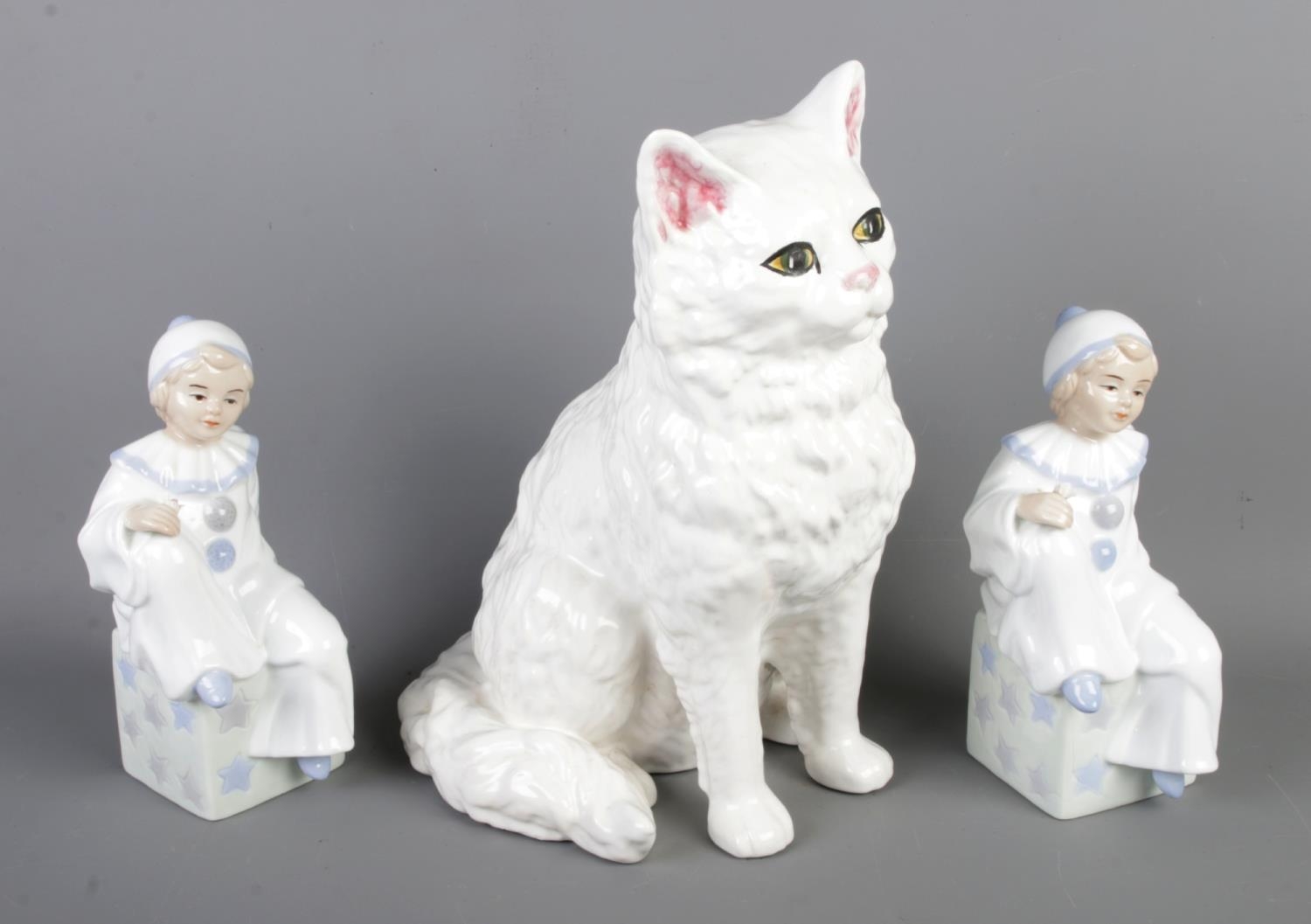 A Casa Pupo Portugal porcelain cat (H29cm) with a pair of 1990s Spanish Casades "Little Boy Clown" figurines (H20cm).