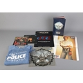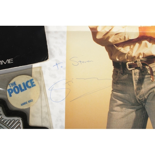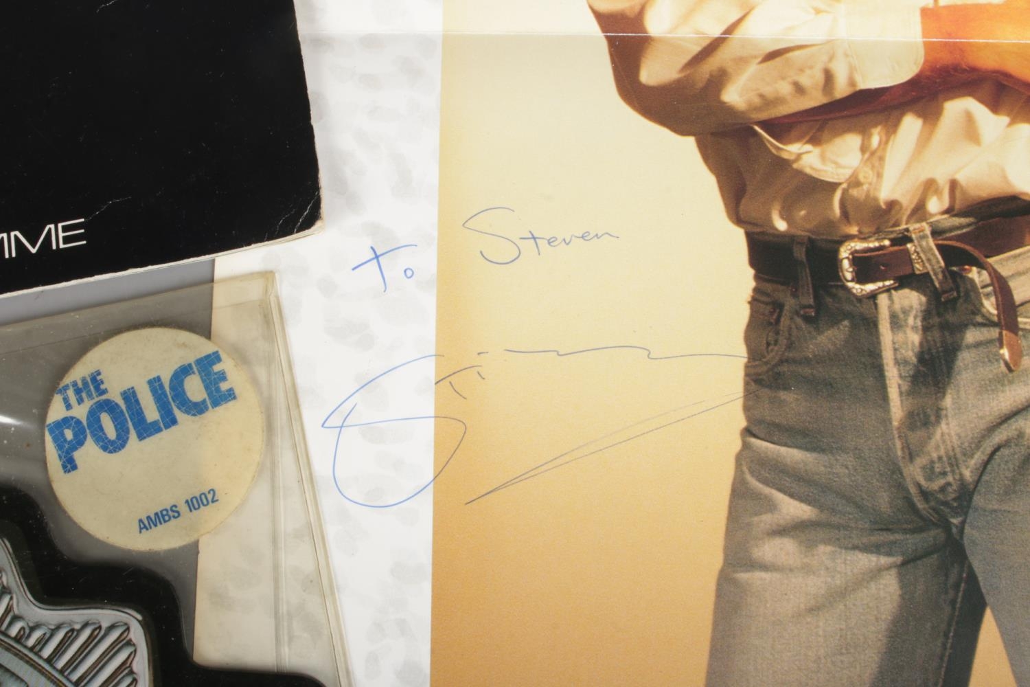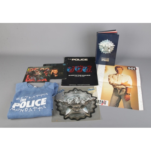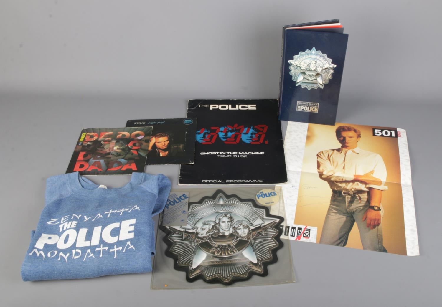 A quantity of The Police and Sting collectables to include limited edition badge picture disc, t-shirt, signed Sting poster, Message in a Box cd collection, etc.