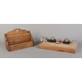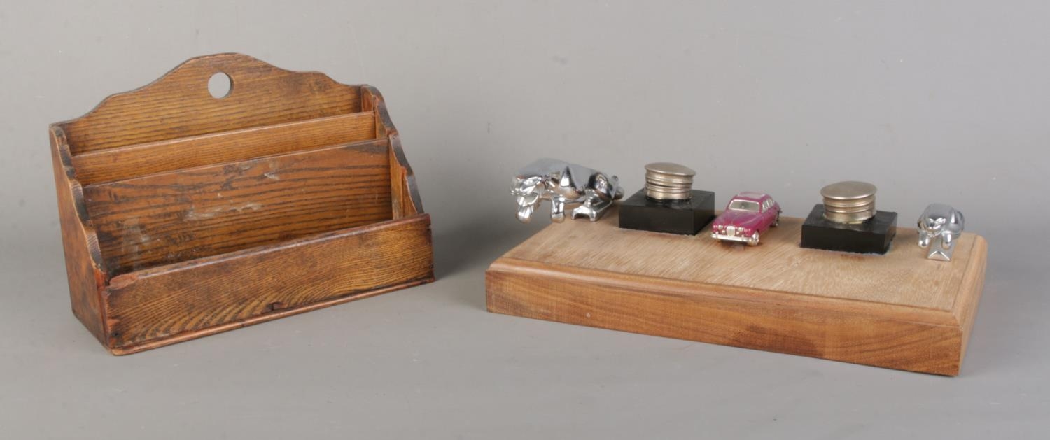A wooden desk stand, mounted with two chromed Jaguar car mascots and fitted with two inkwells and Jaguar Mk II quartz clock. Accompanied by an oak letter rack.