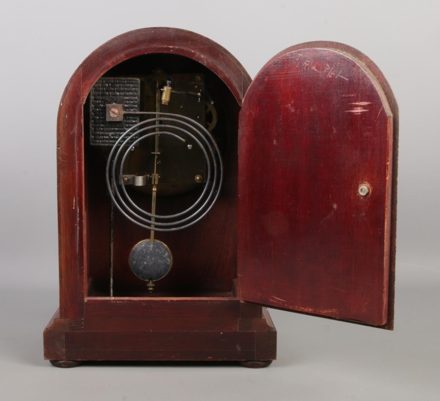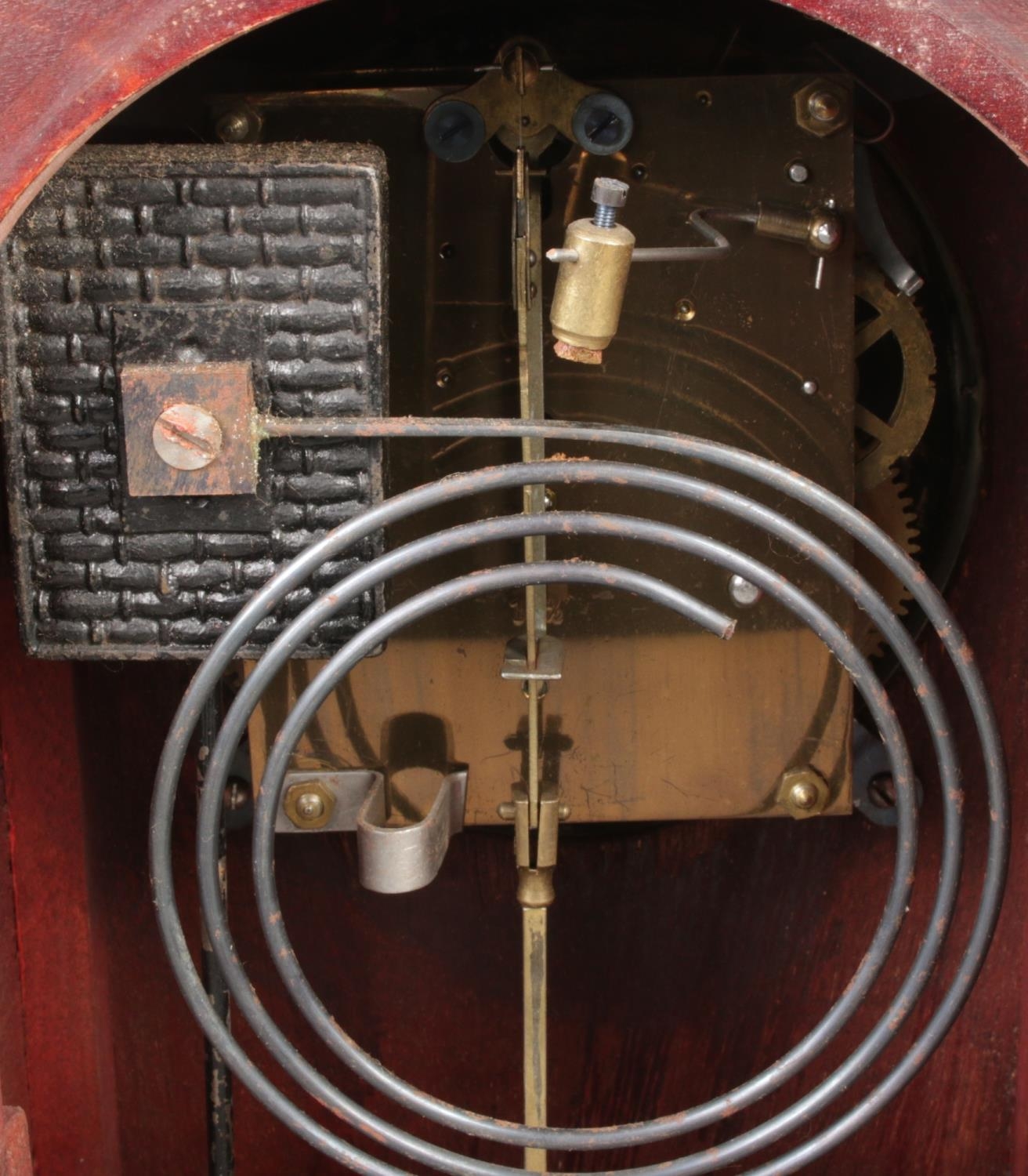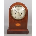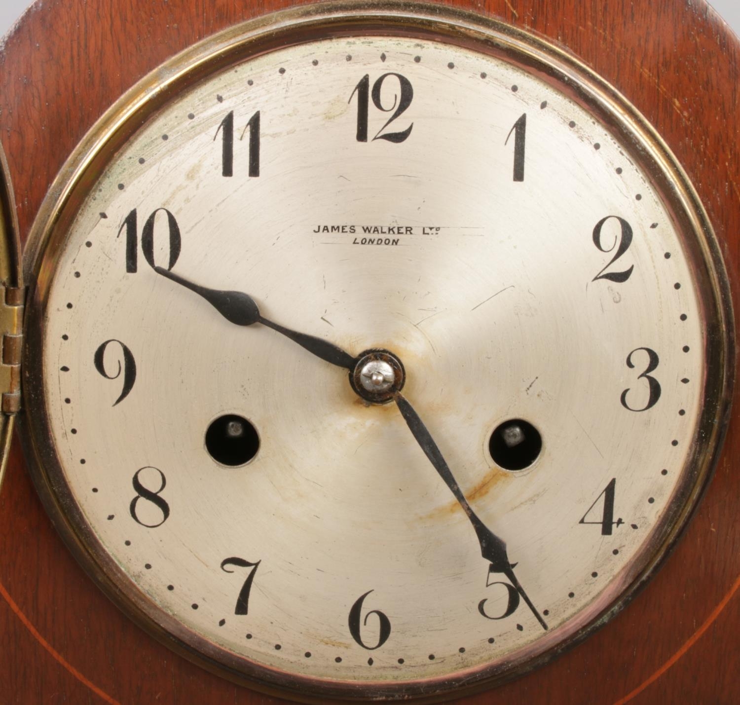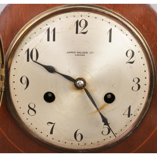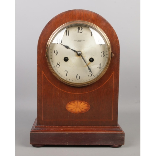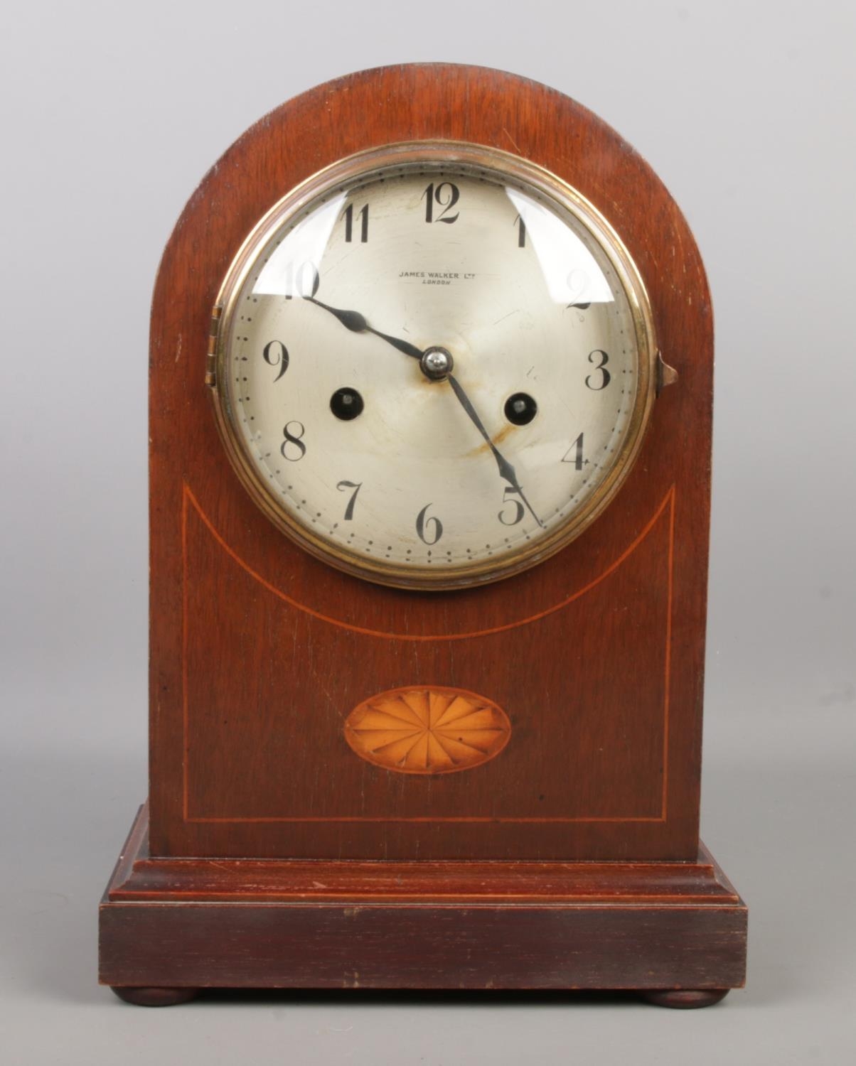 An early 20th century mantel clock by James Walker Ltd London, in mahogany inlaid case with signed metal dial and Arabic numerals, size W22 × D14 × H32cm.
