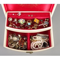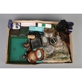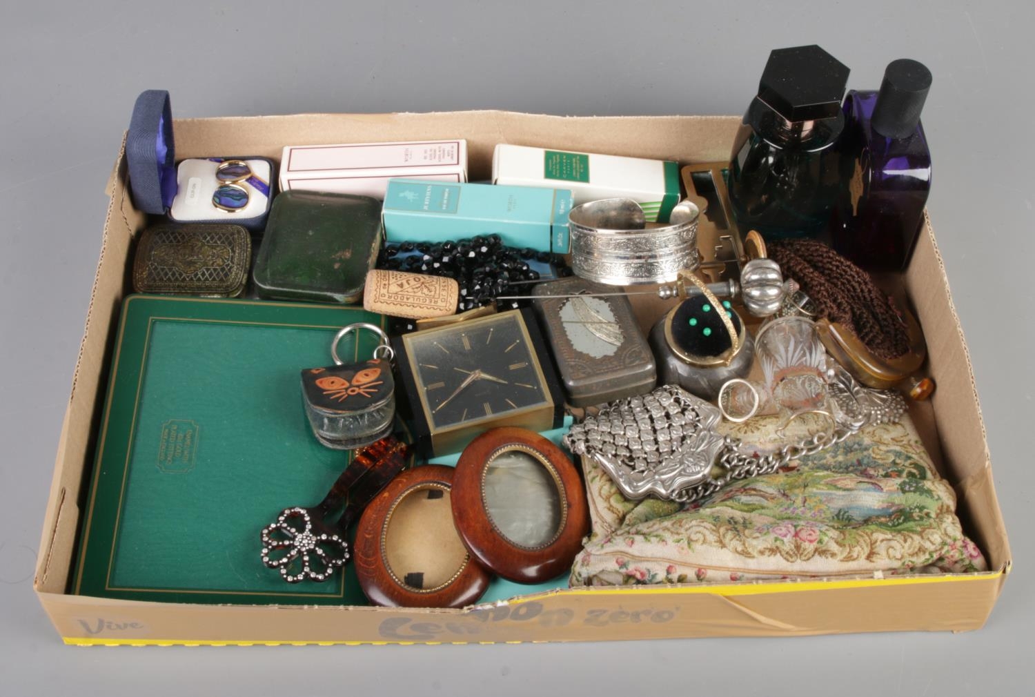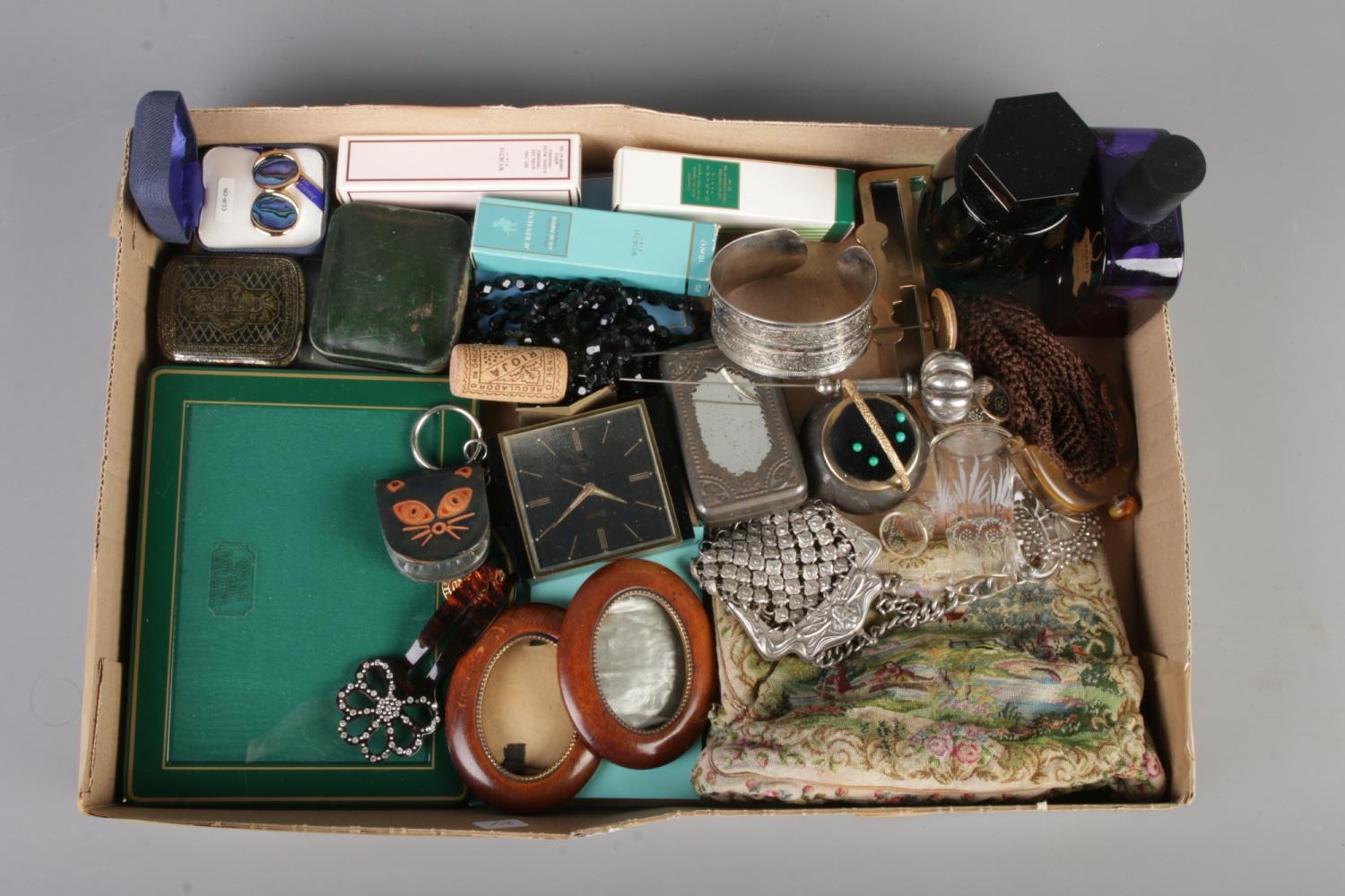A tray of collectables. Includes photograph frames, perfume bottles, paua shell clip on earrings, Swiza clock etc.