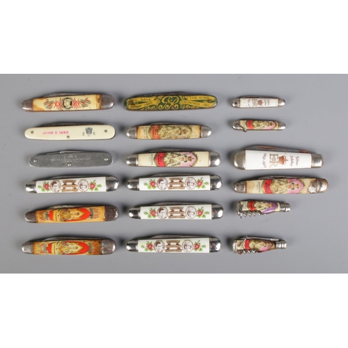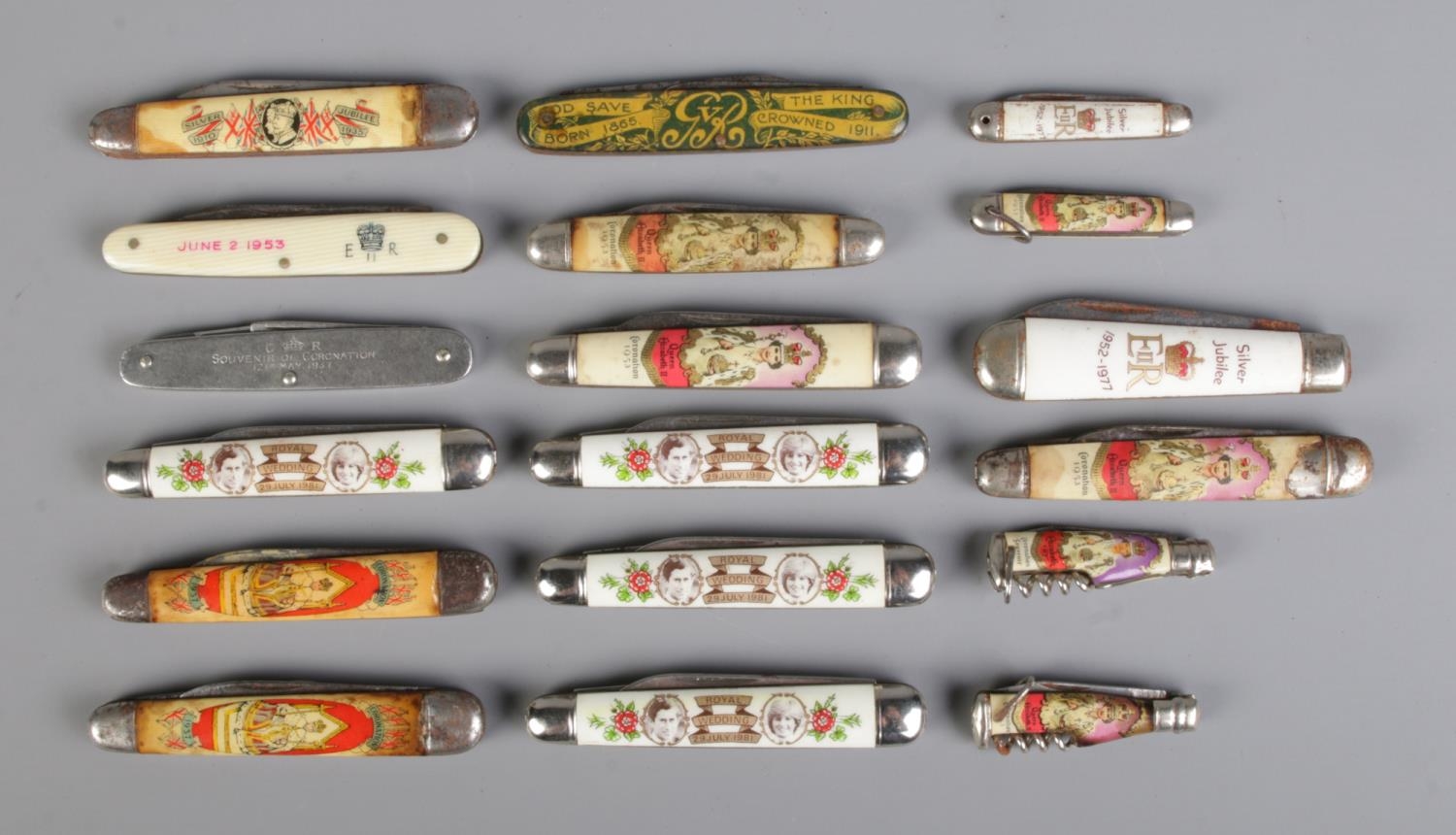 Eighteen folding Commemorative knives, including Elizabeth II coronation, 1981 Royal Wedding, Silver Jubilee and 1937 Coronation. Consists of Richards and T. Turner & Co. examples. CANNOT POST.