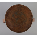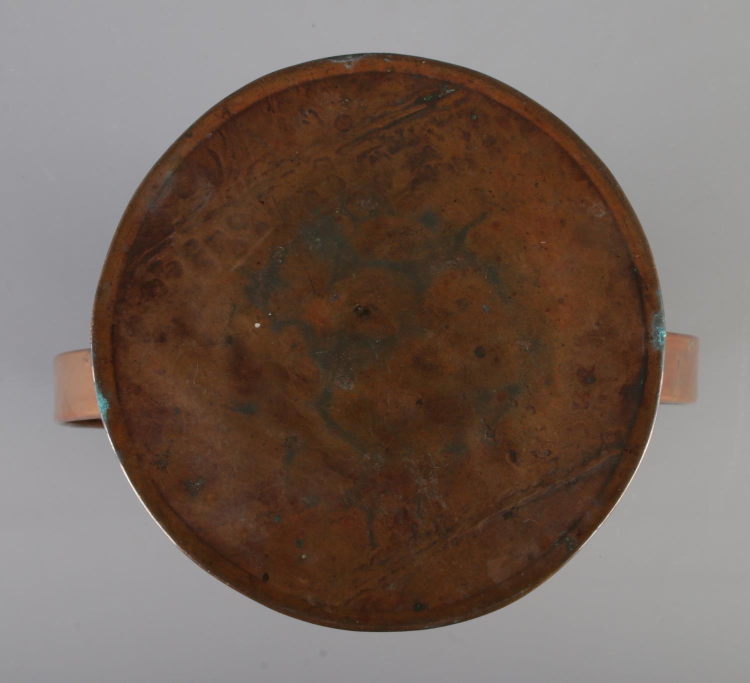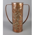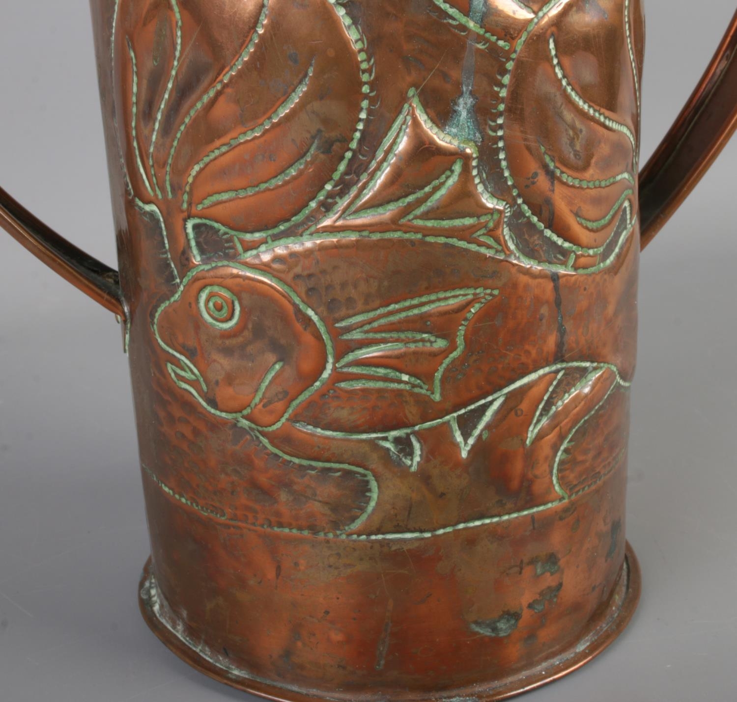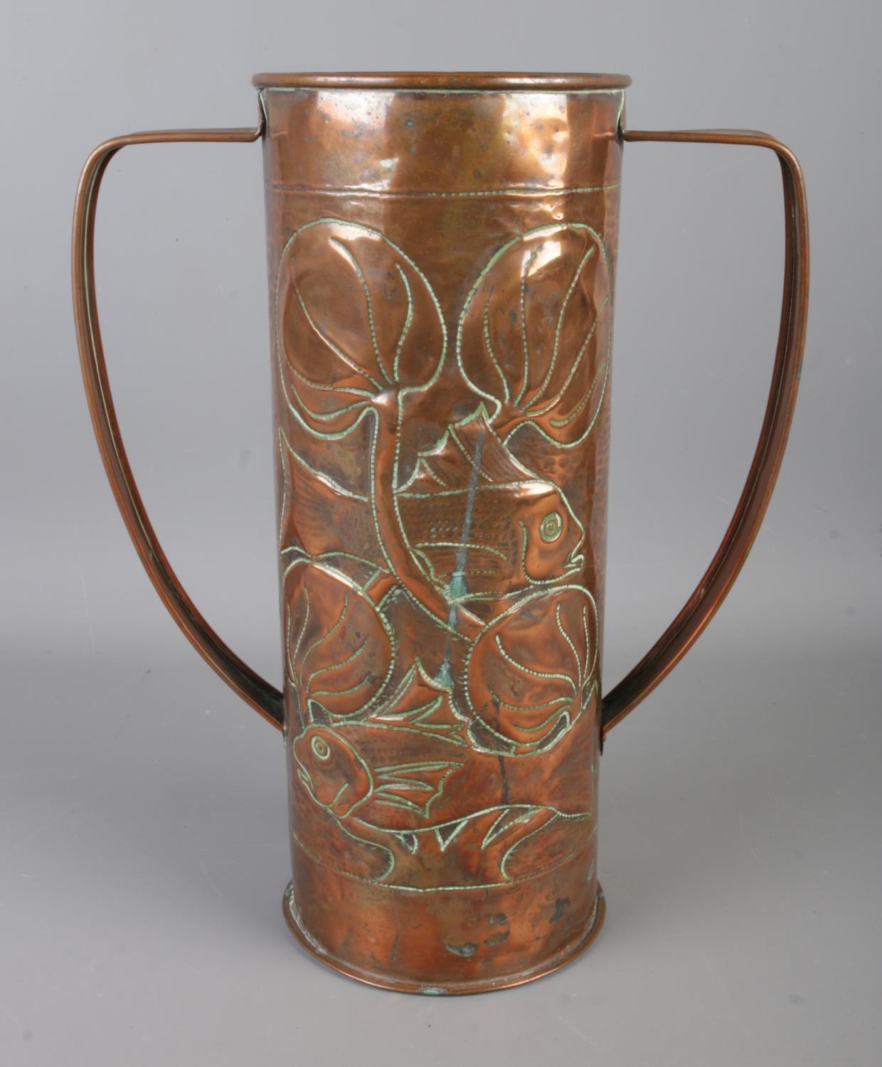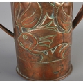 A Newlyn arts and crafts copper twin handled vase featuring hammered fish amongst reeds. Approx. height 30cm.