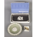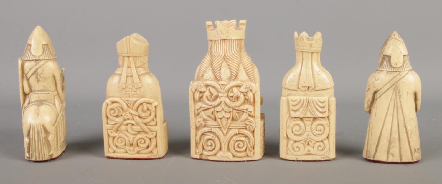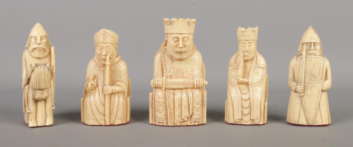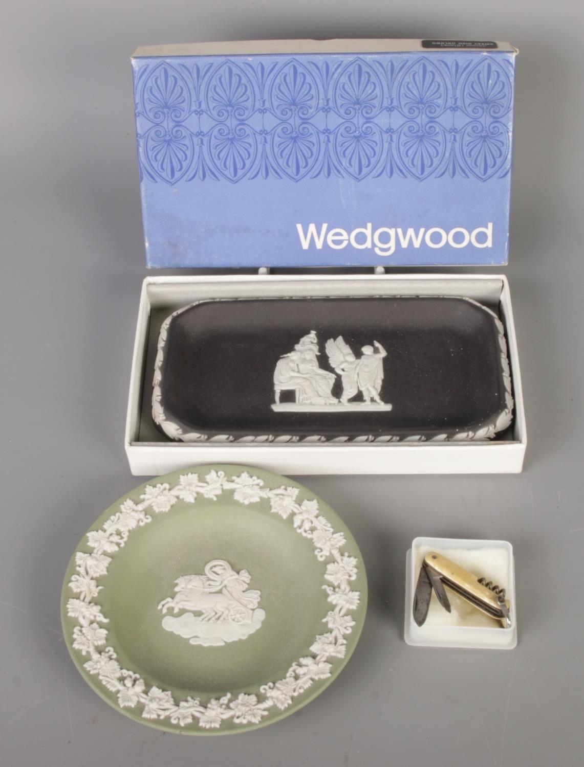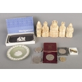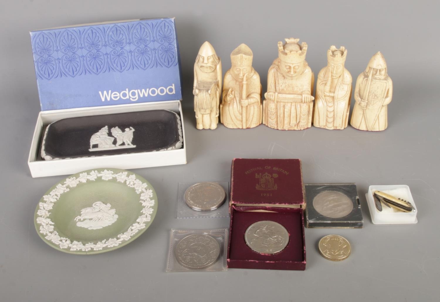 A group of collectables, including five vintage coins, five British Museum BMPL replica Lewis chess pieces, a vintage German Elosi miniature pocket knife and two Wedgwood dishes.