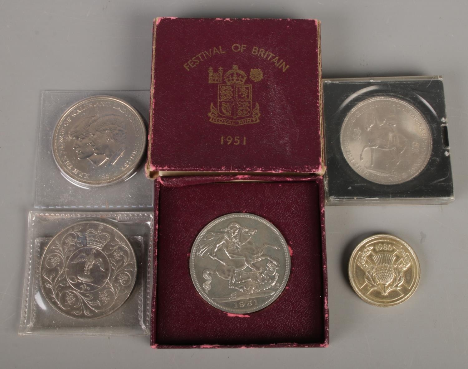 Coins: 1981 The Prince Of Wales And Lady Diana Spencer Commemorative Coin, 1977 Silver Jubilee Commemorative Crown, 1951 Festival of Britain George VI Five Shillings, 1953 Elizabeth II Coronation Five Shillings, 1986 Commonwealth Games Two Pound Coin.
