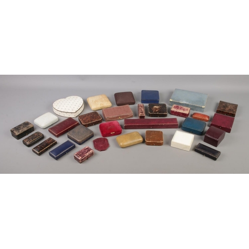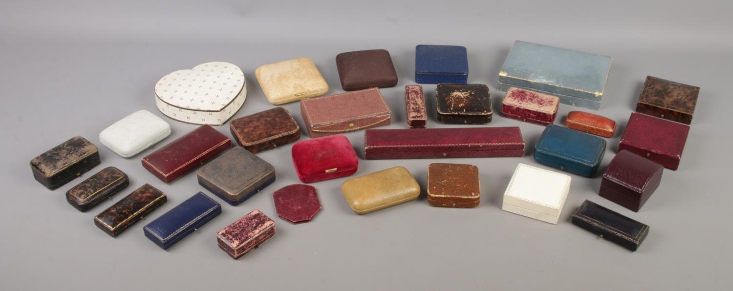 A good collection of antique and vintage jewellery boxes. To include examples from JW Benson (London), Dolson & Sons (London), AS Wigg (Newmarket), Bell Brothers (Doncaster), Phillips' (Leeds), Leonard Hyman (Bradford), G. Kenning & Son (Liverpool), John Mason (Rotherham), WS Jones (Bolton) and FA Woodroffe (Stockton on Tees).