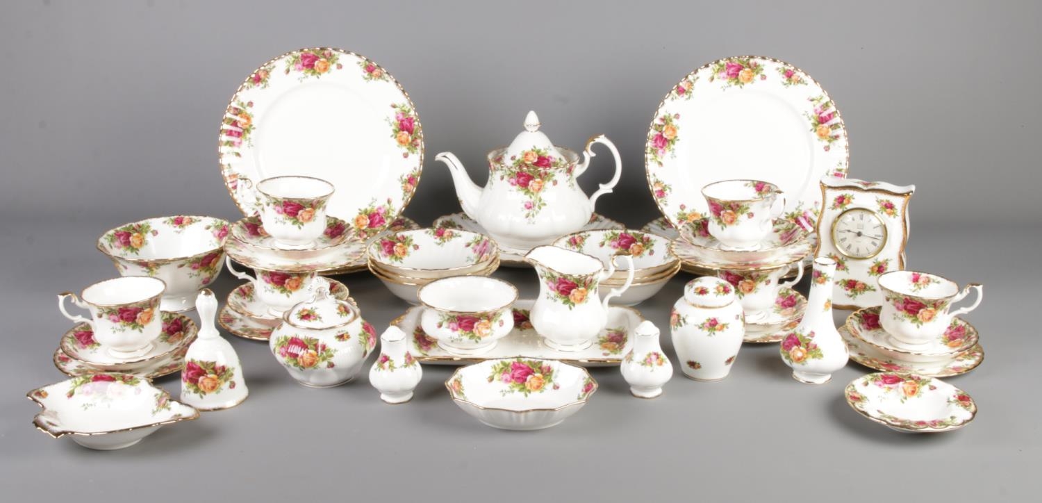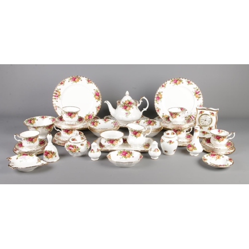 A collection of Royal Albert Old Country Roses ceramics, to include teapot, dinner plates, cups and saucers, bowls and clock etc. Approximately 46 pieces.