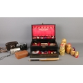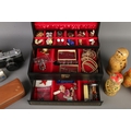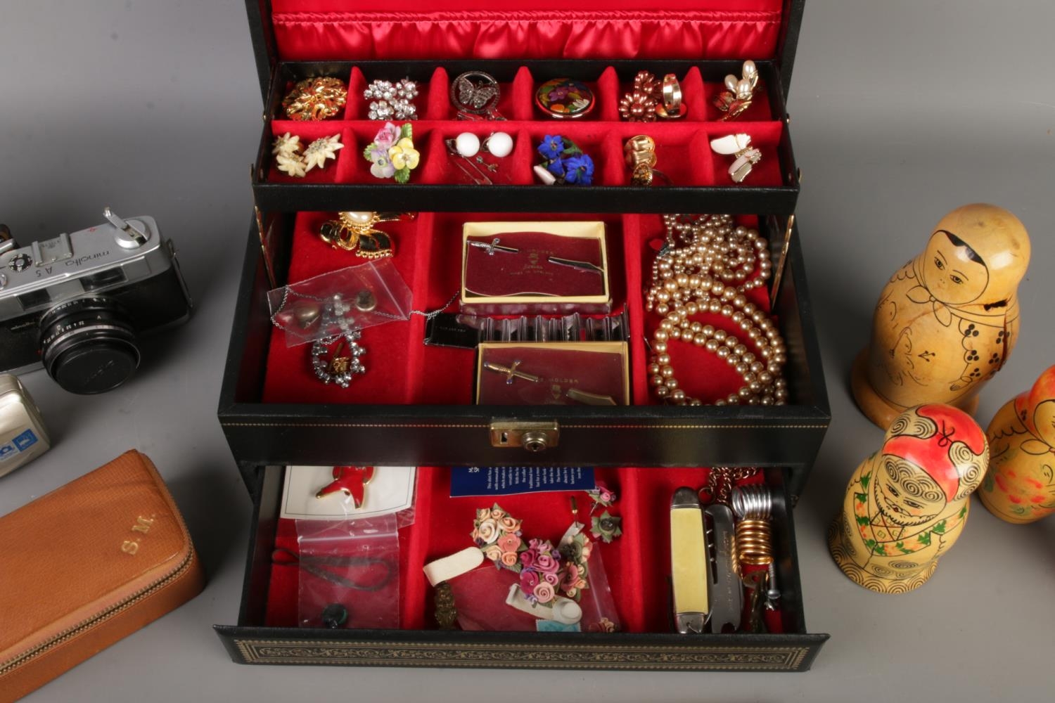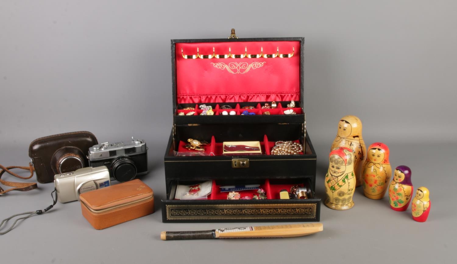 A Mele cantilever jewellery box with contents of mainly costume jewellery, together with a small quantity of collectables. Includes silver and marcasite set brooch, signed Yorkshire CCC autograph bat, Minolta A5 camera and Russian Dolls.