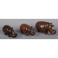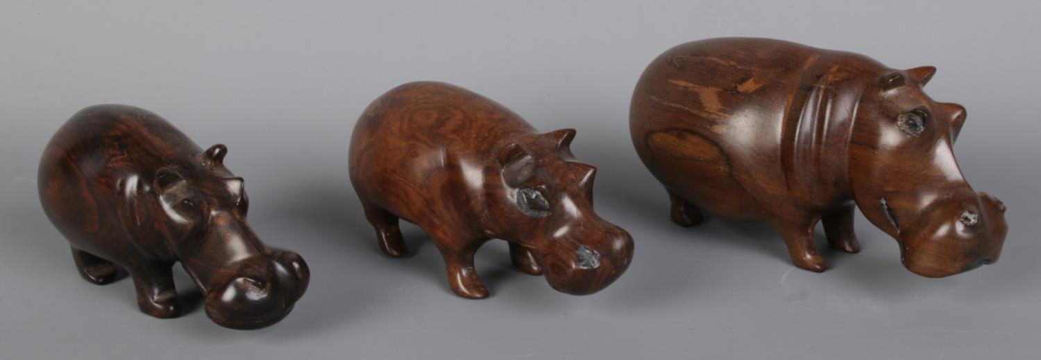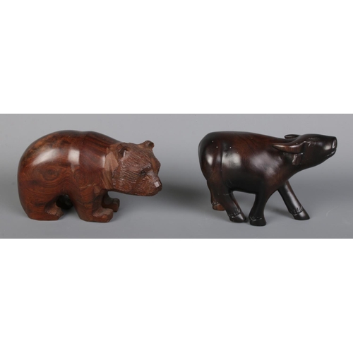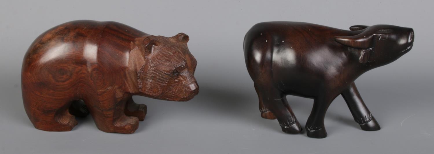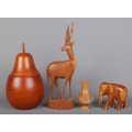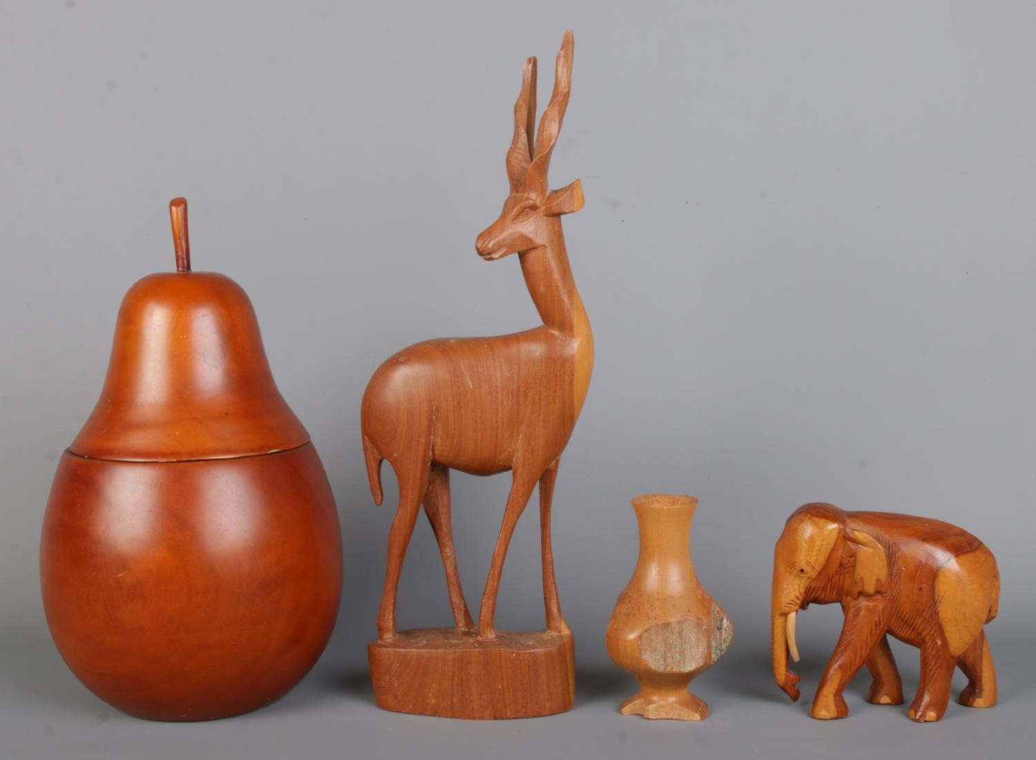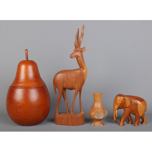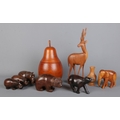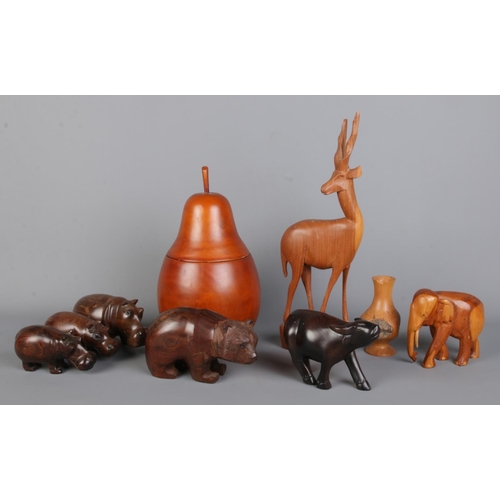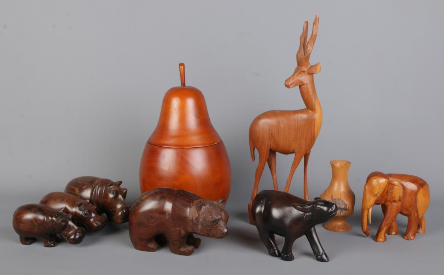 A collection of hardwood carvings and animal figures, comprising a pear-shaped lidded vase, figures of a hippopotamus, bear, buffalo, elephant and giraffe etc.