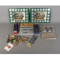 A box of miscellaneous items; Parker Pens, Military Buttons, Sheaffer Calligraphy set, Historic Car Coin collection, costume jewellery brooches and key chains etc.