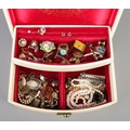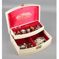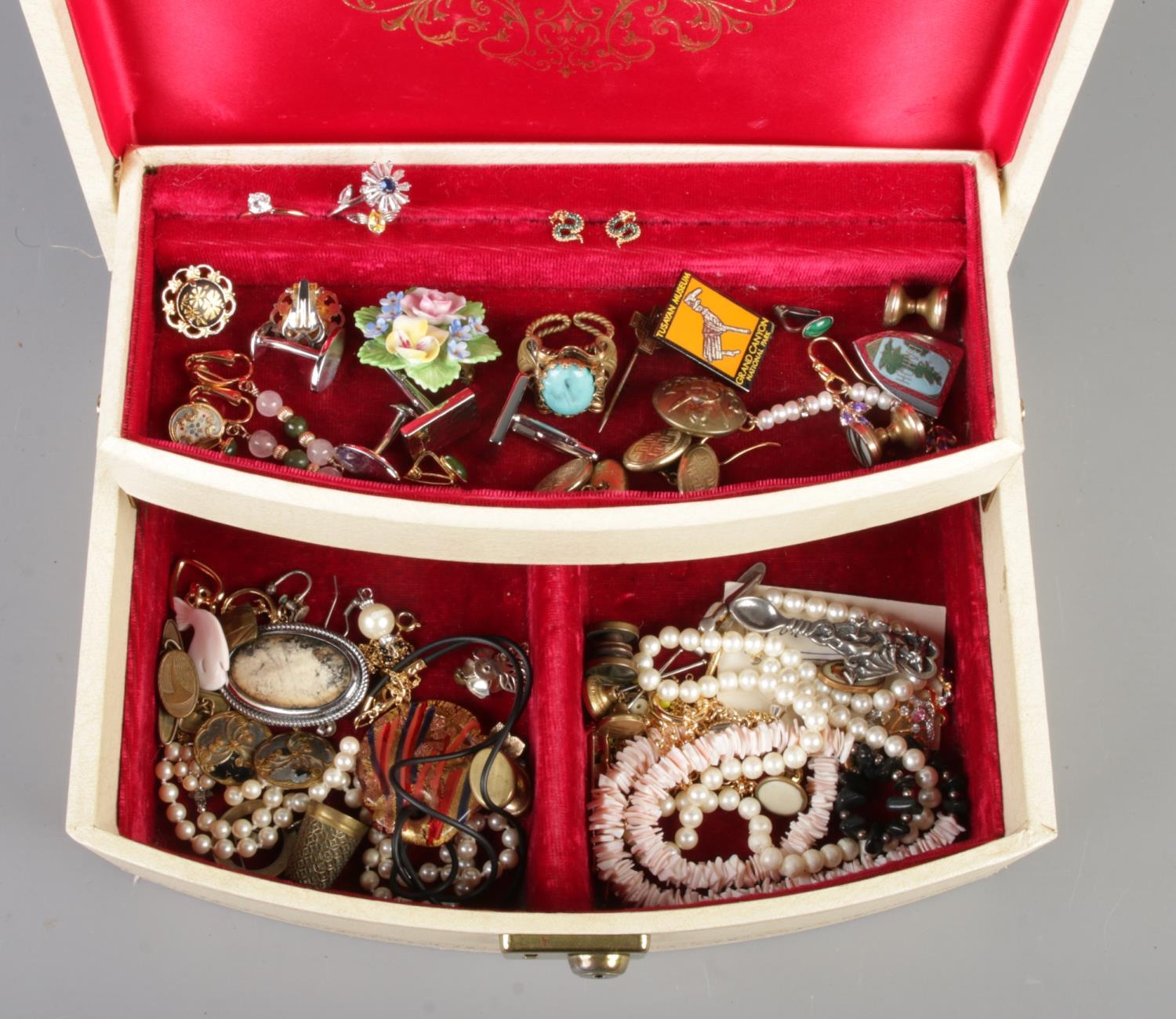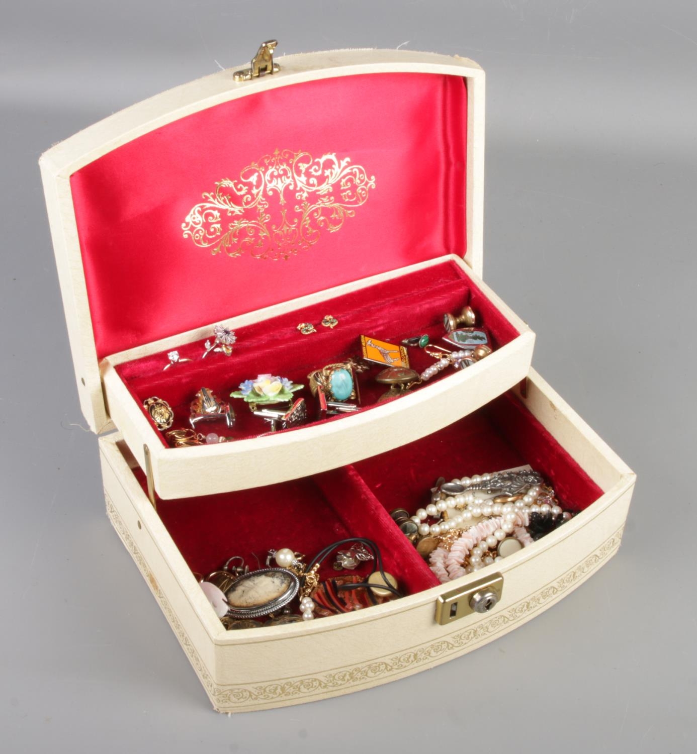 A jewellery box with contents of costume jewellery. Includes rings, earrings, cufflinks, necklaces etc.