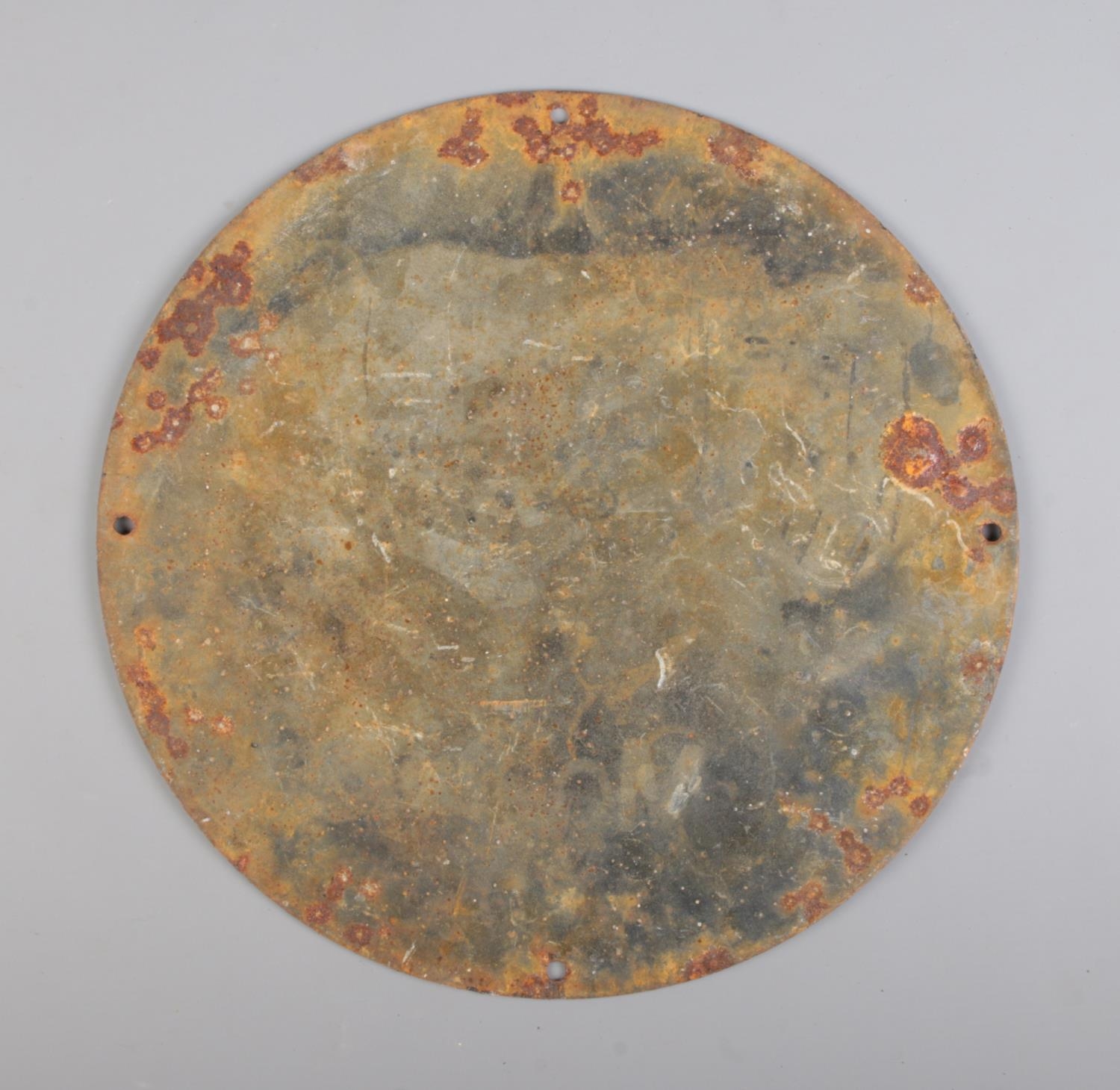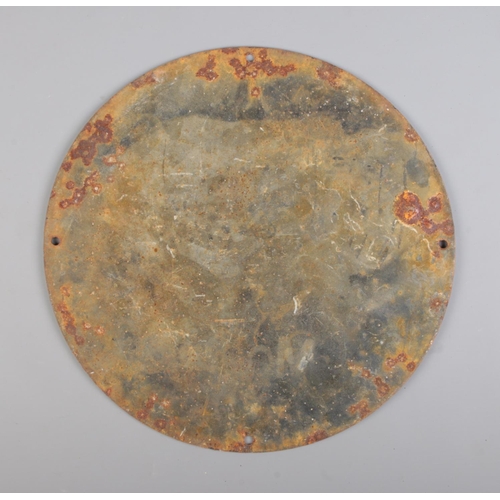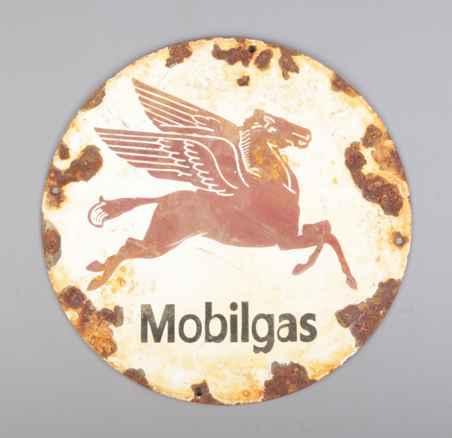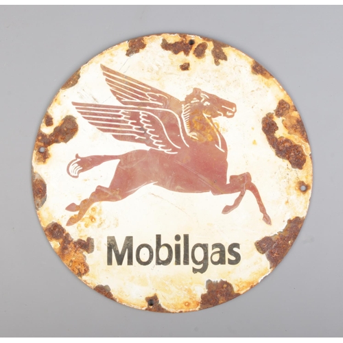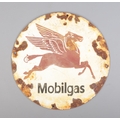 A circular enamel advertising sign for Mobilgas. Diameter: 30cm.