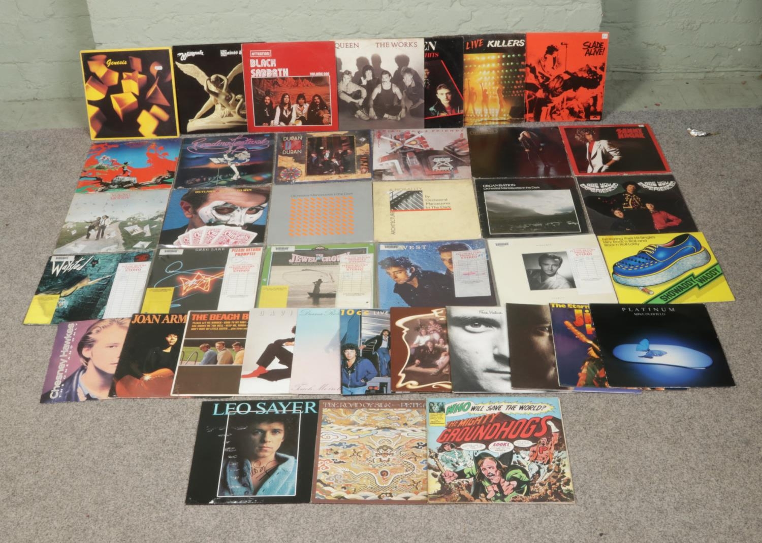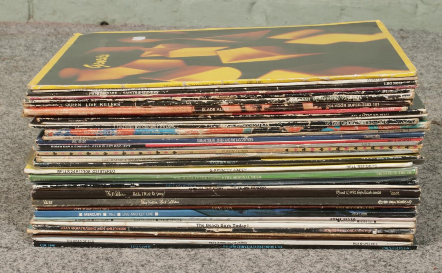 A collection of assorted vinyl LP records including 'Black Sabbath, Paranoid - NEL 6003', 'Iron Maiden, The Number of The Beast - EMC 3400', 'Stevie Wonder, Looking Back', 'Whitesnake, Love Hunter - UAG30264', 'Motorhead, Overkill', 'Bob Dylan, The Times They Are A-Changin - SBPG 62251', 'Gerry Rafferty, Snakes And Ladders', 'Paul Simon, Graceland'. Alongside other artists Marvin Gaye, Joni Mitchell, Kate Bush, Turnstyle, David Grant, The Last Linx and other examples.
