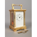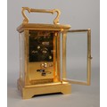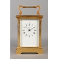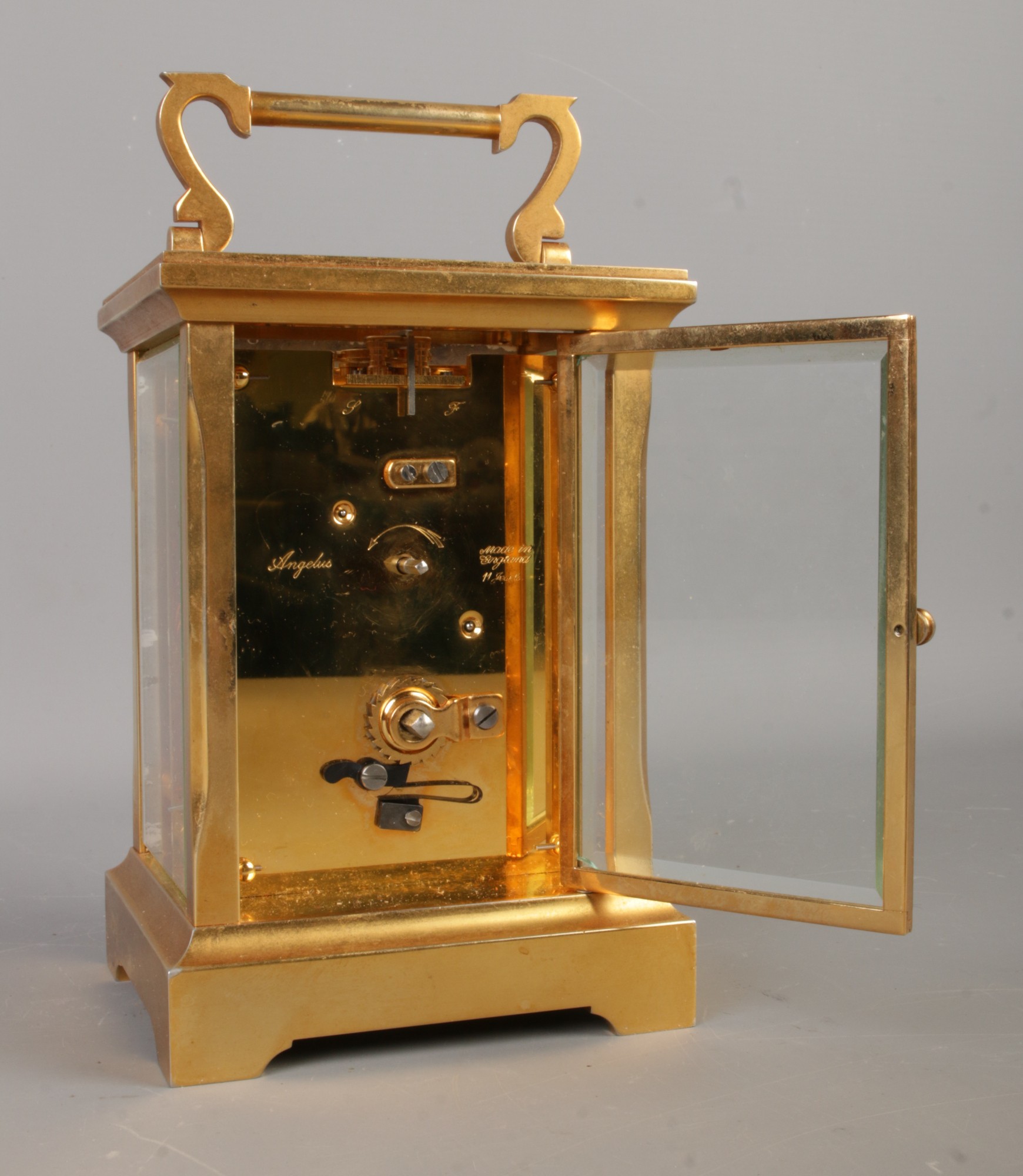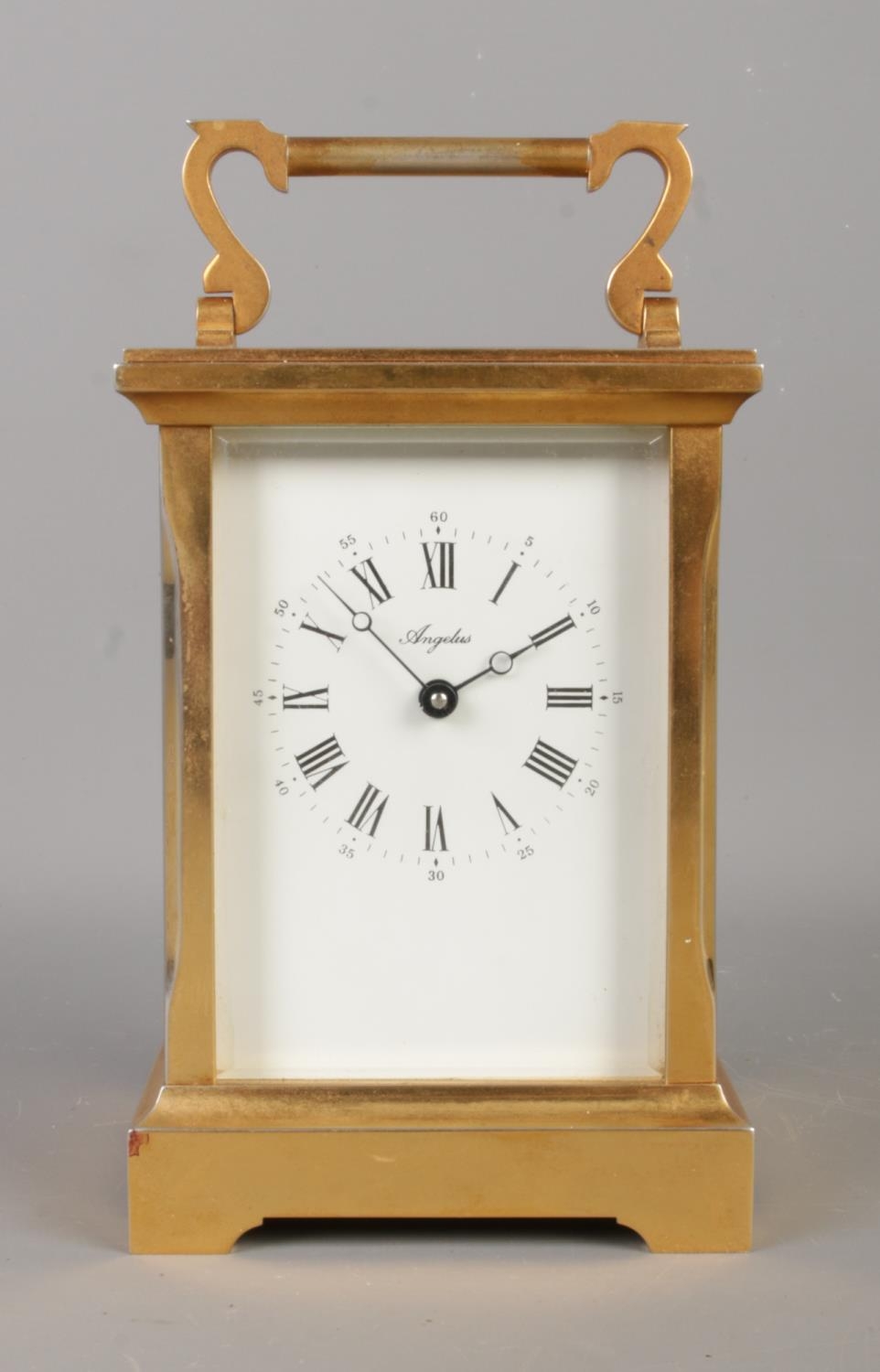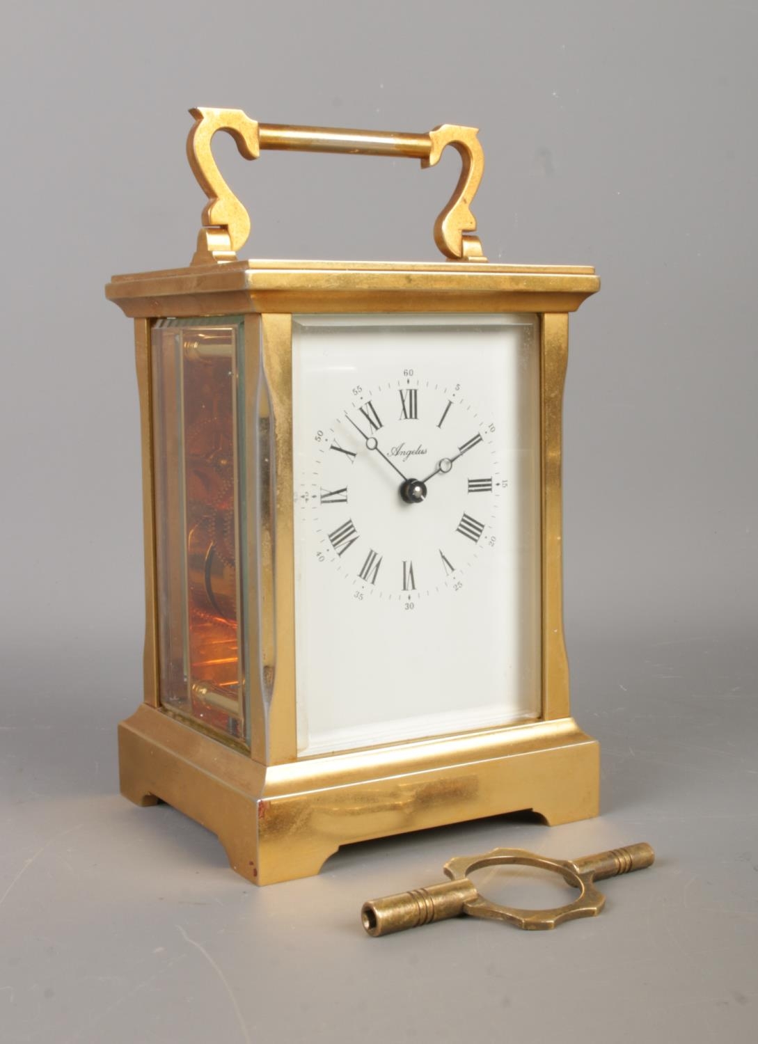 A brass Angelus carriage clock, with key. Featuring open top escapement, 11 jewel movement and Roman Numeral markers. Height: 18cm.