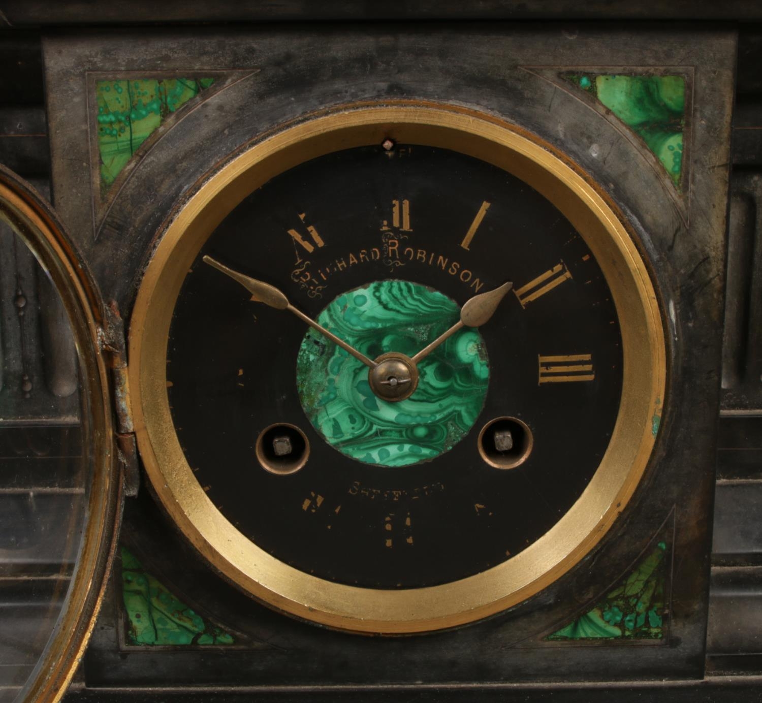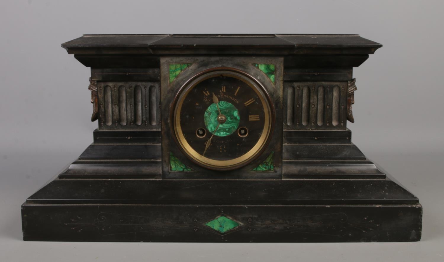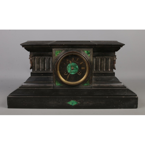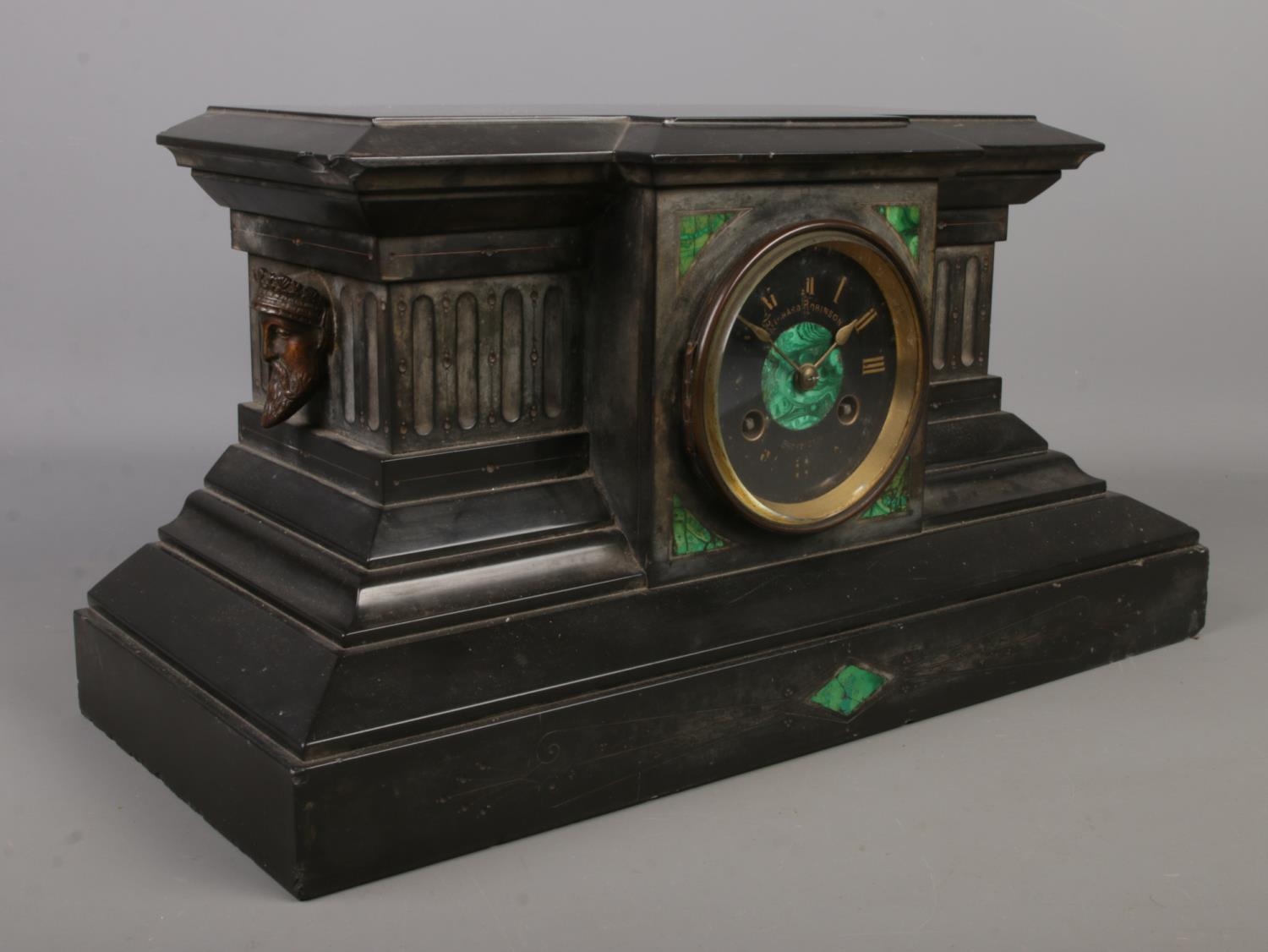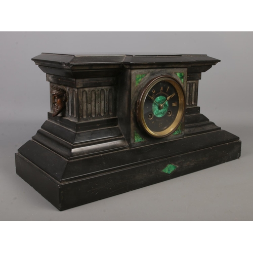 A late 19th century French eight day slate mantel clock by Vincenti & Cie. With malachite inlaid decoration to body and dial and twin bronze masks. Retailed by Richard Robinson, Sheffield. Height 20cm.