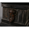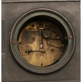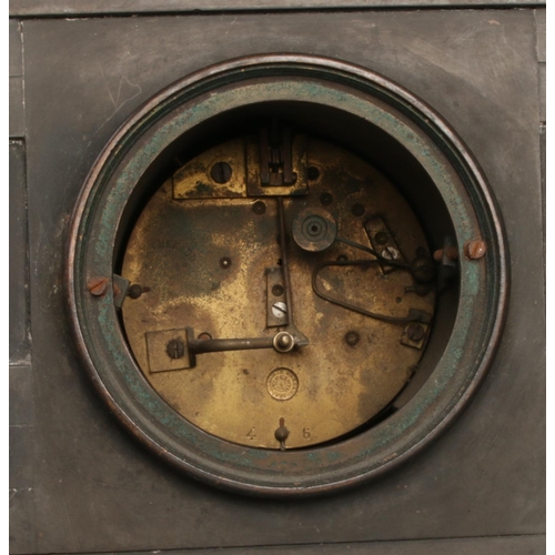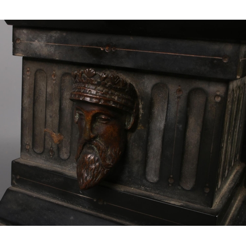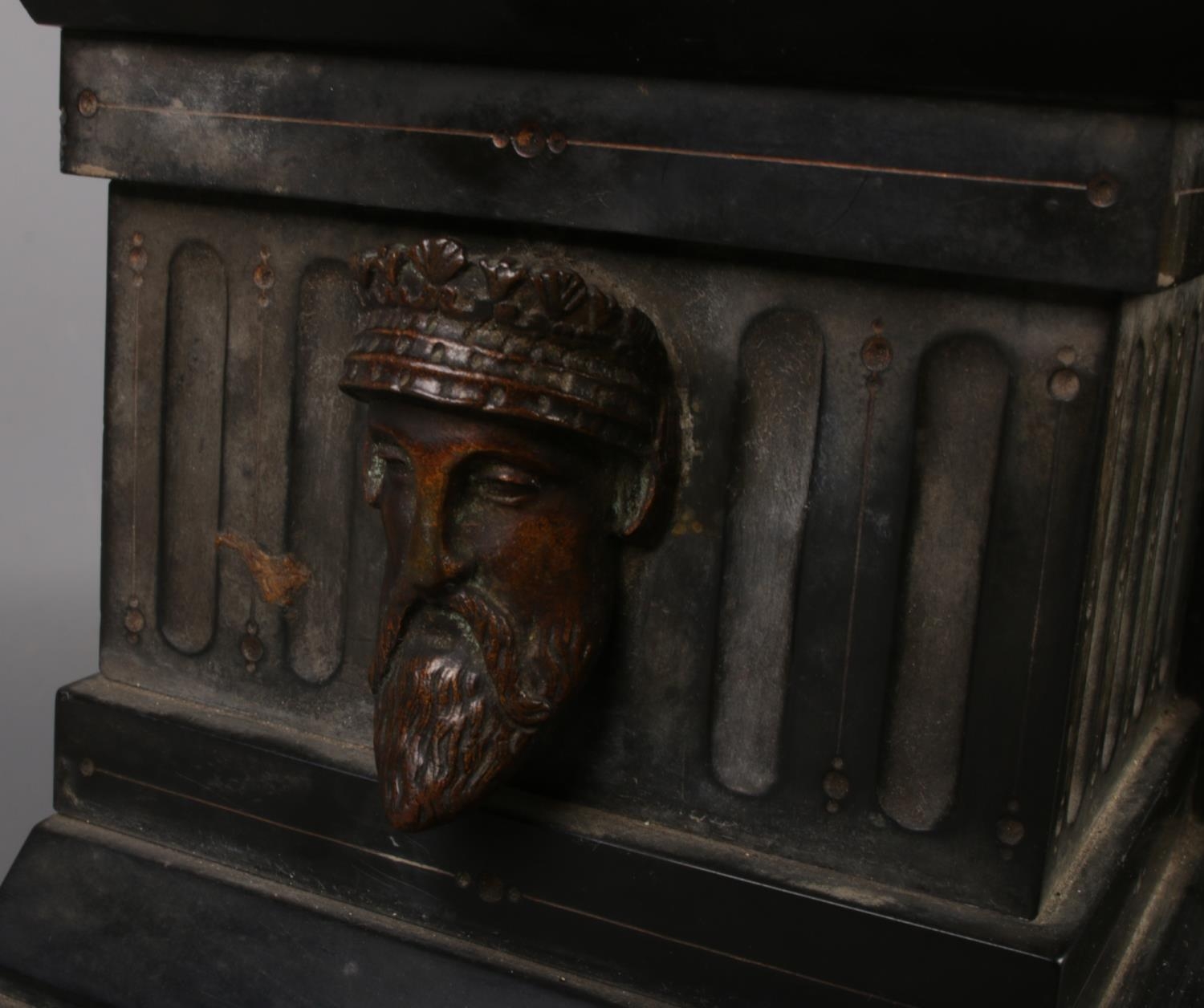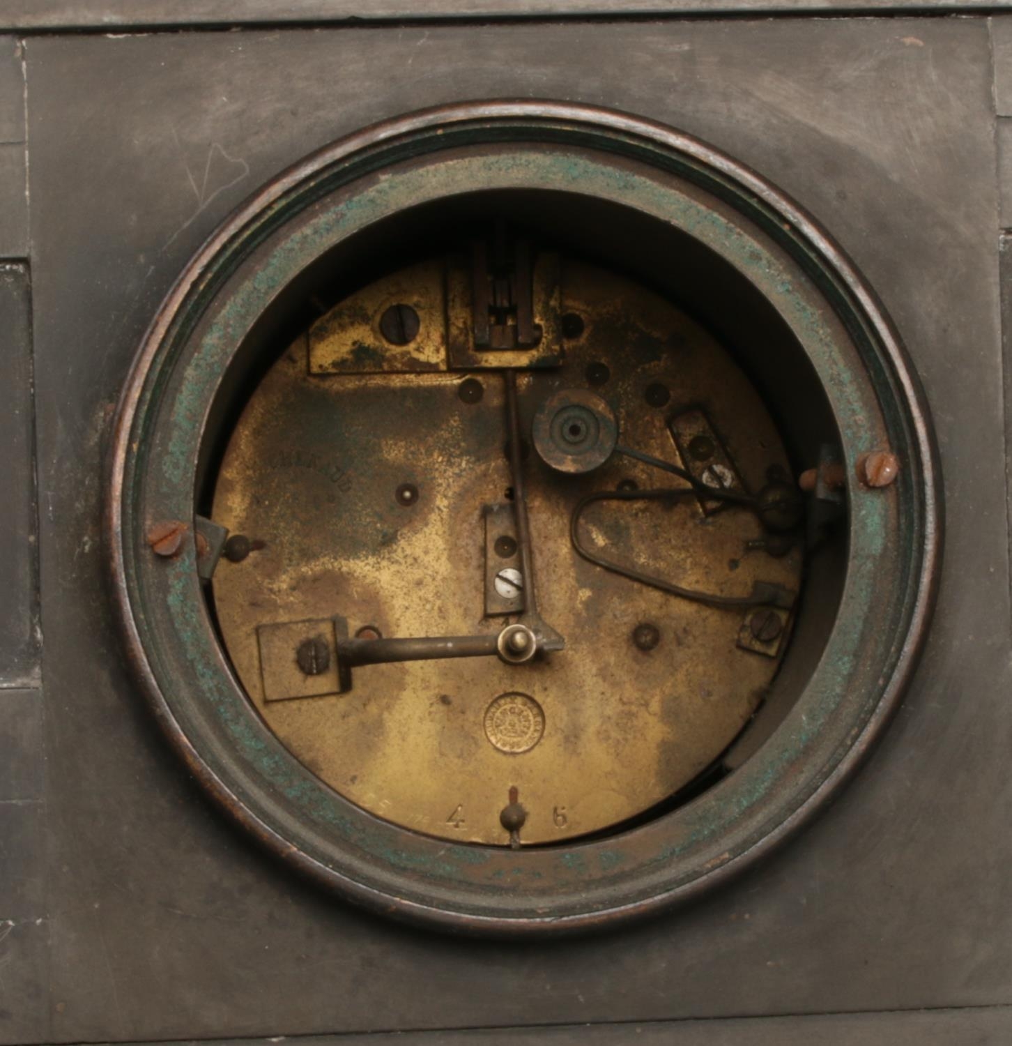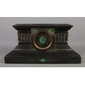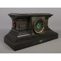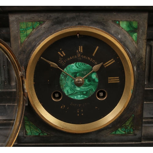 A late 19th century French eight day slate mantel clock by Vincenti & Cie. With malachite inlaid decoration to body and dial and twin bronze masks. Retailed by Richard Robinson, Sheffield. Height 20cm.