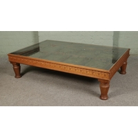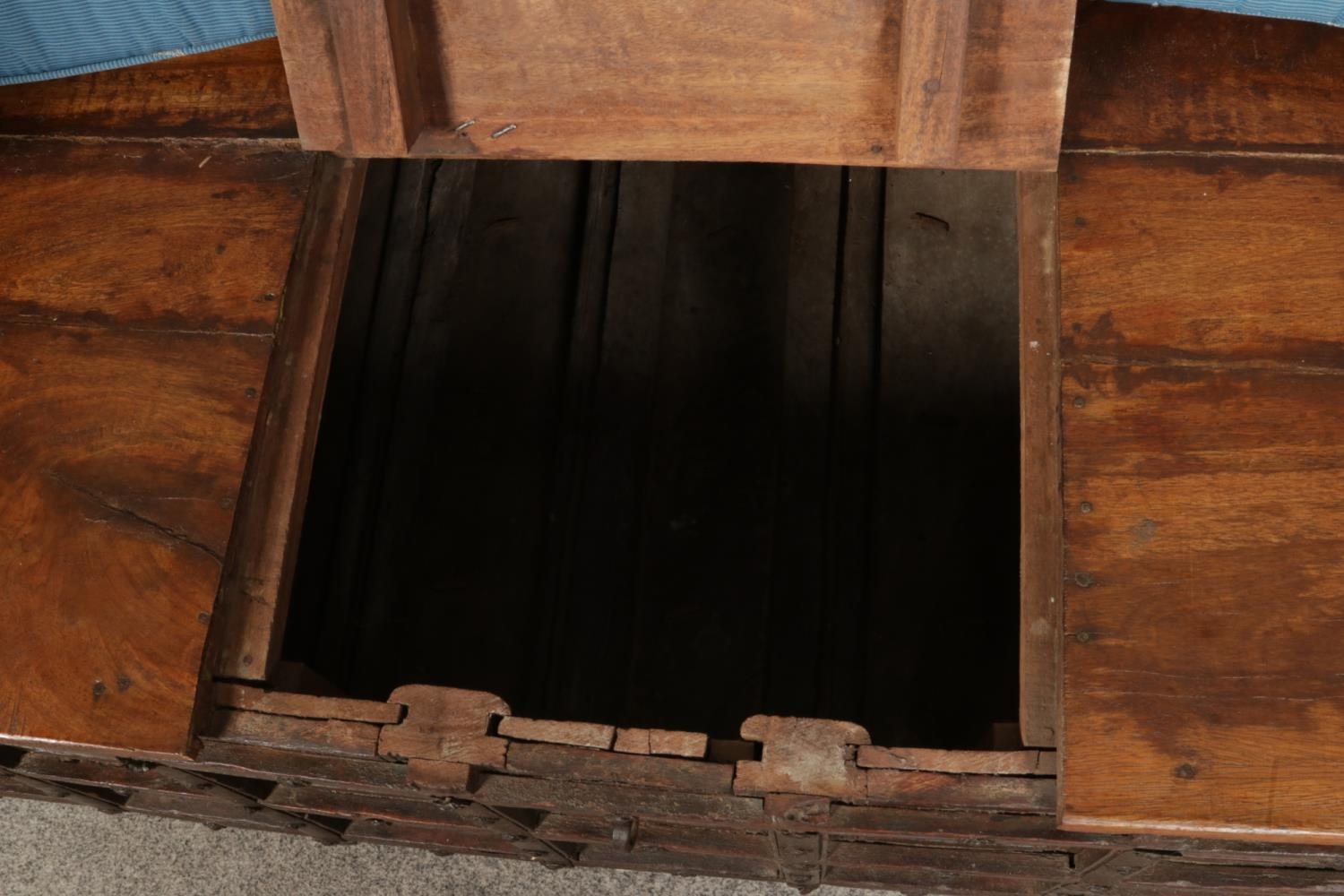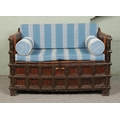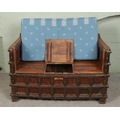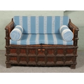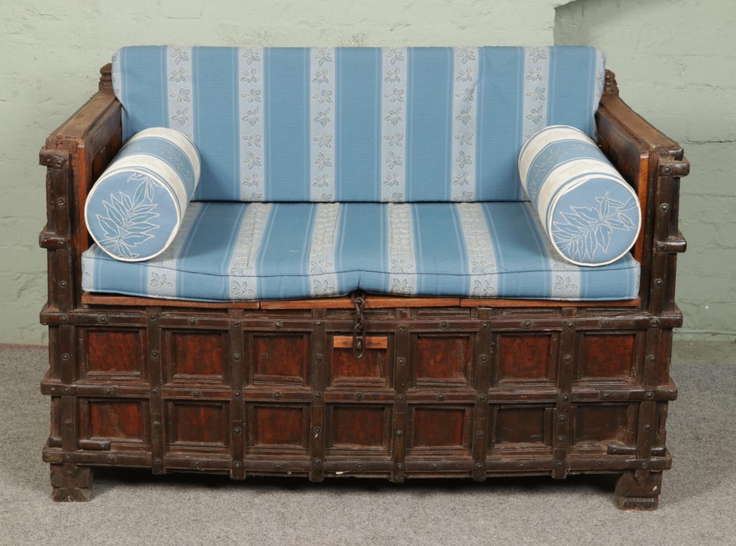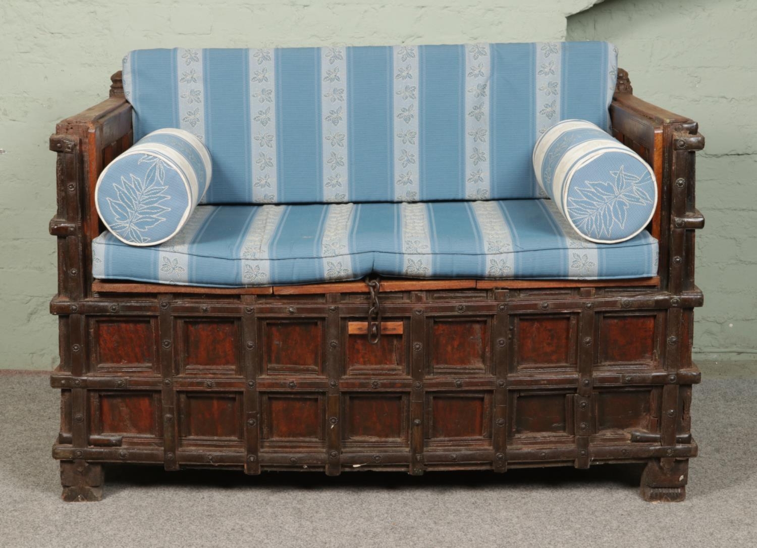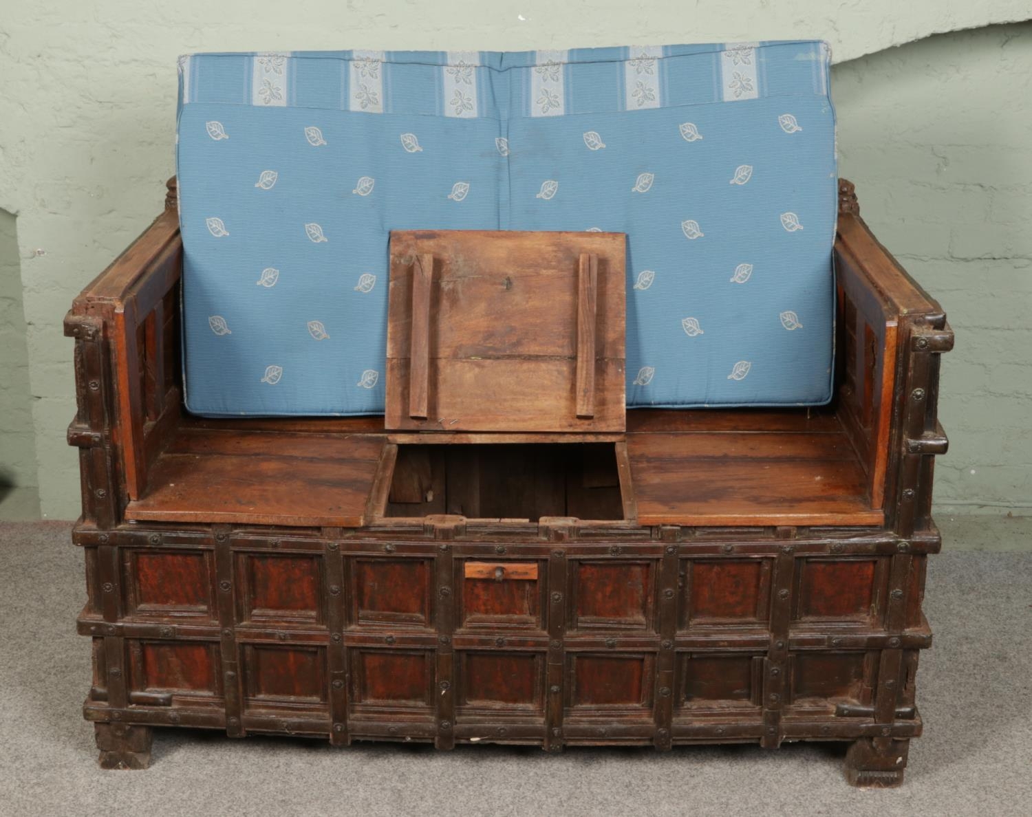 An Indian iron bound box settle/bench with storage compartment under seat.