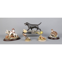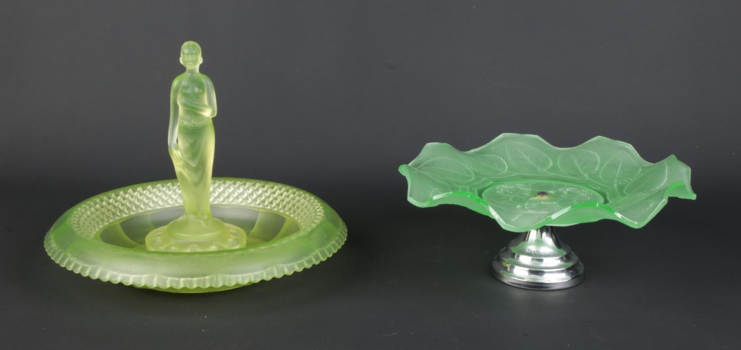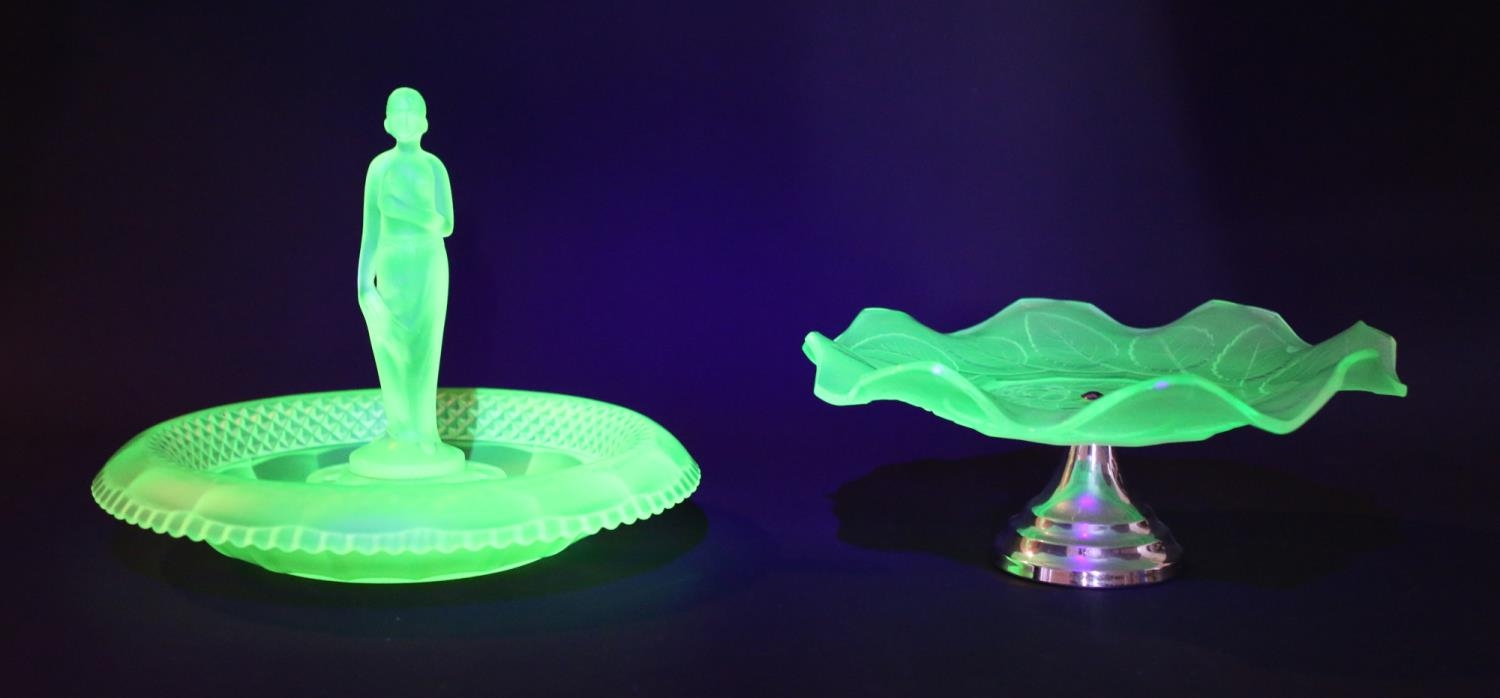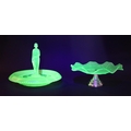 Three pieces of uranium glass, consisting of pedestal cake stand, bowl and figure.