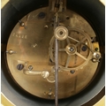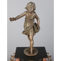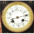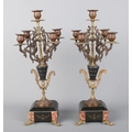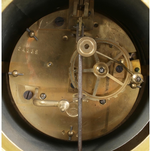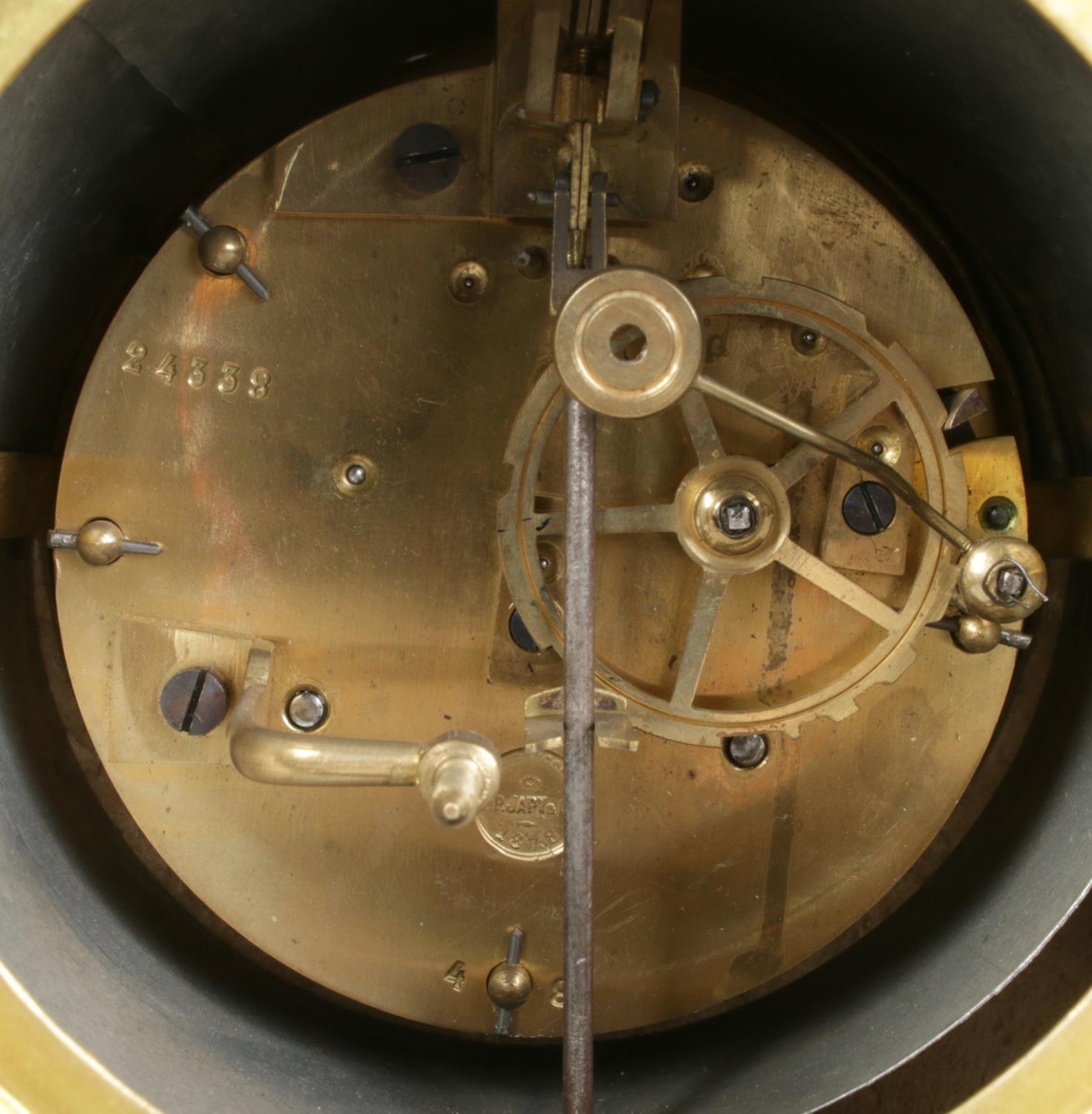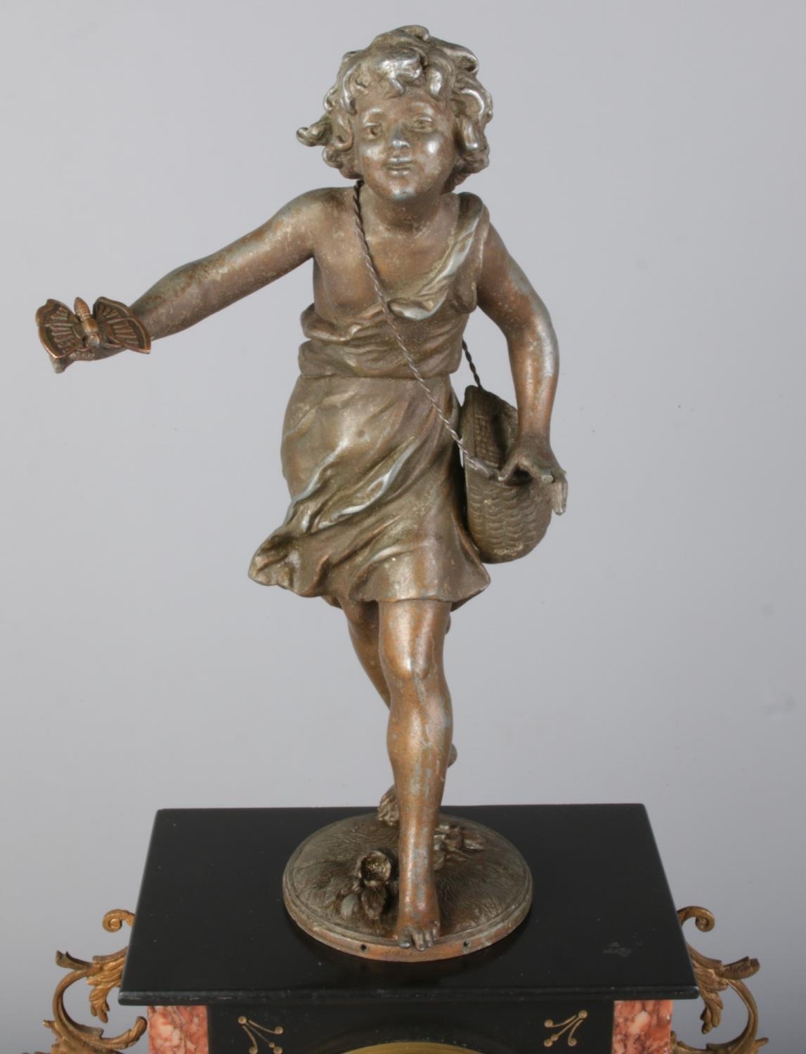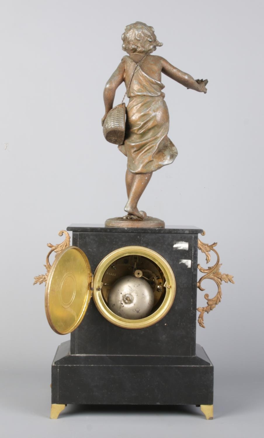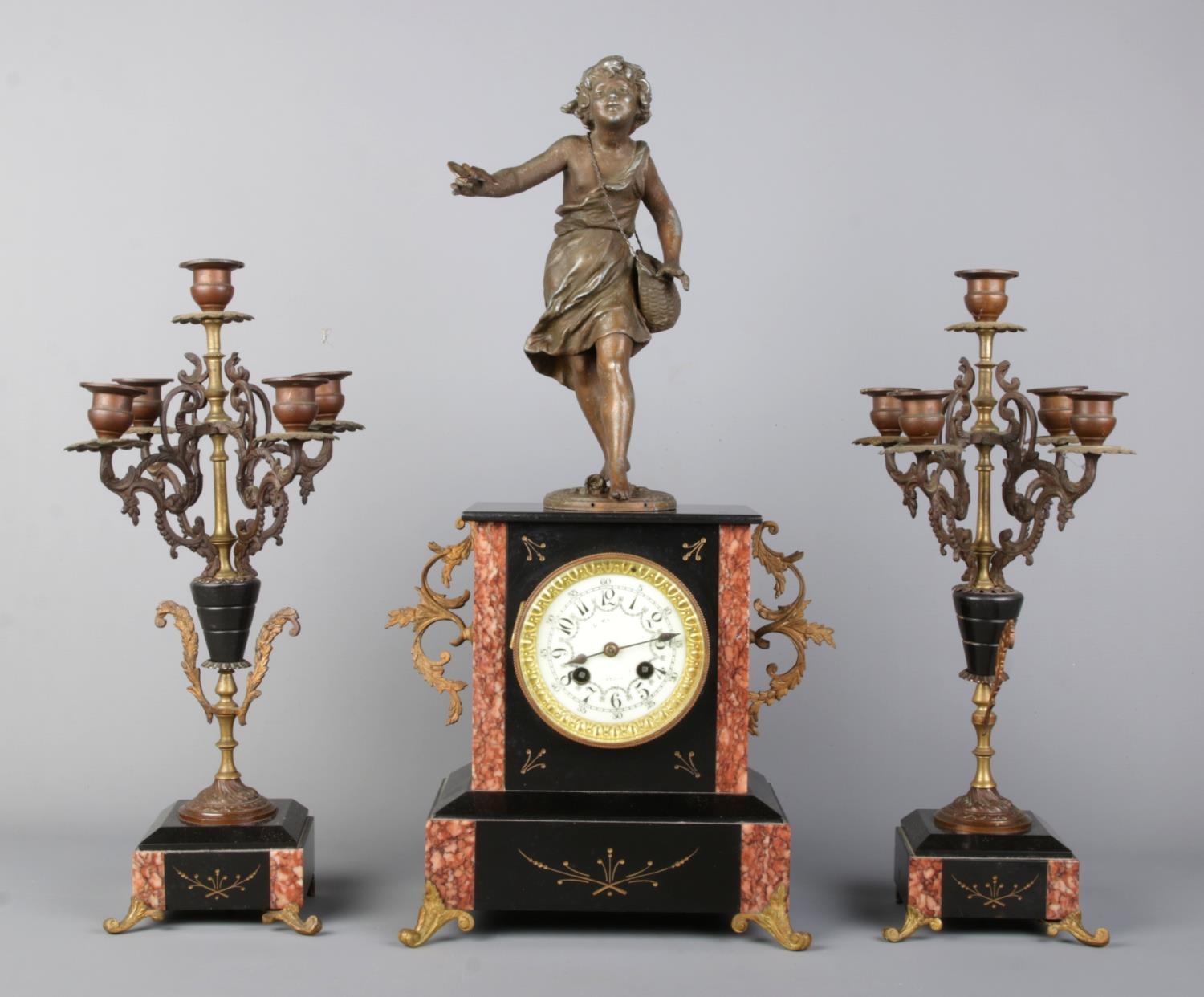 Clock size W27×D16×H54cm; candelabras size W17×D17×H40cm. Pendulum and key present, runs and stops. Figure has damaged fingers.