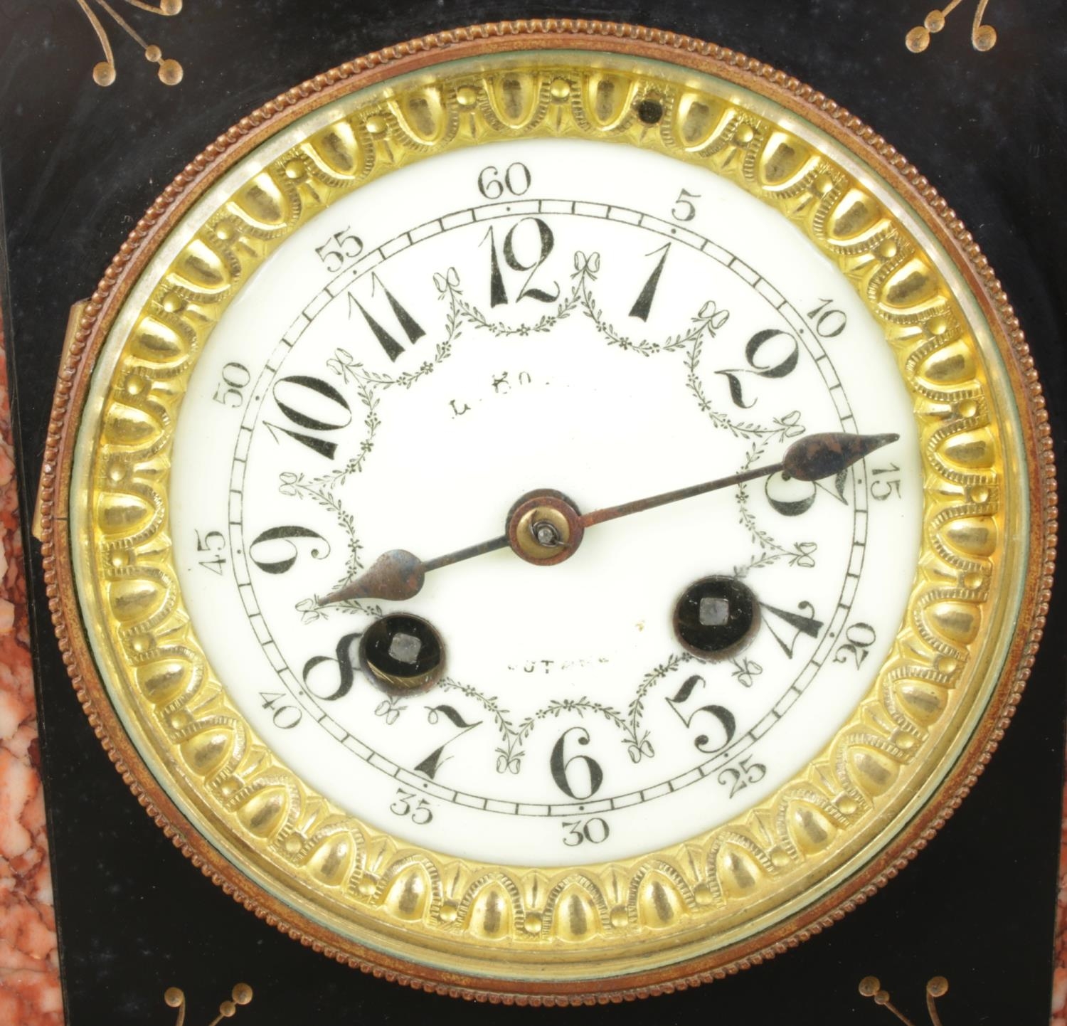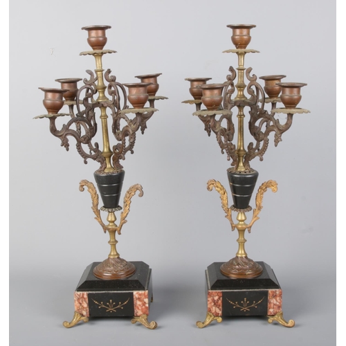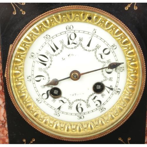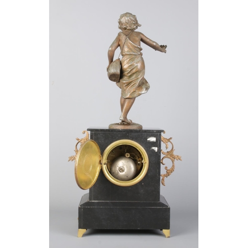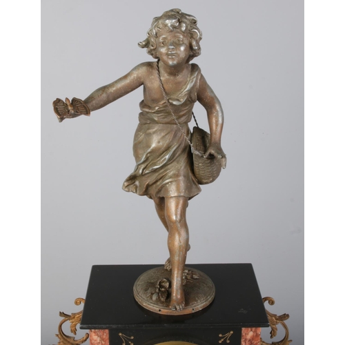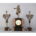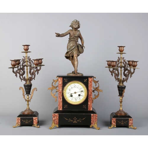A French three-piece mantel clock garniture, comprising a central clock flanked by two five-light candelabras, featuring slate and marble, a porcelain dial with Arabic numerals, and a spelter child figure atop. Movement stamped "LP Japy & C".
