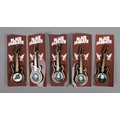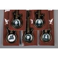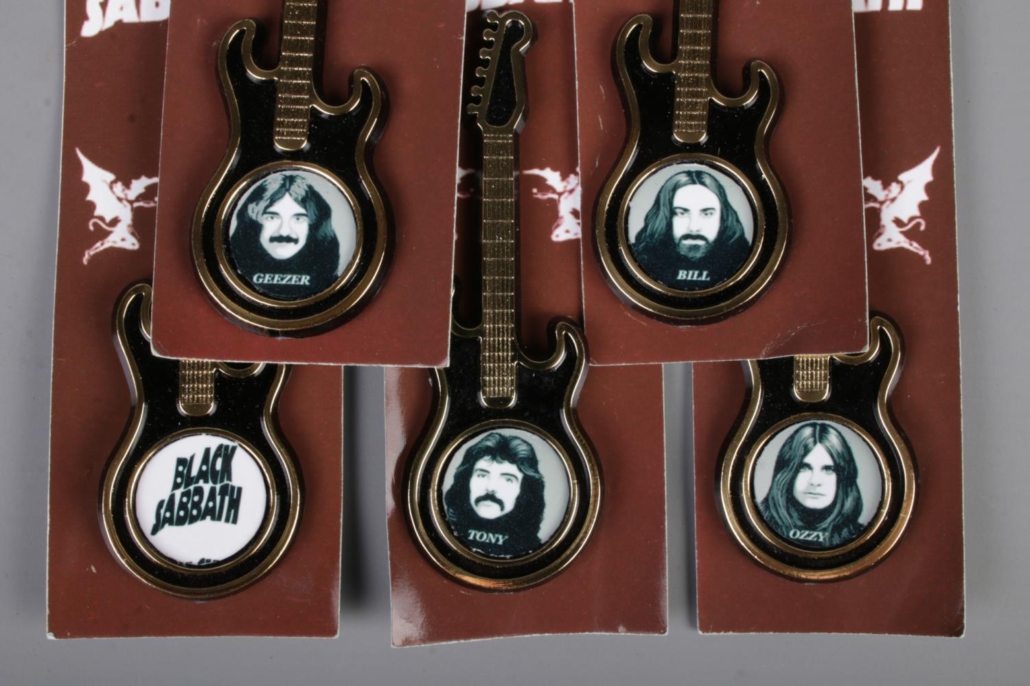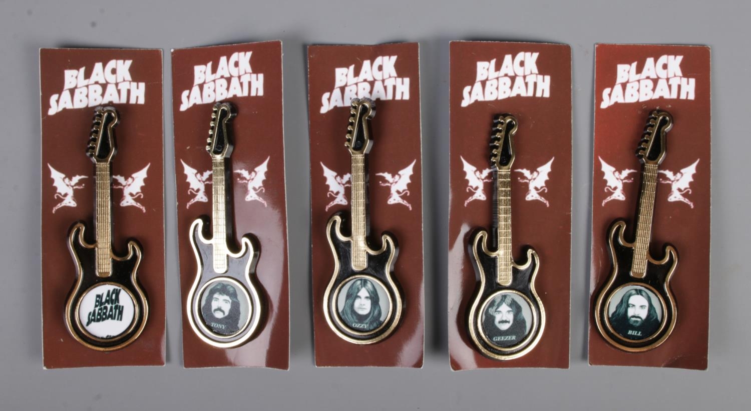 A set of five Black Sabbath guitar pin brooches. Four featuring band members and one logo, all on paper backing.