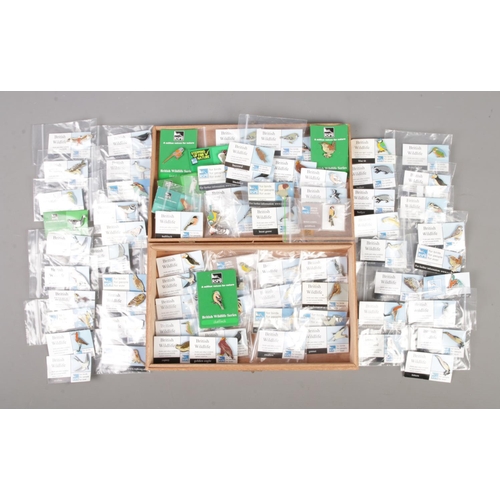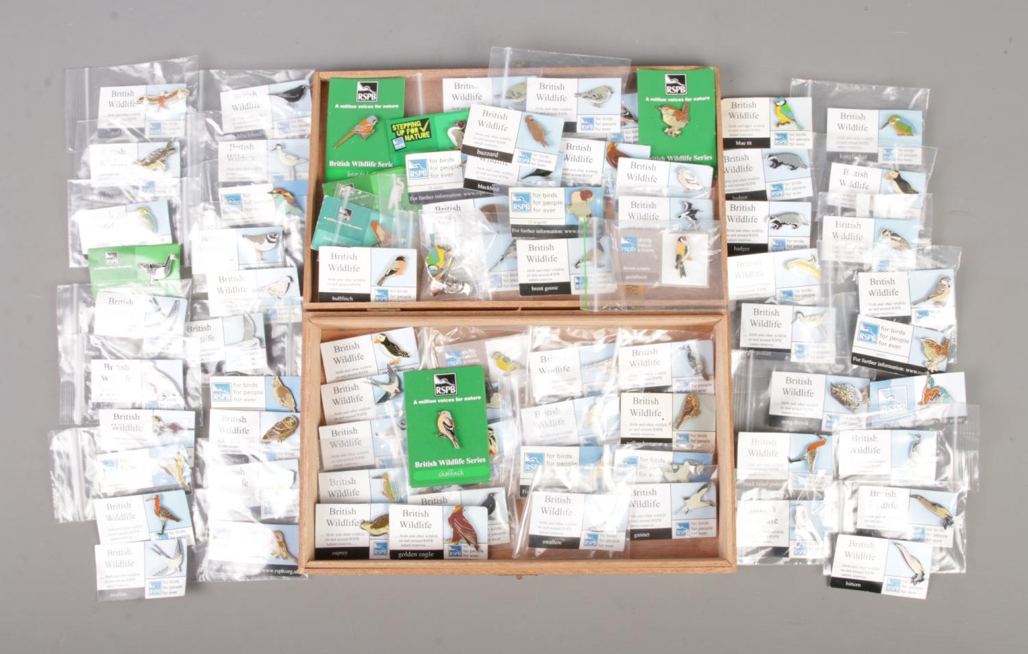 A large quantity of RSPB pin badges, mainly of birds, most on card backing.