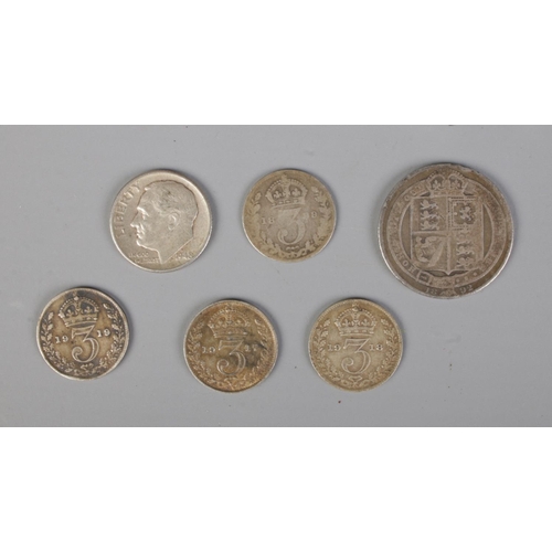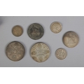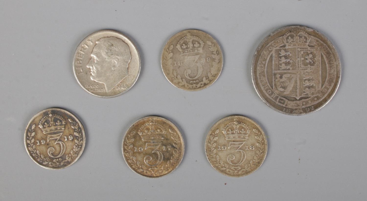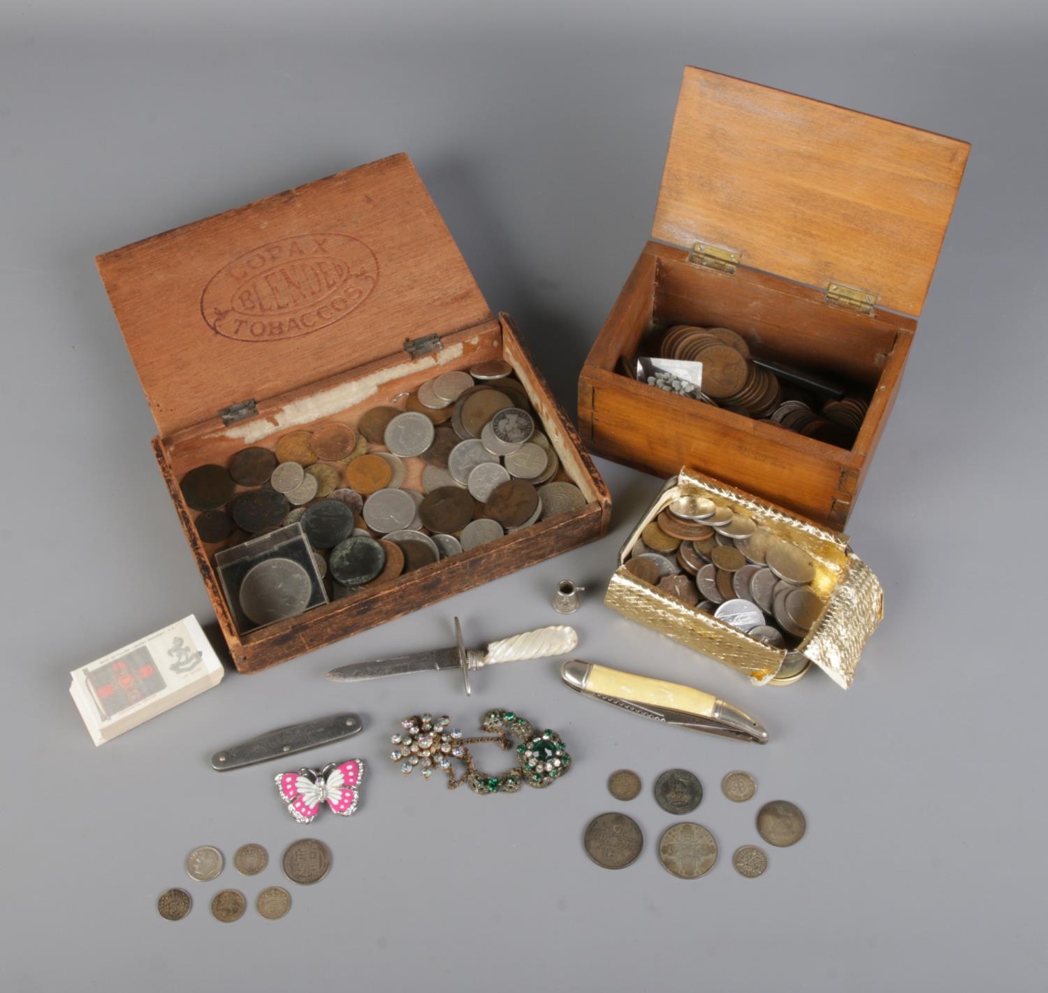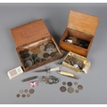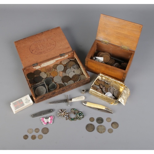 Two boxes of mostly assorted coins to include small quantity of British (pre-1920) and US silver, British post 1920 Pre-1947 half silver, mother of pearl handled letter opener, costume jewellery necklace, etc.