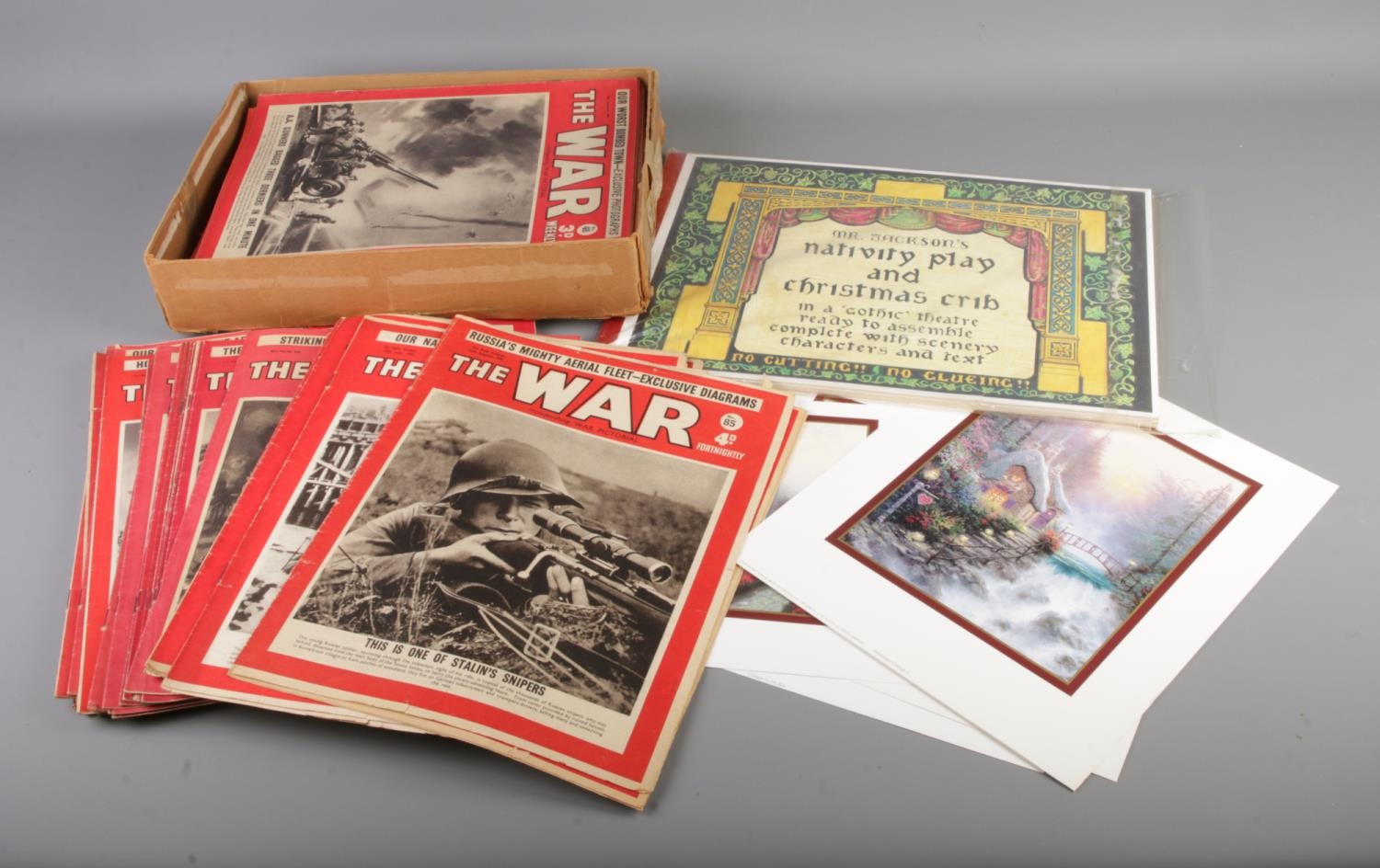 A large quantity of 'The War Fortnightly' with a selection of Thomas Kinkade prints and a Mr Jackson's nativity play and christmas crib