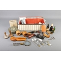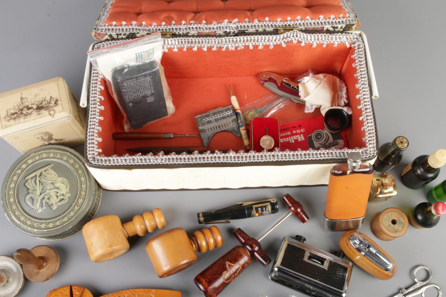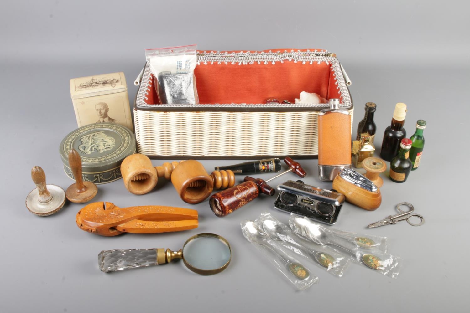 A sewing box filled with mixed collectables including wooden nutcrackers, corkscrews, tasco binocuars, miniature coronation souvenir book, Tetley teaspoons, hipflask, table lighter, magnifying glass etc