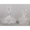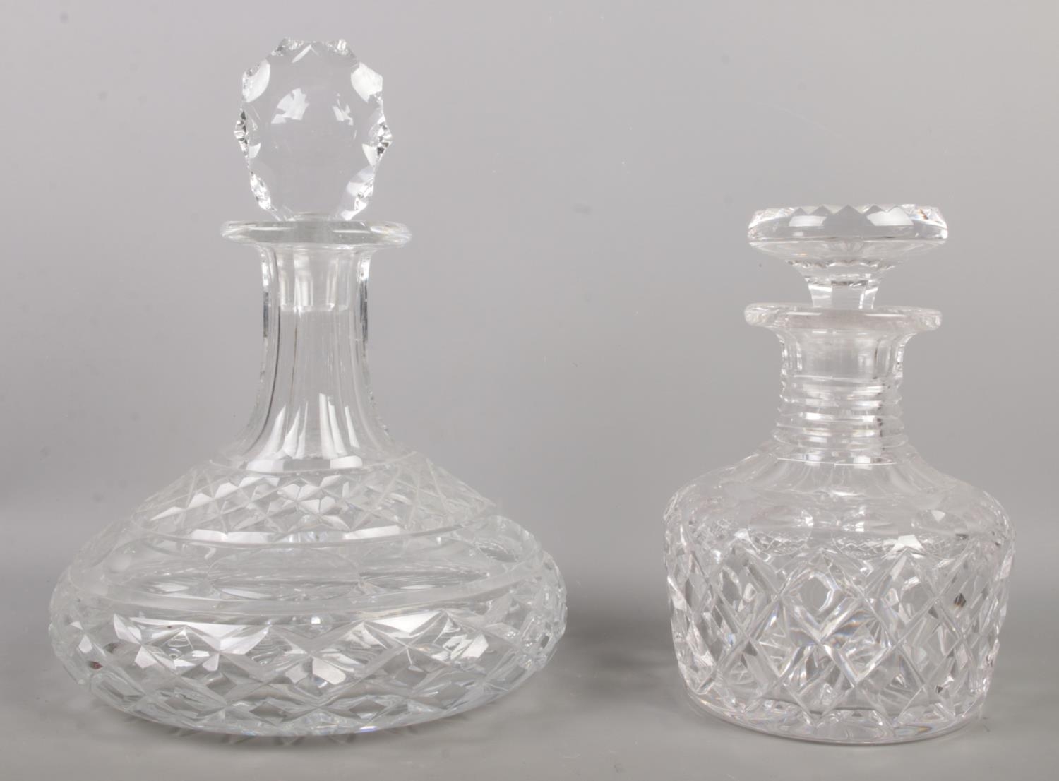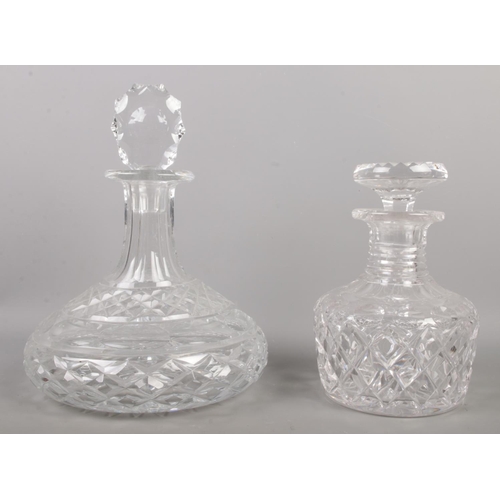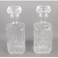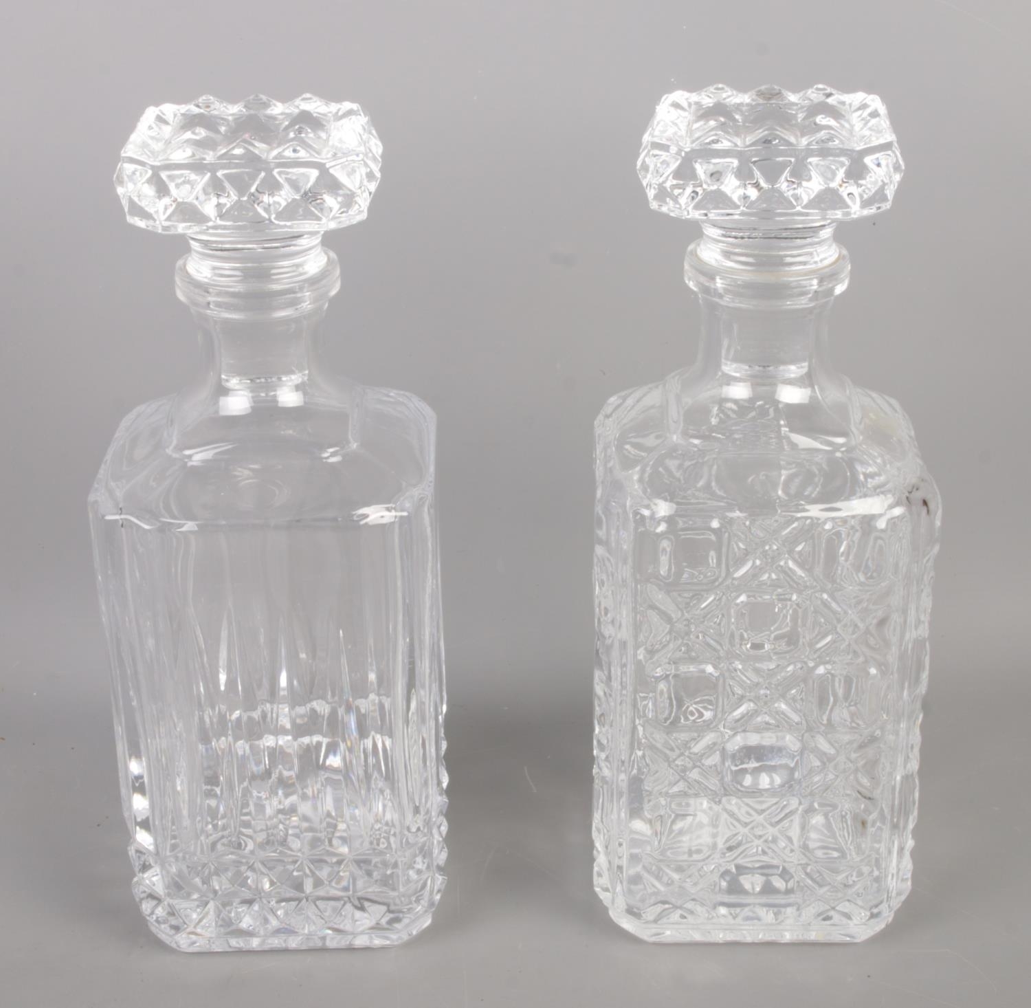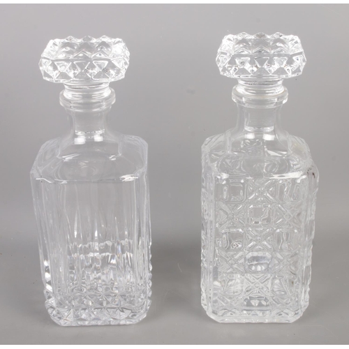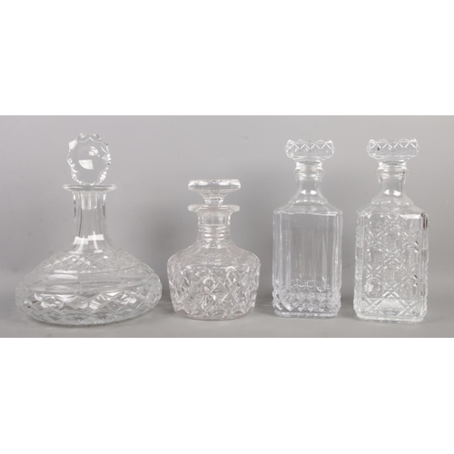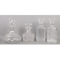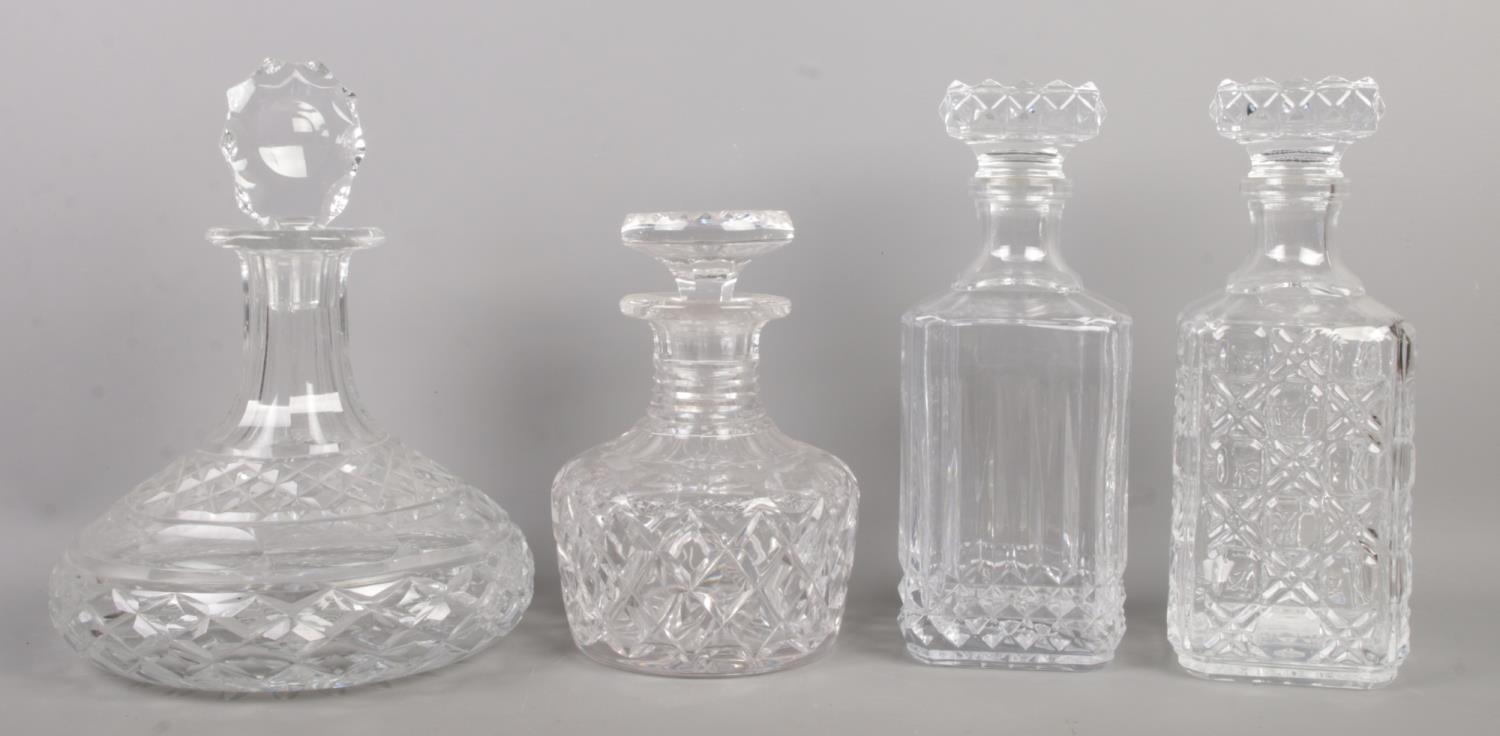 A collection of four spirit and wine decanters, including two cut crystal examples by Brierley and Stuart (both with acid-etched marks) and two pressed cut glass square decanters with star-cut bases.