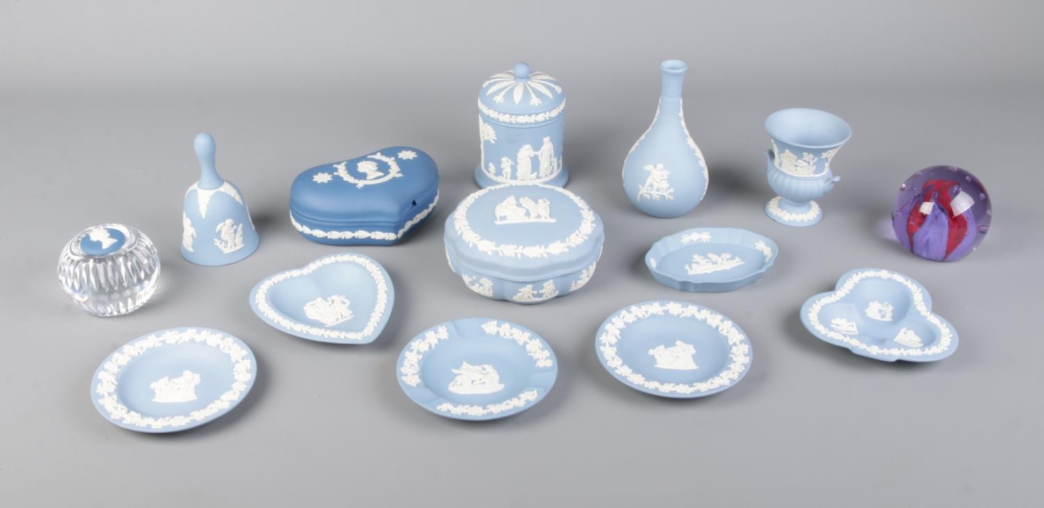 A quantity of mainly Wedgwood jasperware ceramics, to include lidded jar, bell, vase, trinket dish, ash tray and paperweight with jasperware plaque.
