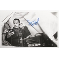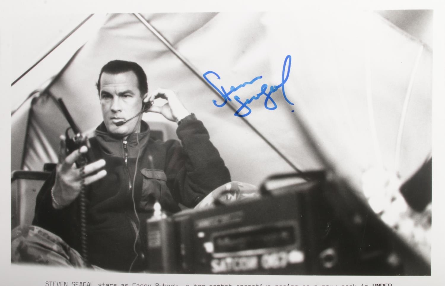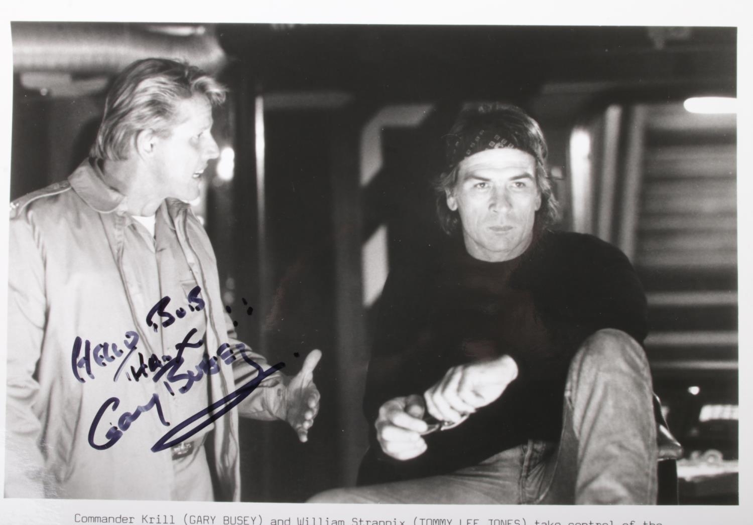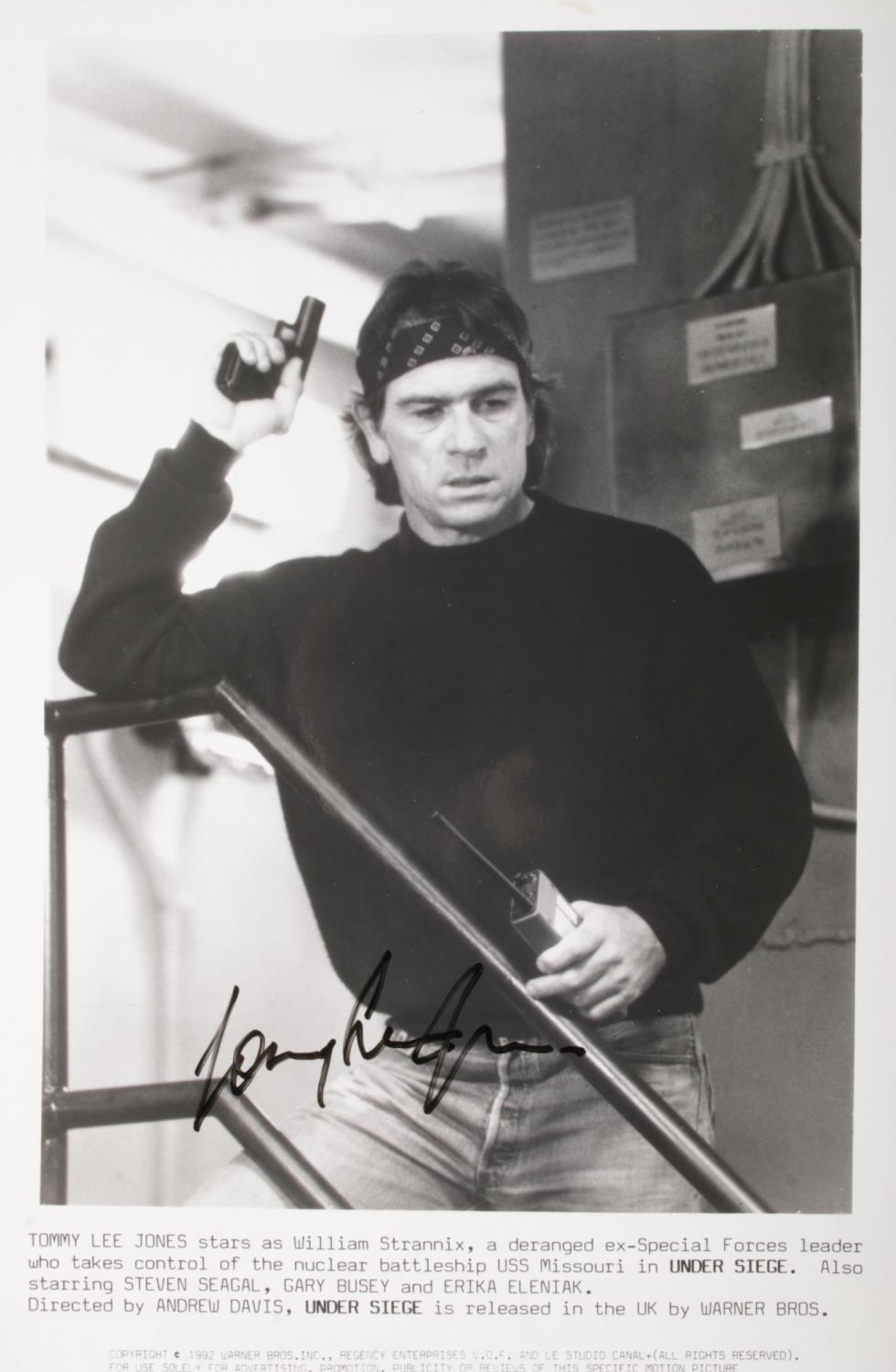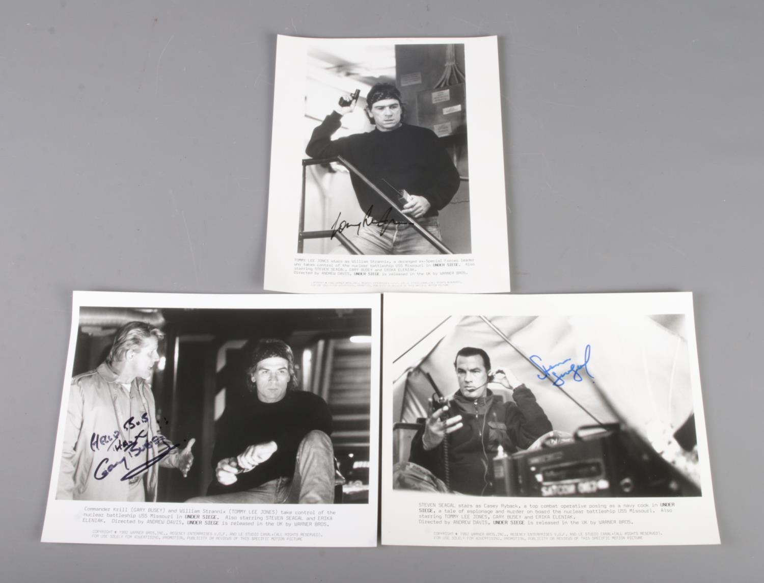 Three signed monochrome lobby cards for 'Under Siege' 1992. Signed by actors Gary Busey, Steven Segal and Tommy Lee Jones.