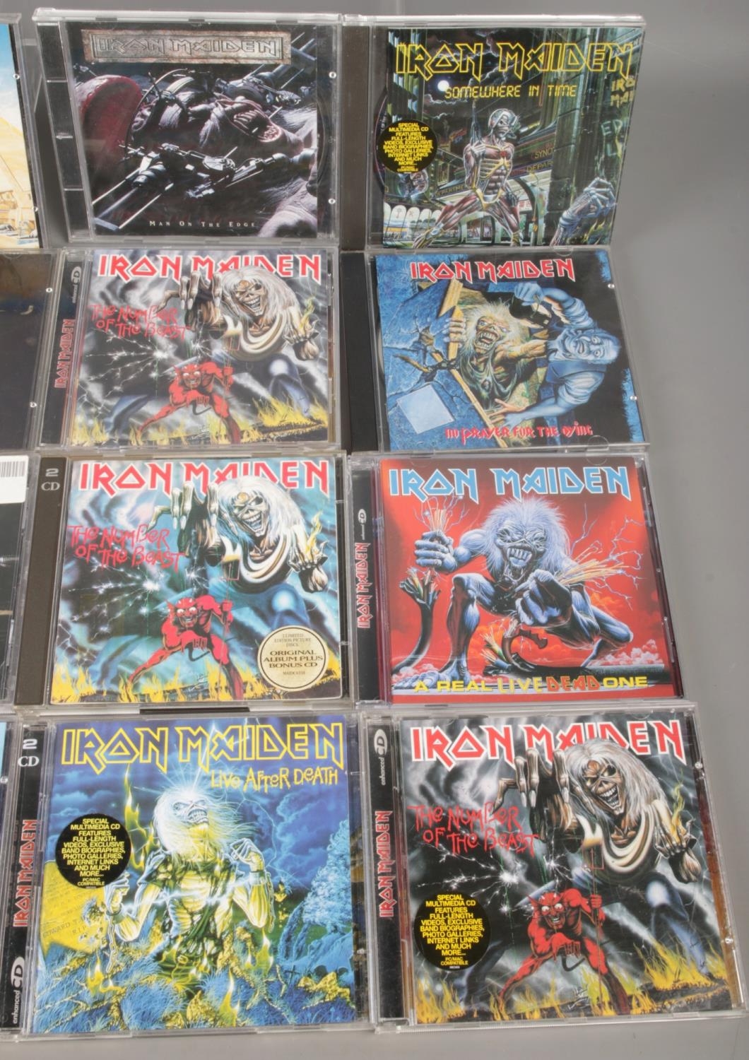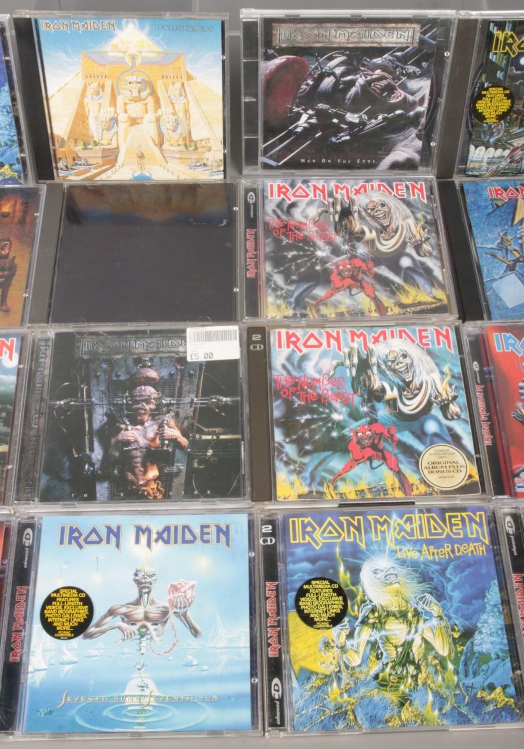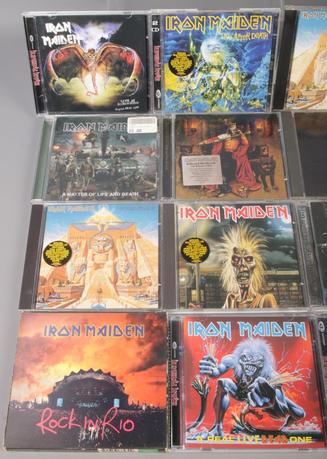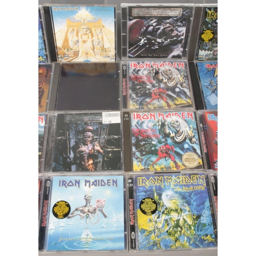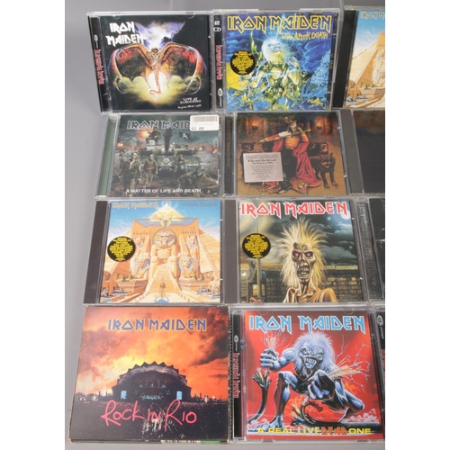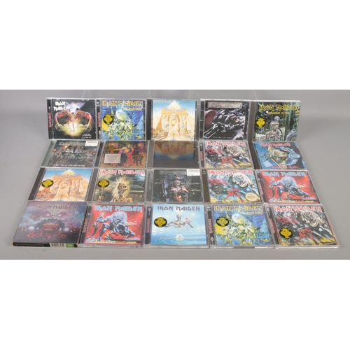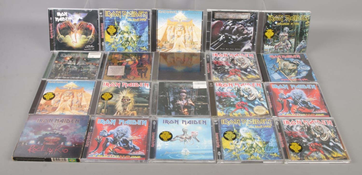 A collection of twenty Iron Maiden CDs, titles including "Live at Donington", "Powerslave", "Iron Maiden", "Live After Death", "Man on the Edge", "No Prayer for the Dying", "Rock in Rio", "A Real Live Dead One" etc.