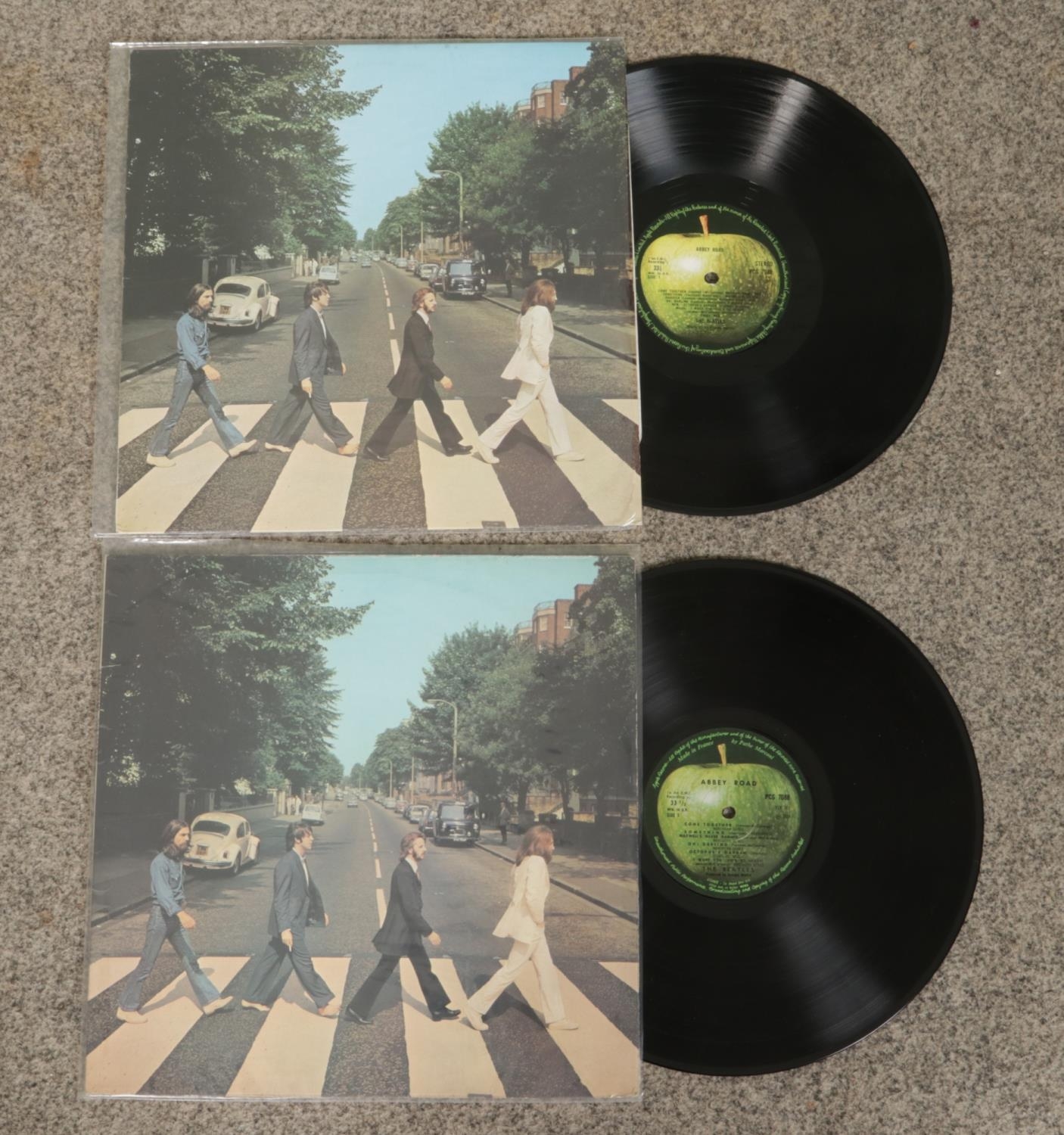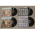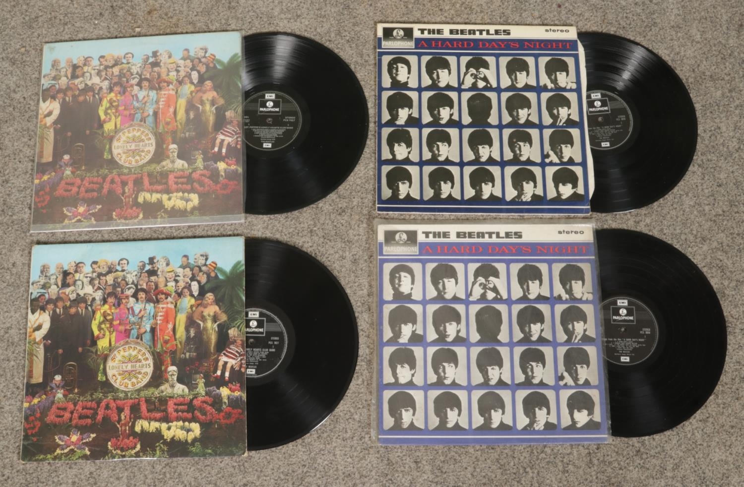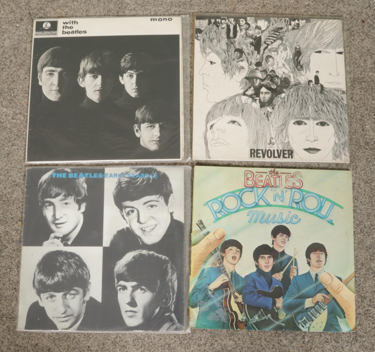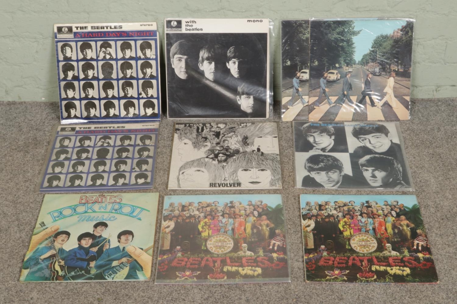 A collection of ten The Beatles vinyl records, including PCS 7088 Abbey Road (2), PCS 7027 Sgt. Pepper's Lonely Hearts Club Band (2), PCS 3058 A Hard Day's Night (2), phx 1005 Early Years 2, PCS 7191/7192 Rock 'N' Roll Music, PCS 7009 Revolver, PCM 1206 With The Beatles.