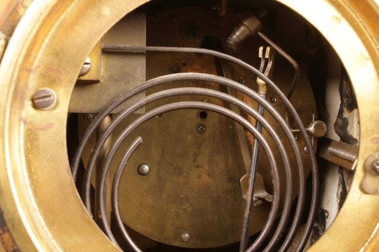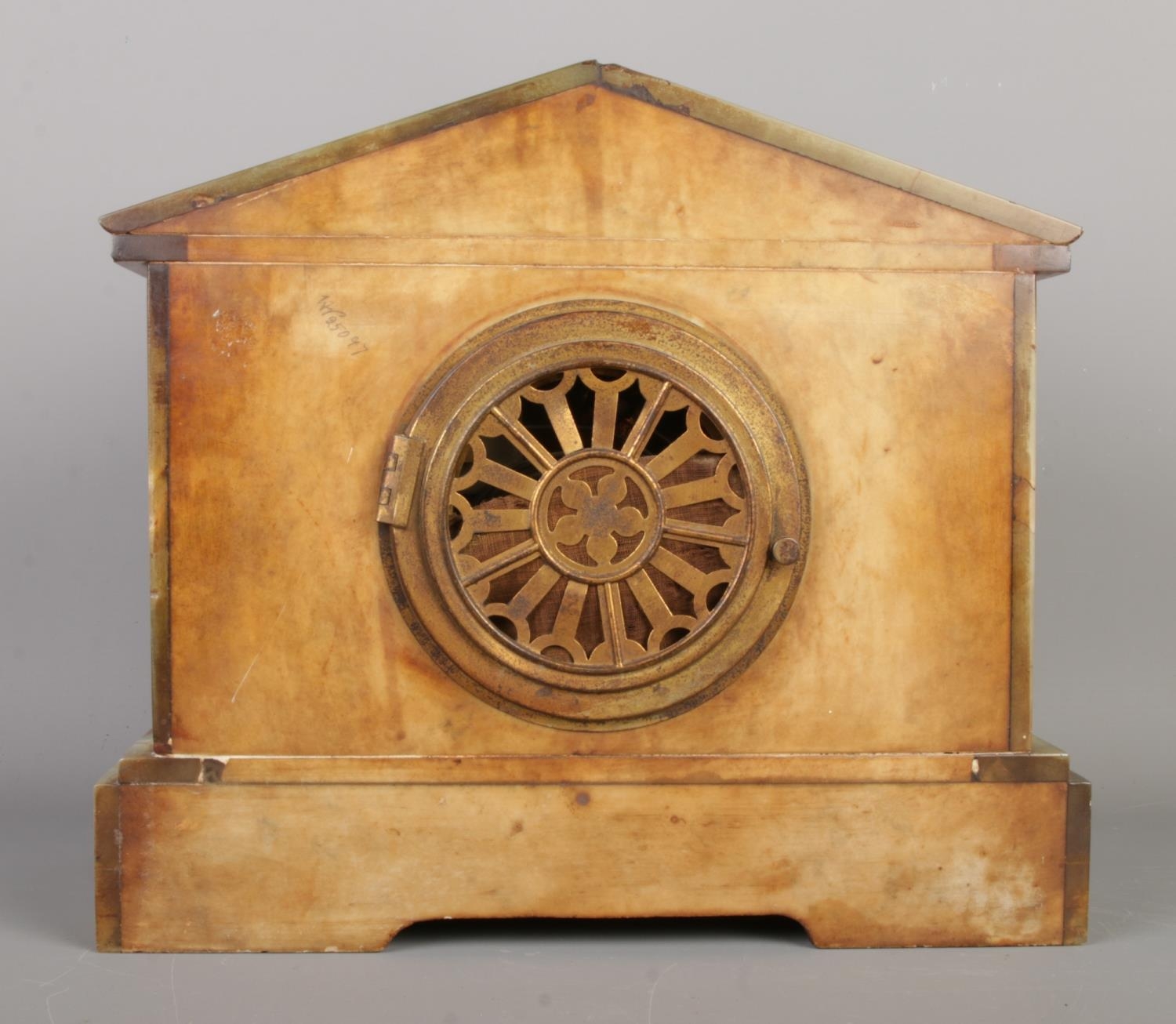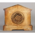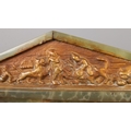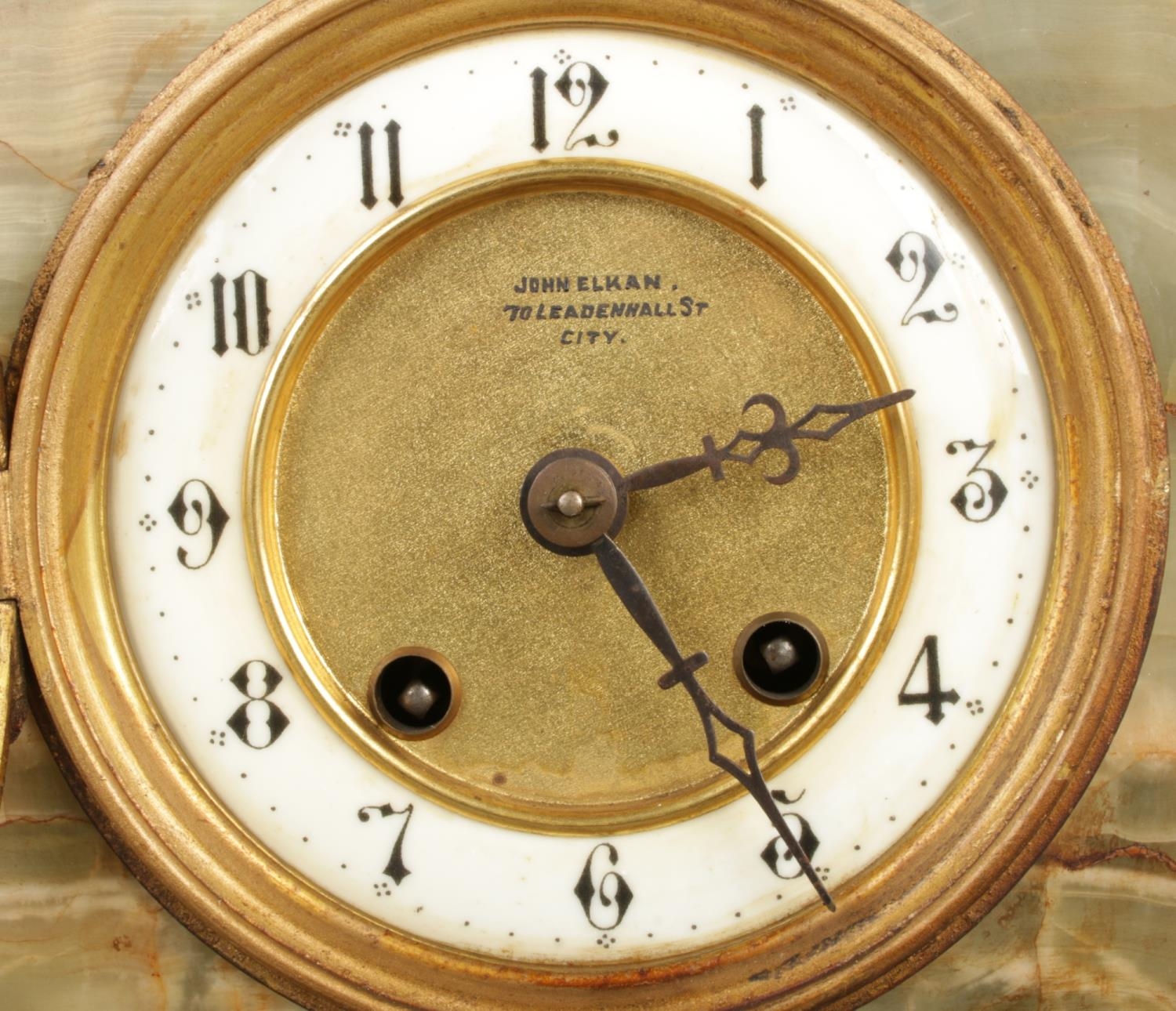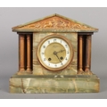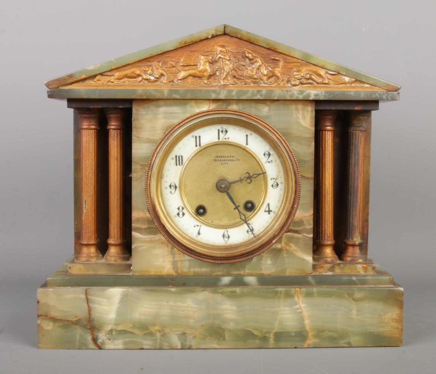 An early 20th century German green onyx mantel clock by HAC (Hamburg American Clock Company), of architectural design featuring a relief battle frieze to the pediment. Arabic numeral dial marked "John Elkan", pendulum present, no key, size W30 x D13 x H26cm.