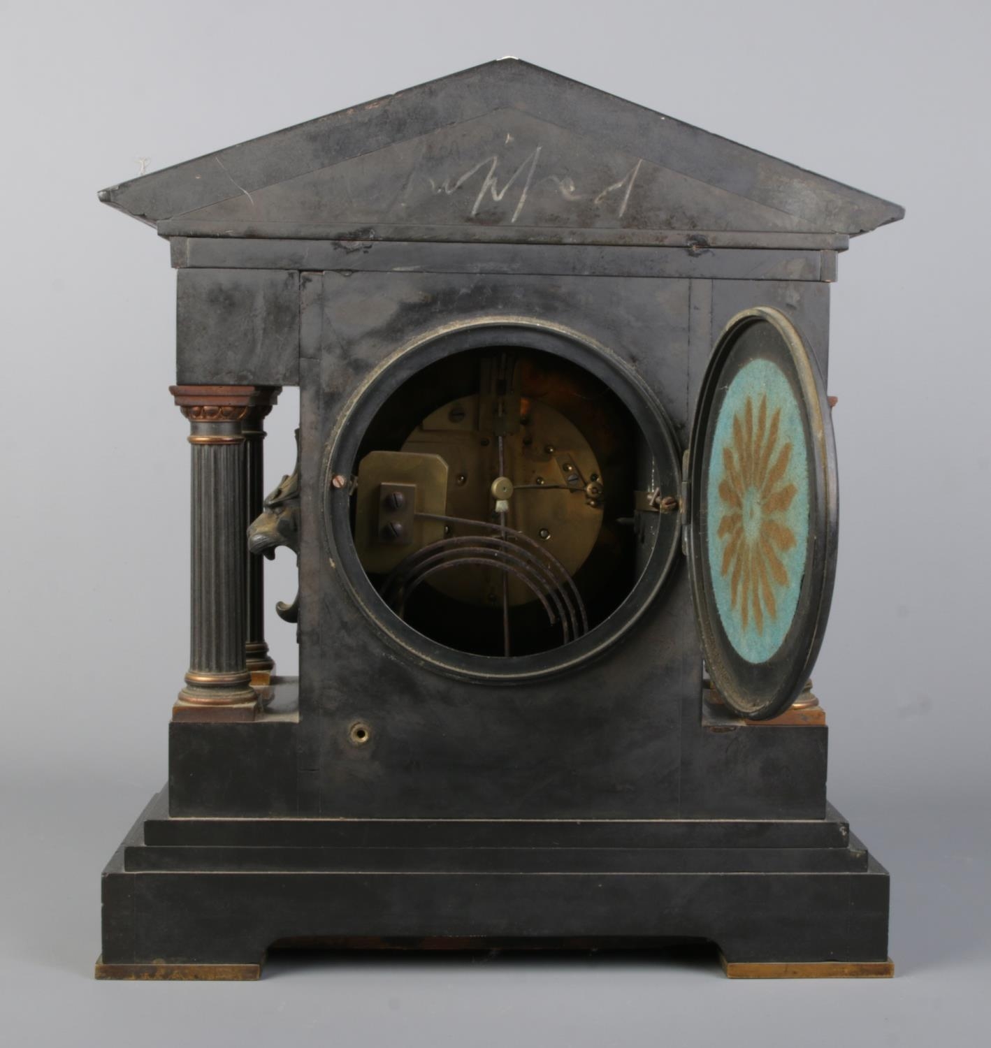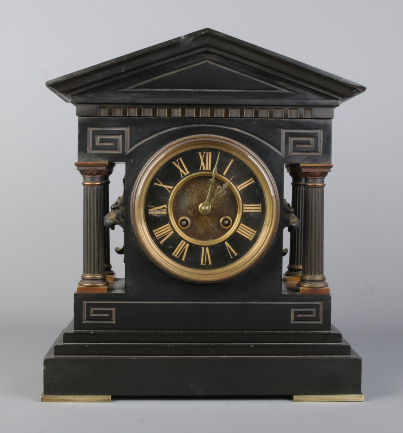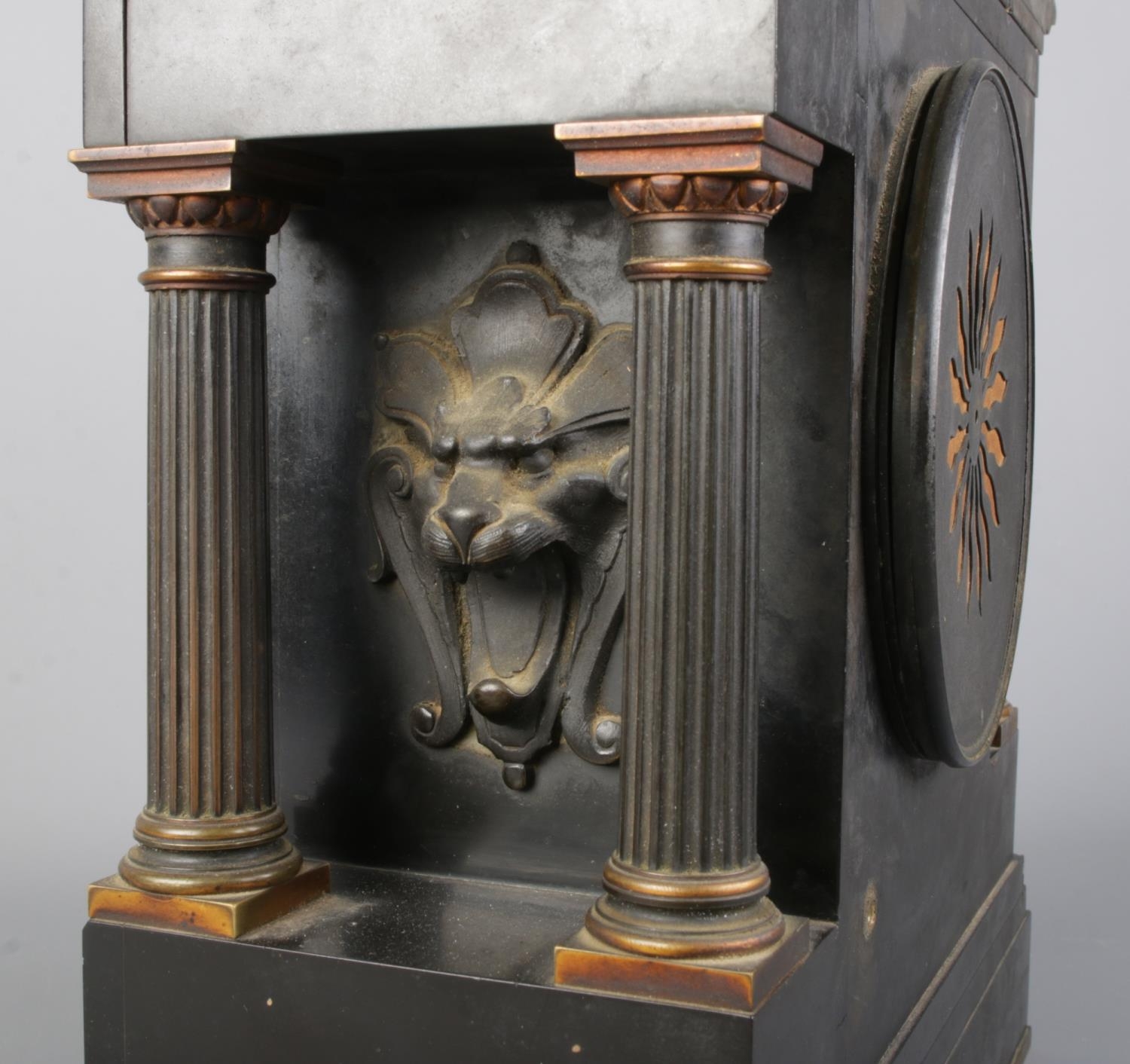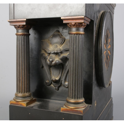 An antique slate clock featuring an architectural design with lion masks, fluted columns, black metal dial ring and Roman numerals. Size: W 32 × D 15 × H 36 cm.