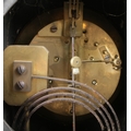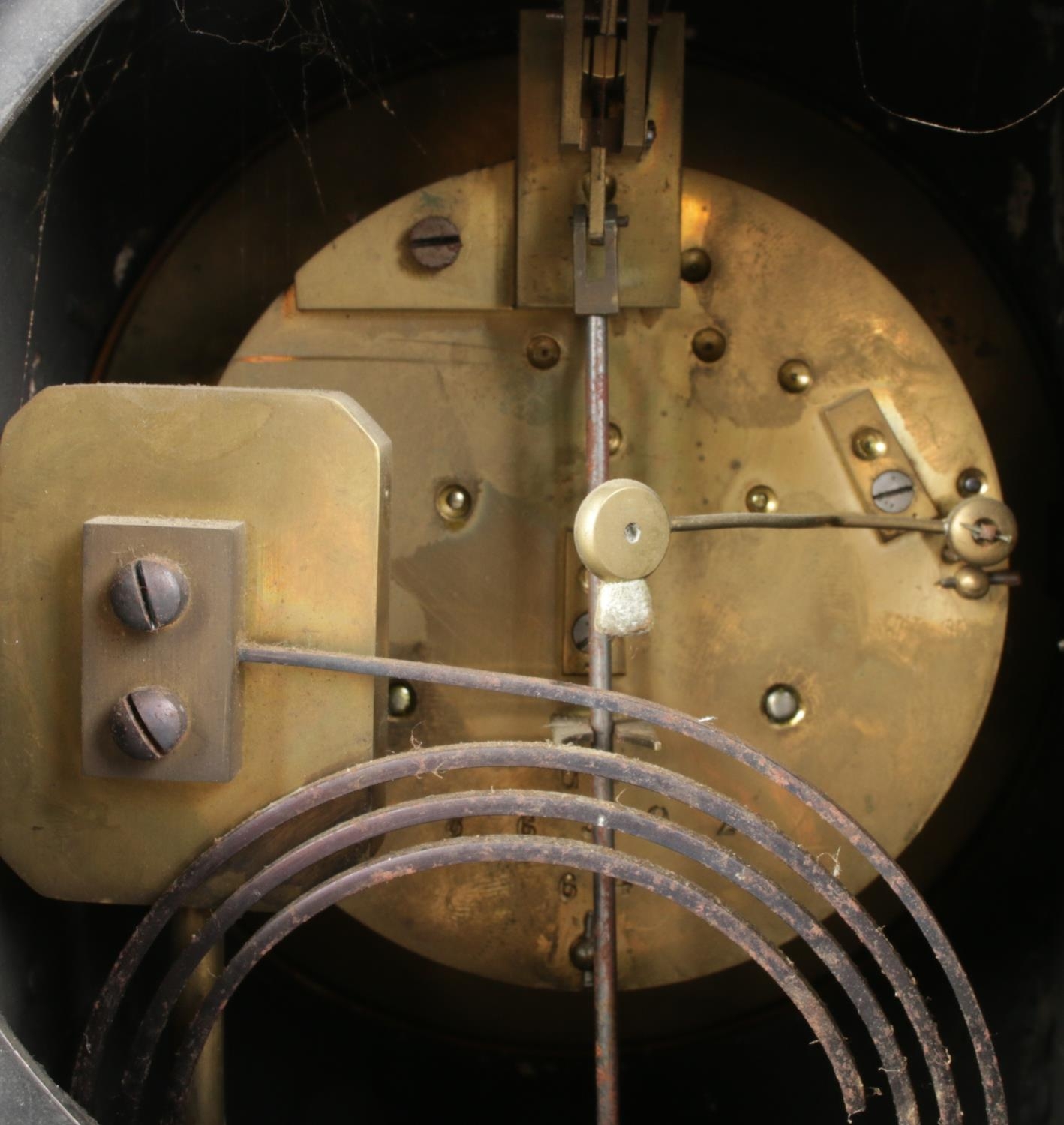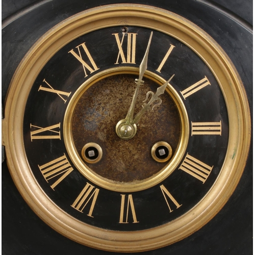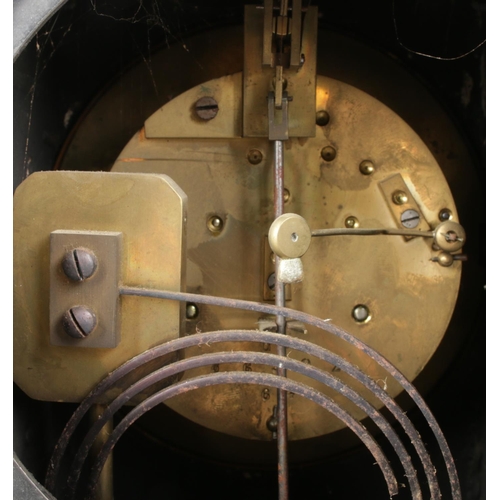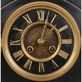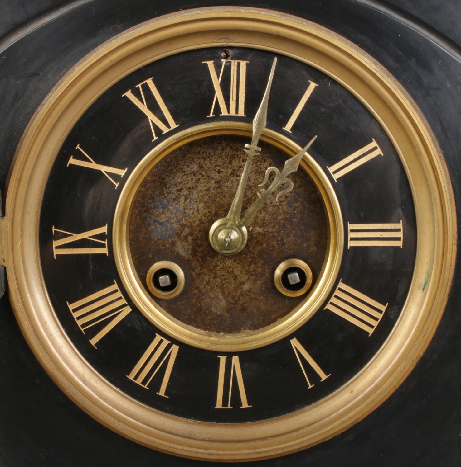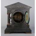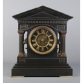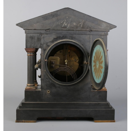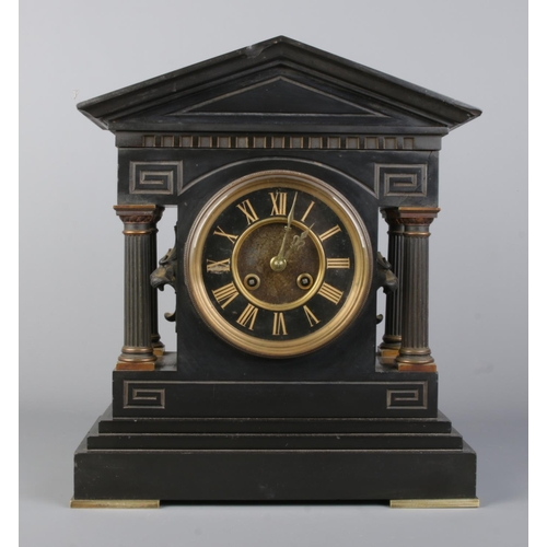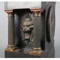 An antique slate clock featuring an architectural design with lion masks, fluted columns, black metal dial ring and Roman numerals. Size: W 32 × D 15 × H 36 cm.