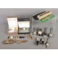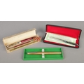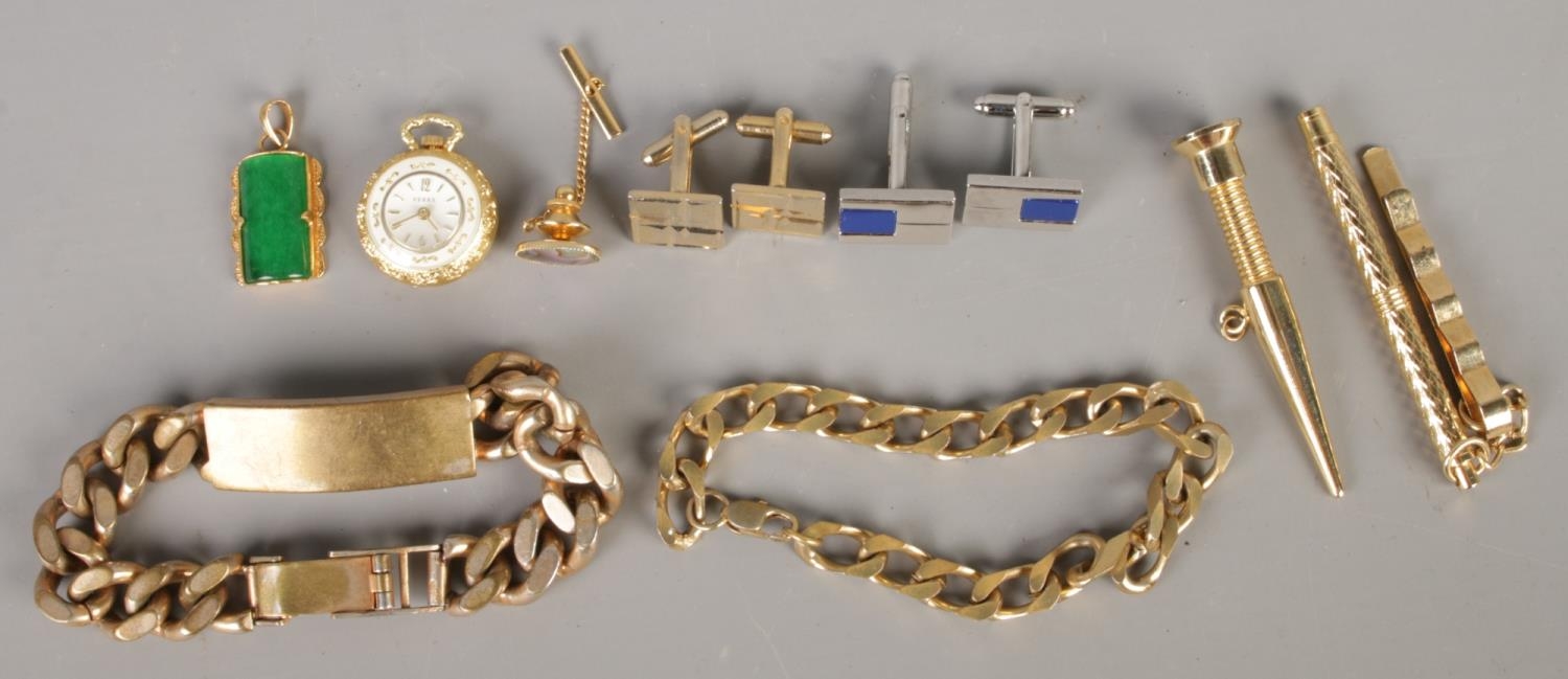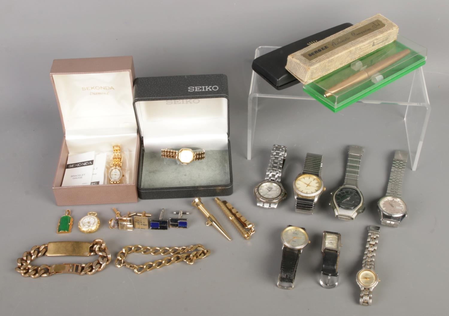 A group of collectables, including a wristwatch collection, three boxed vintage pens and assorted gold-plated jewellery, including a 18ct plated jade pendant and Ferex fob watch etc.