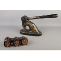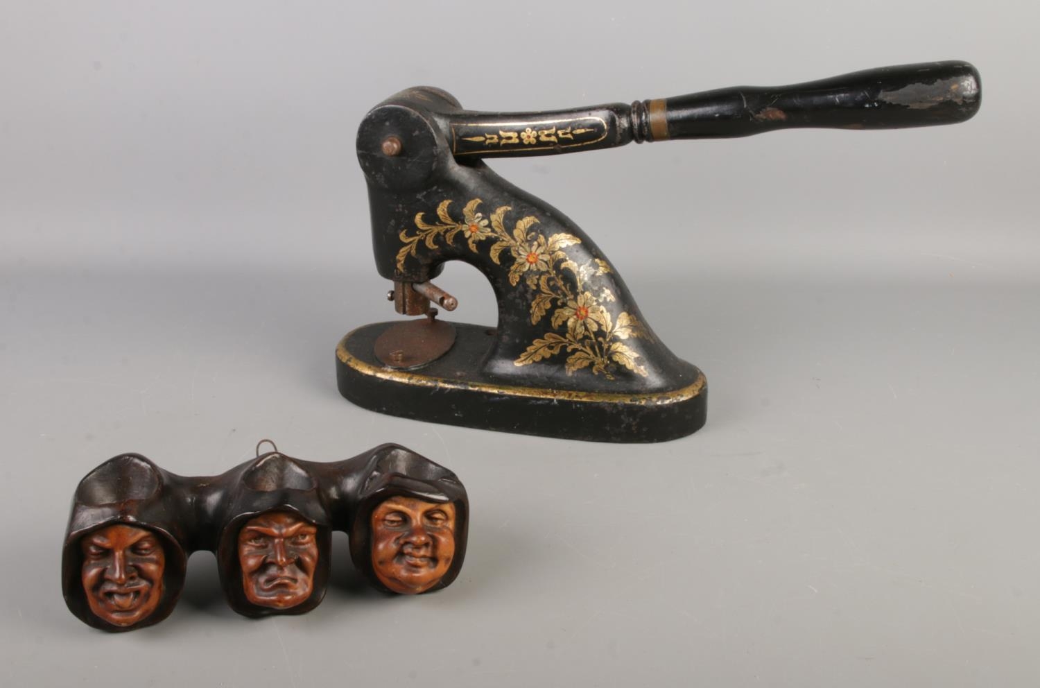A wall mounted pipe rack in the form of three monk heads with a cast iron seal press with gilt detailing.