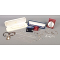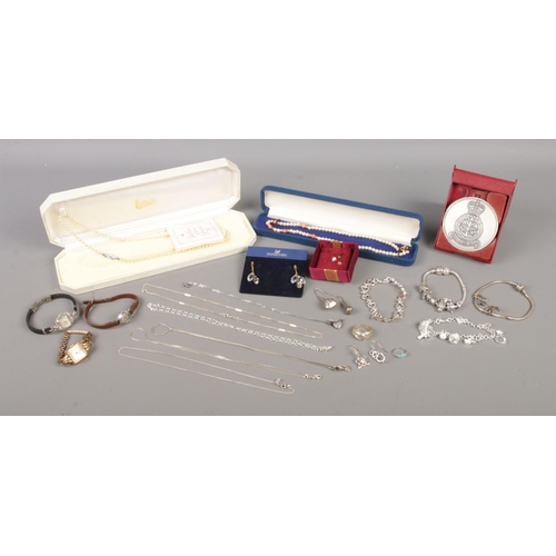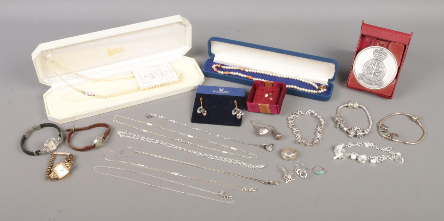 A collection of mainly costume jewellery, to include Lotus pearl necklace, Swarovski droplet earrings, charm bracelets, ladies Moron wristwatch on rolled gold strap and a 1990 British Forces Cyprus Inter Service Rugby medal.