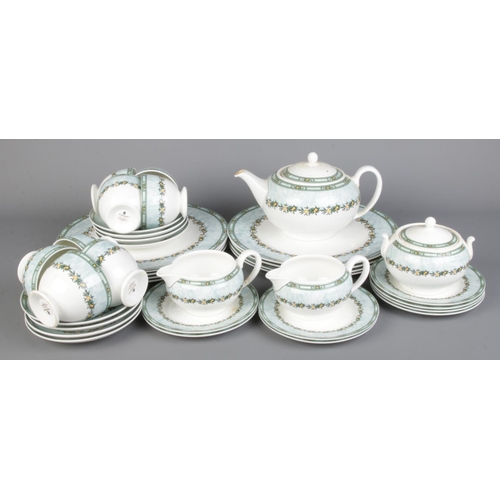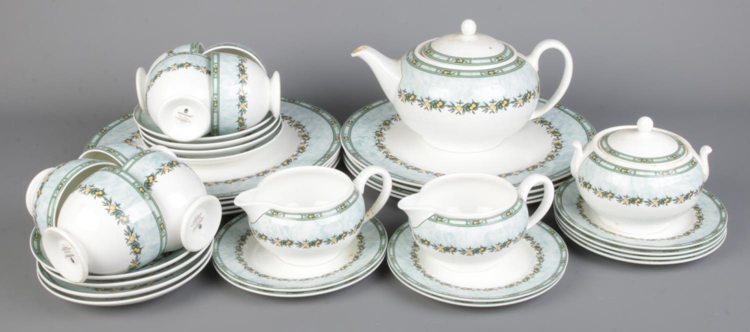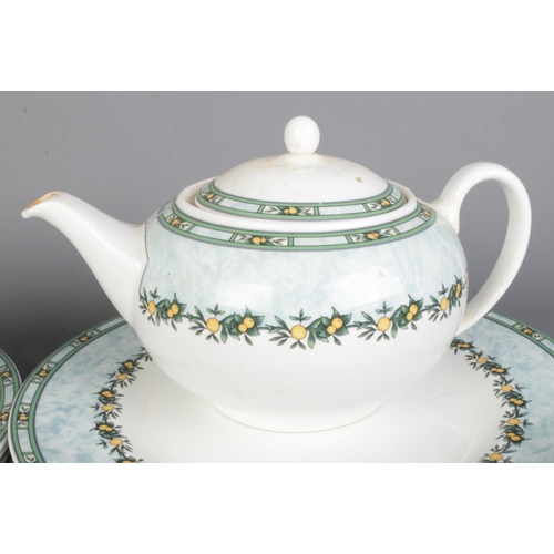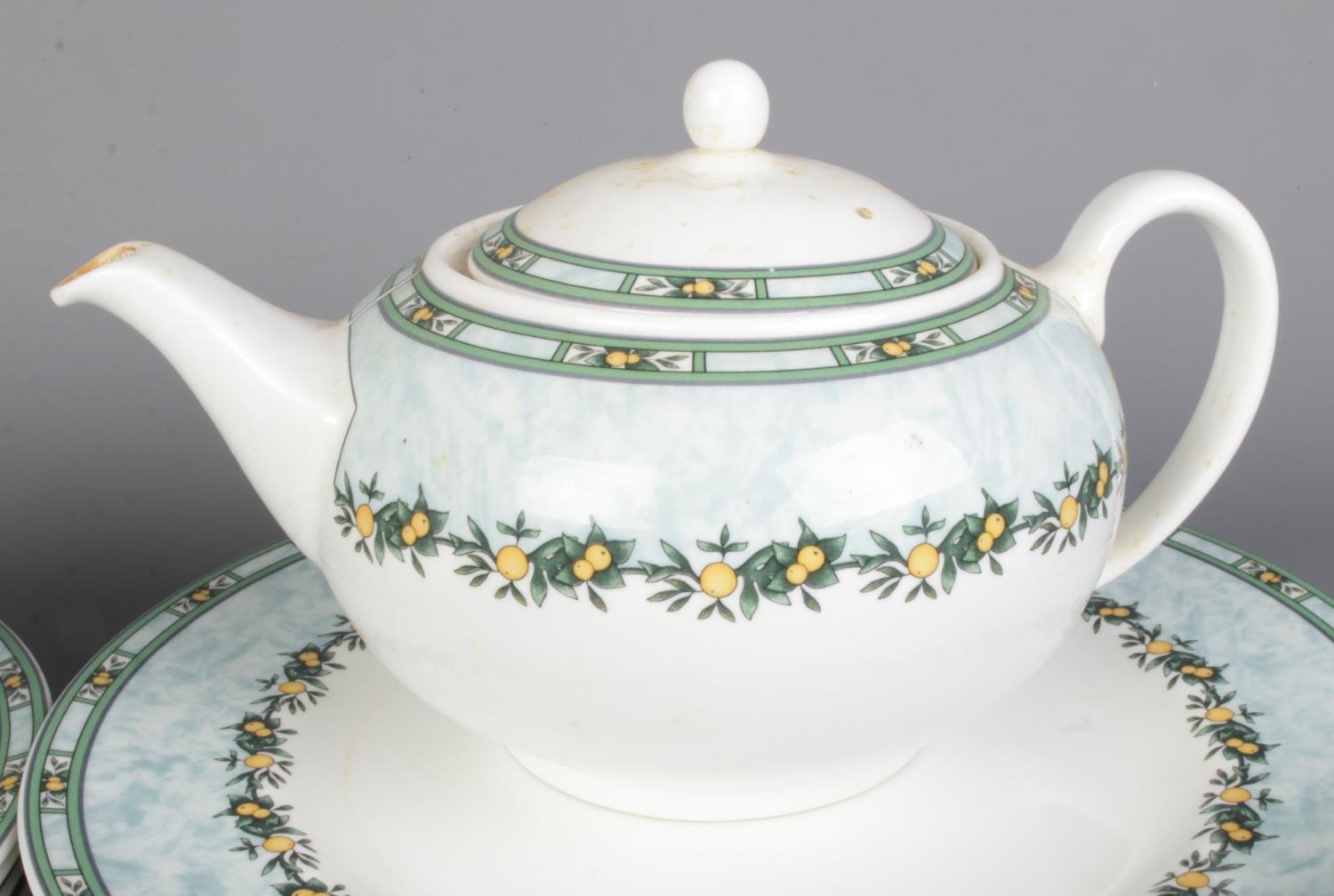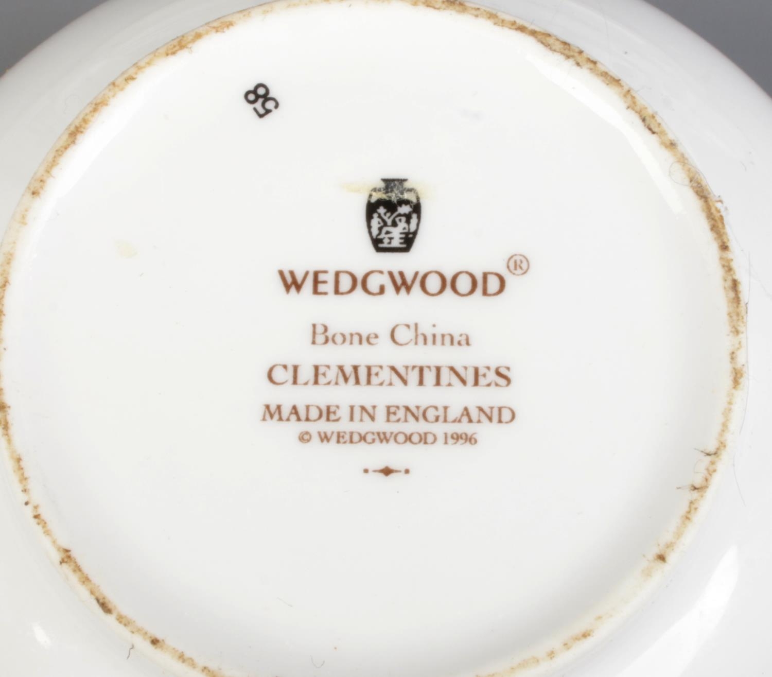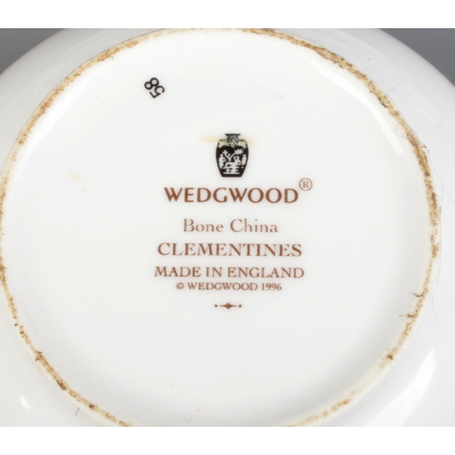 A collection of Wedgwood "Clementines" pattern tea ware, comprising 36 pieces including teapot, milk jugs, sugar bowl, eight cups & saucers and large dinner plates.