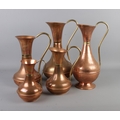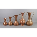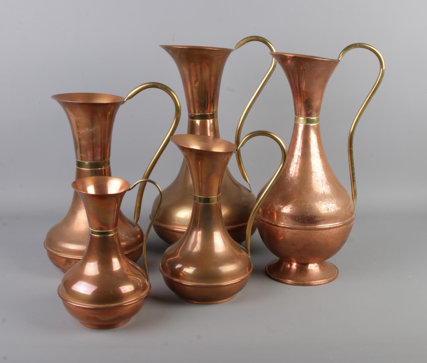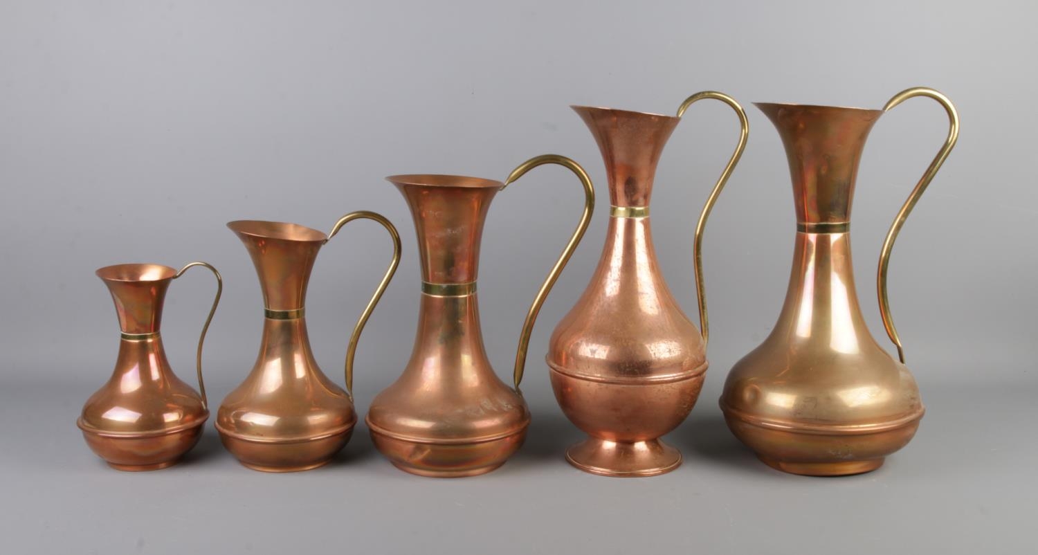 A set of five graduated copper jugs with brass handles